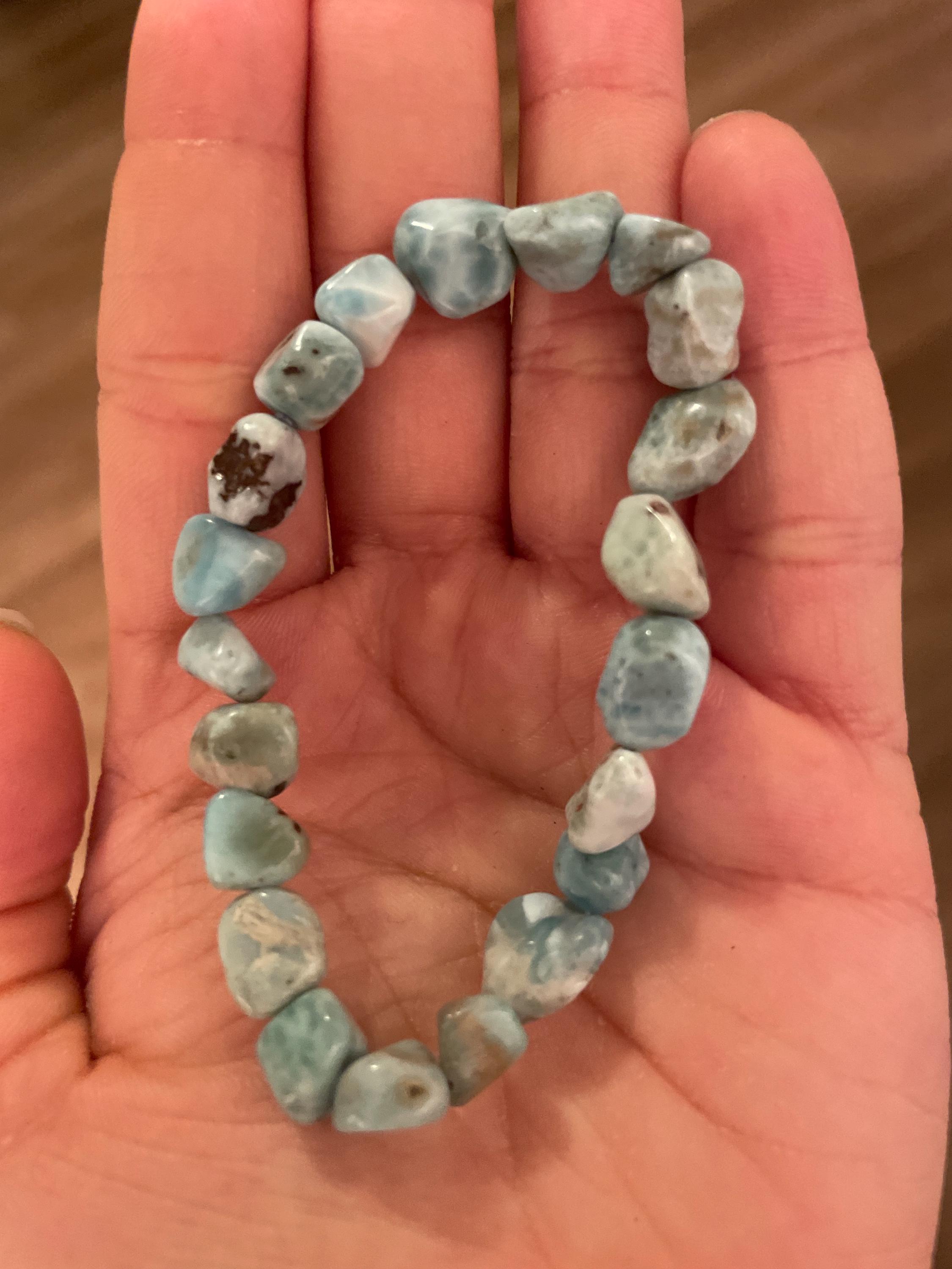 A beautiful bracelet crafted from Larimar tumbled stones. 6-8 mm thick nuggets on a stretchable bracelet, fits most wrists. About 7.5" in size. Great for meditation, crystal healing, Reiki or simply wearing!