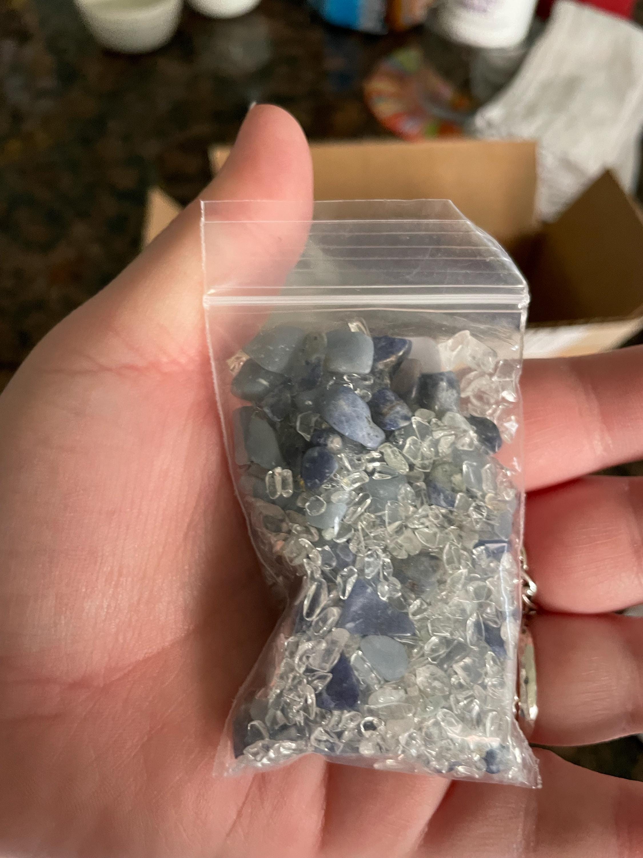 Beautiful Positive Energy Crystal Chip mixture consisting of Angelite, Clear Quartz, and Sodalite Chips. Assorted sizes, mostly in the range of 3 - 10 mm. They are great not just for decoration but for all types of arts and crafts projects, etc. Semi rough tumbled mini chip stones, undrilled.