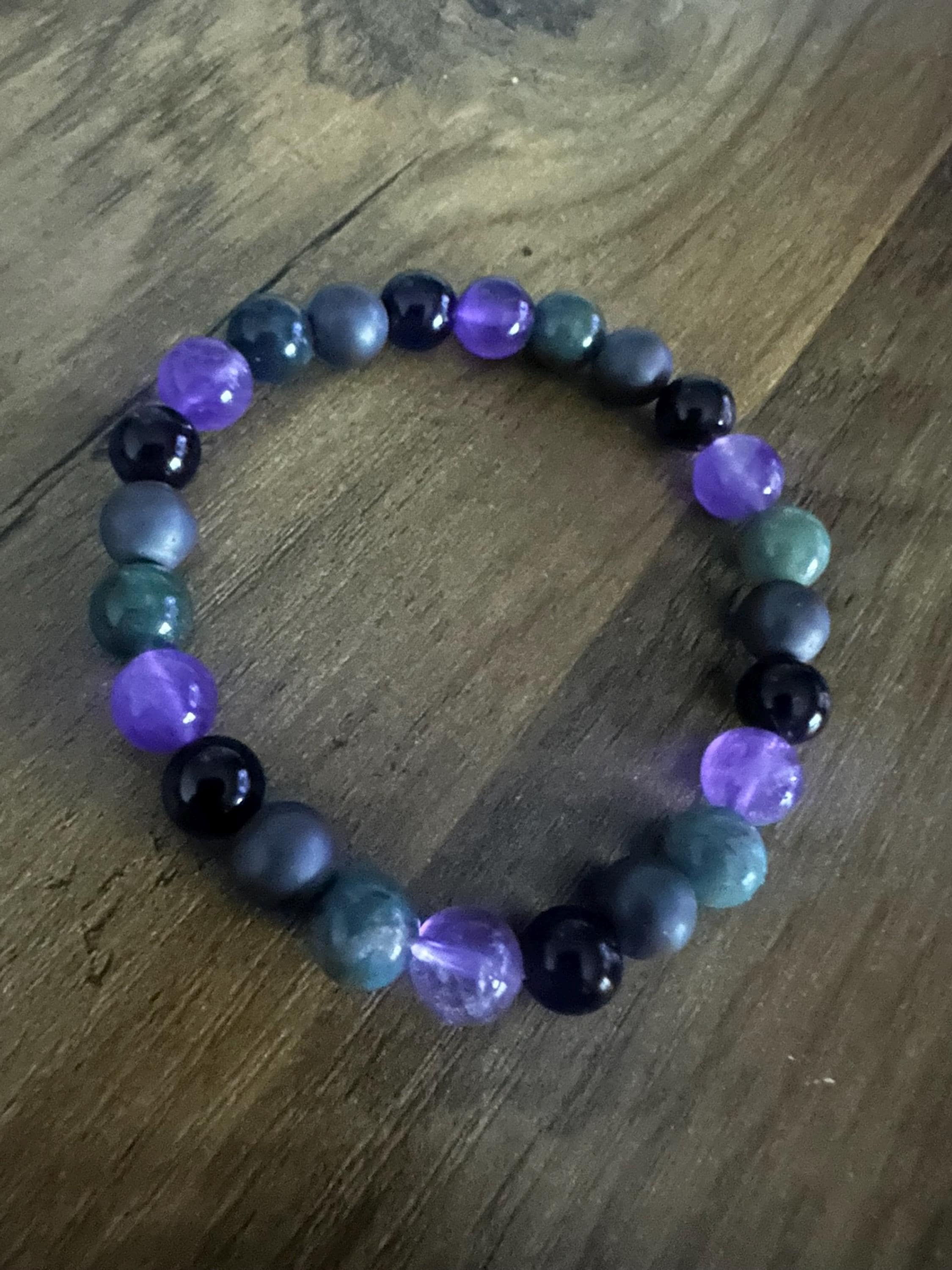 A beautiful bracelet hand crafted from Amethyst, Black Tourmaline, Hematite (Matte) and Moss Agate beads. 8 mm thick beads on a stretchable bracelet, fits most wrists. About 7.5" in size. This carefully selected combination of four powerful crystals may help you feel grounded, rational and level headed.