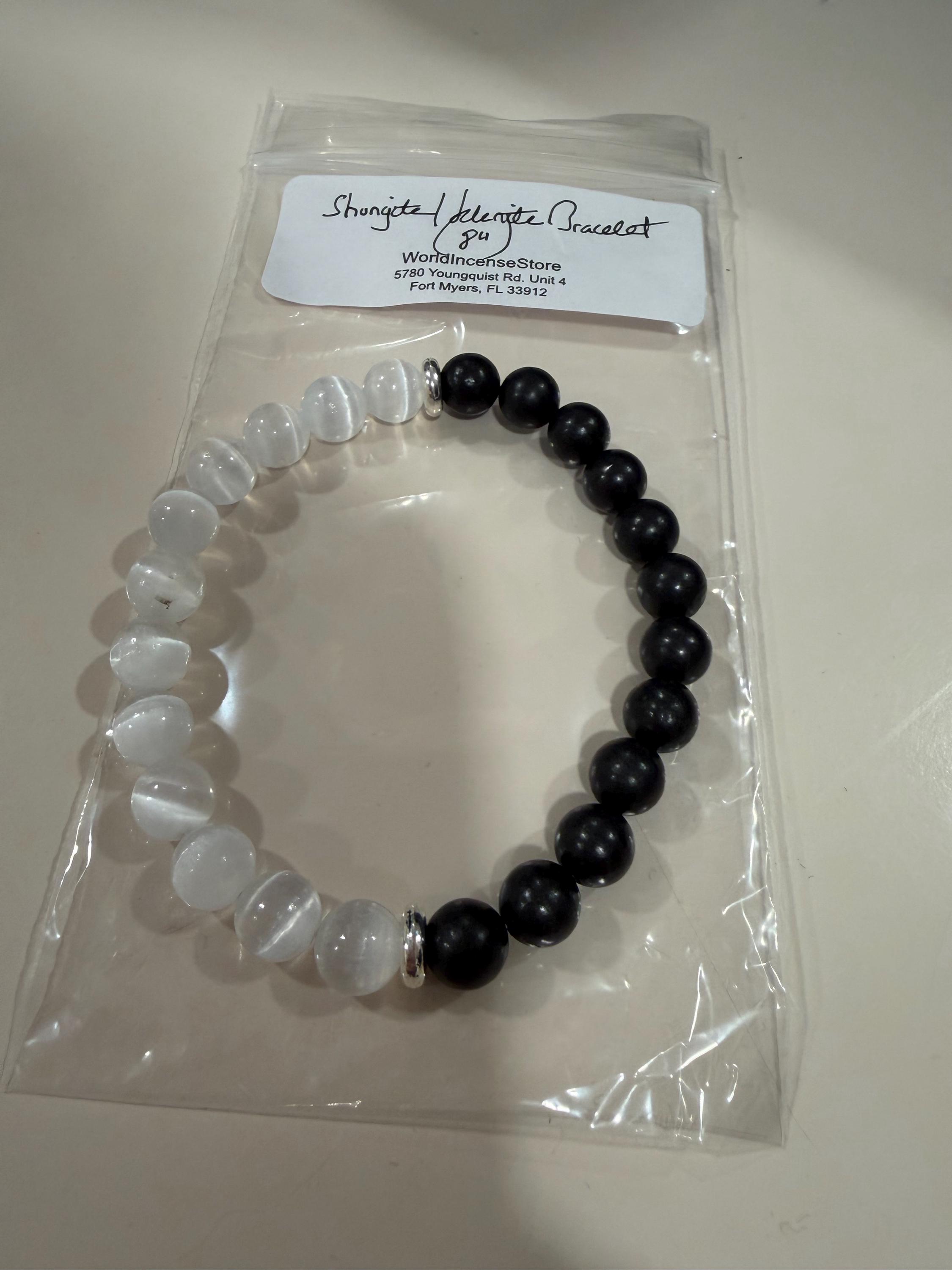 A beautiful combination of synergy between two powerful Gemstones! This bracelet is crafted from genuine polished Shungite & Selenite beads. 8 mm thick beads on a stretchable bracelet, fits most wrists. Choose between 2 sizes, approximately 7.25" and 8" in size. Great for meditation, crystal healing, EMF Protection and simply wearing!