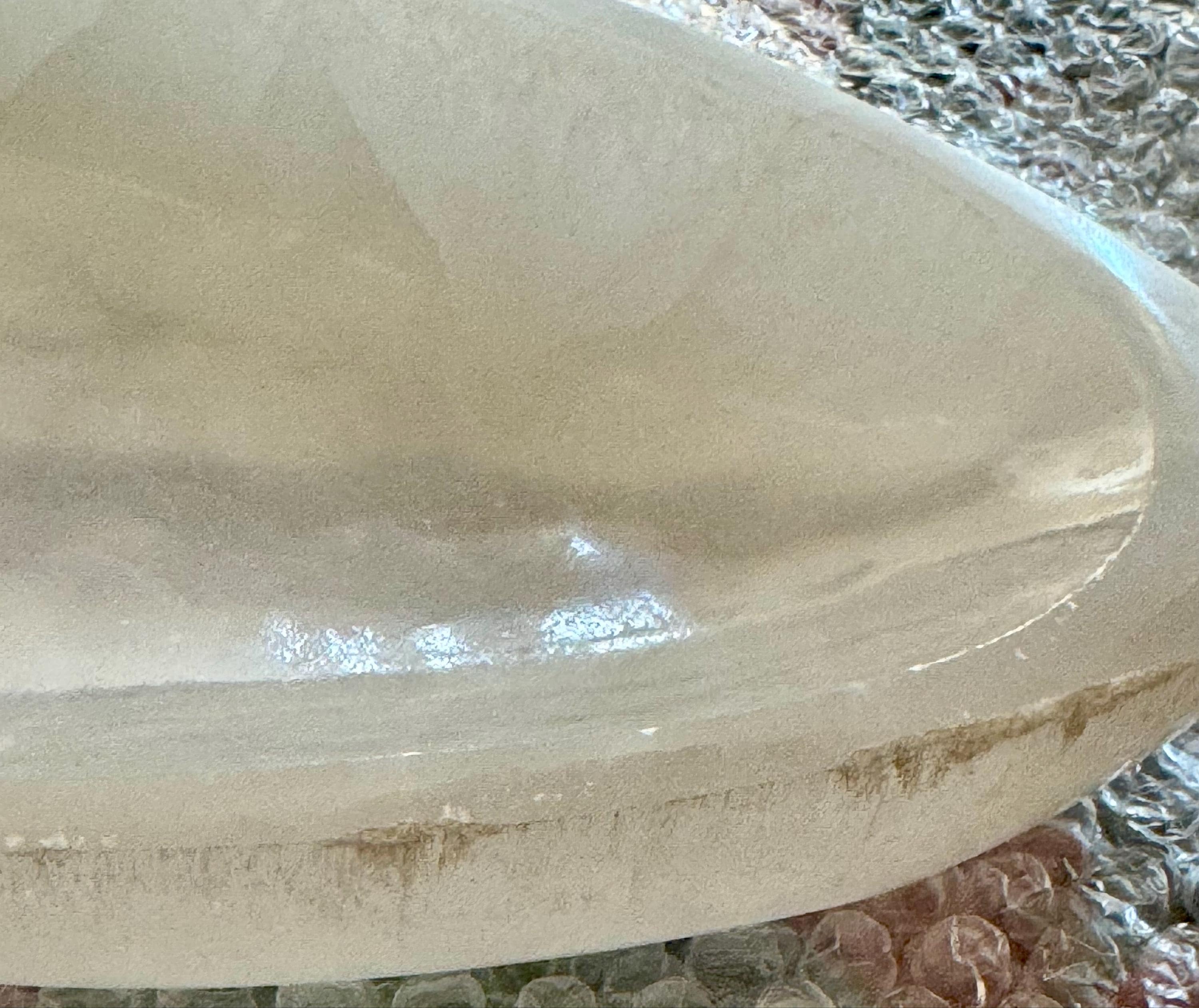 Some notes on the material: This fibrous crystal has natural fissures and fibers running through it - it can look like 'veins' running through the material. This can give the appearance of damage - it is not - it is very normal for selenite. Due to its soft nature the outer rims of bowls can also show these 'cracks' or 'veins' and the edge can also look a little uneven with minor 'nicks' and 'scratches' - again it is normal for selenite. Selenite can have minor inclusions so the odd speck, dark mark or minor discoloration may be visible. Be aware that selenite should be kept away from water so do not use water to cleanse the bowl.