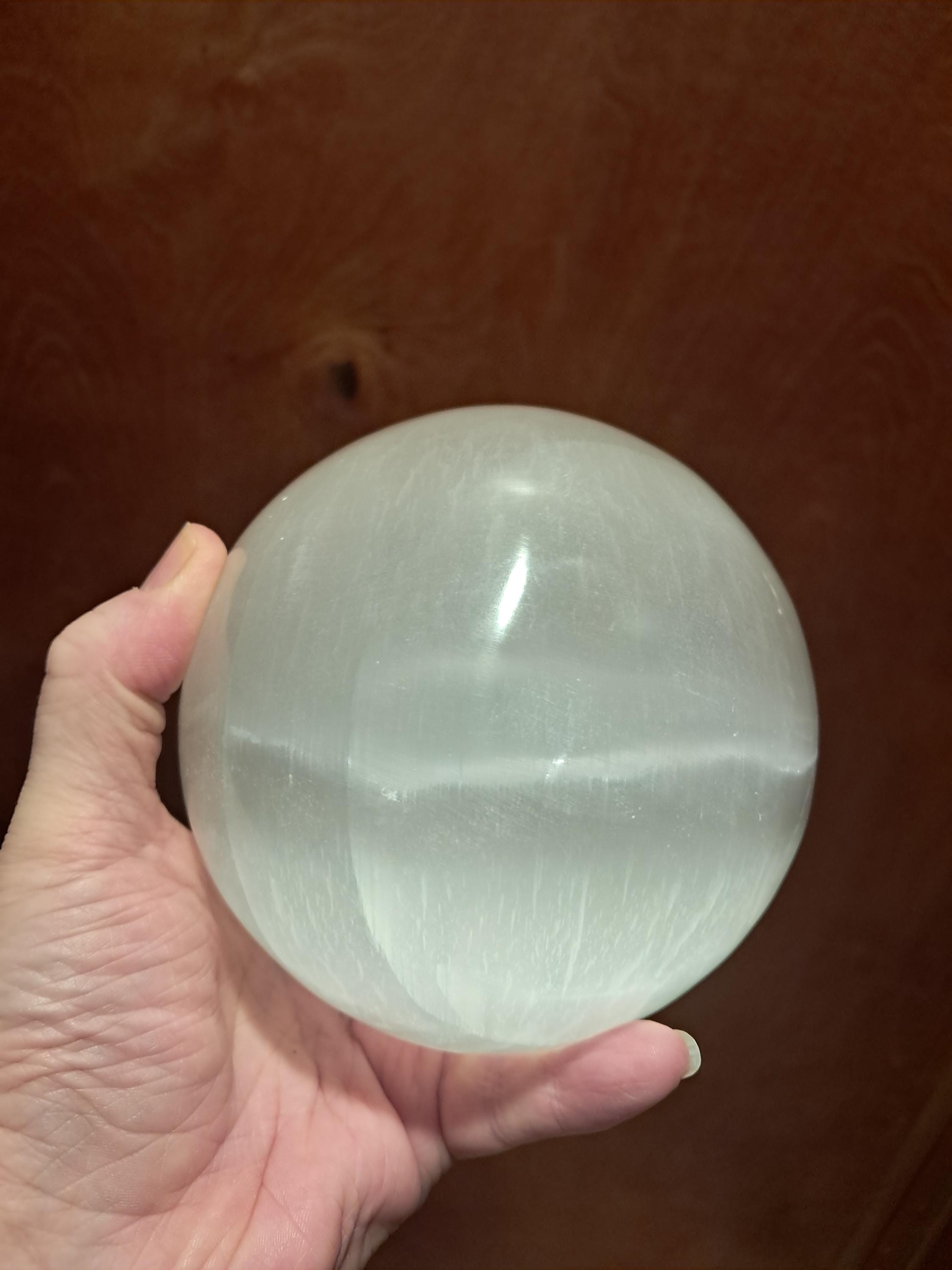 Stunning JUMBO Polished Selenite Crystal Spheres. Each Sphere is approximately 5" wide +/- and comes with a small plastic display stand measuring about 2.25" across. Beautiful for Home Decor at an unbeatable value.