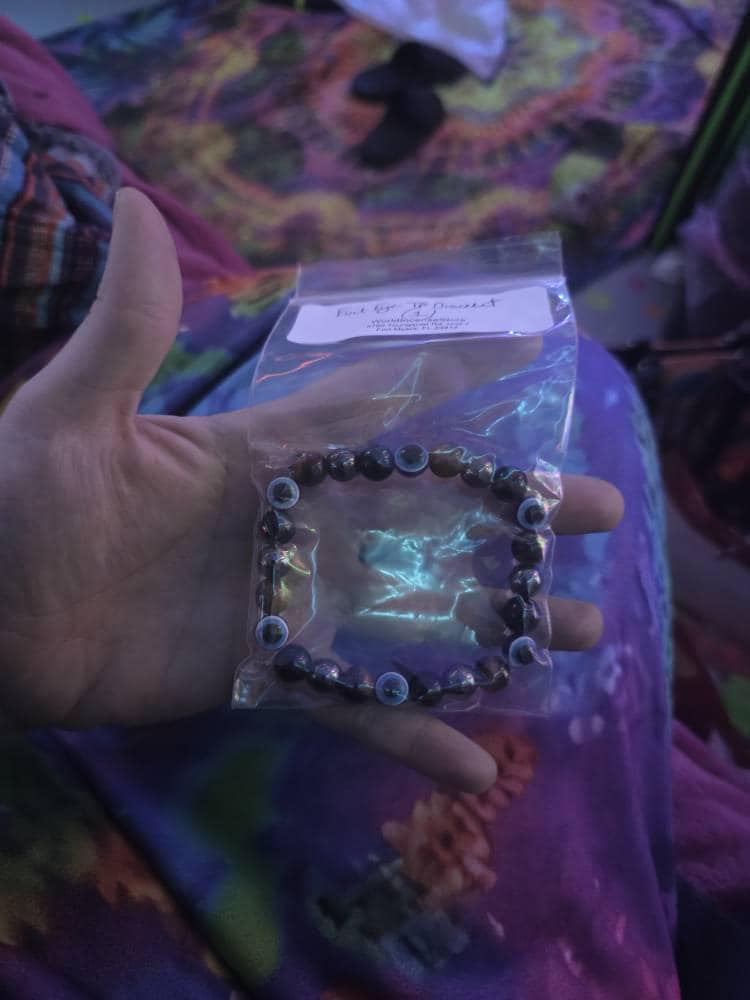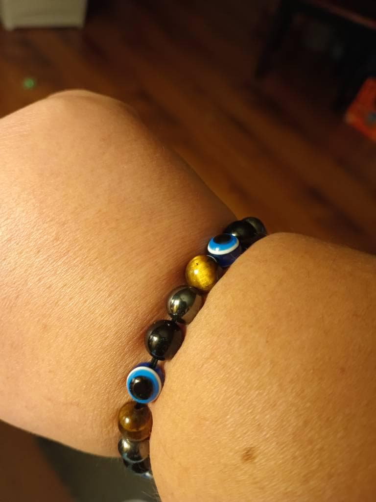 Beautiful Bracelet hand crafted from Gold Tiger Eye, Black Obsidian, Hematite and the Evil Eye Bead. 8 mm thick beads on a stretchable bracelet, fits most wrists. About 7.25" in size. This carefully selected combination of three powerful protection crystals will assist in blocking negative energy and staying grounded. The addition of the Evil Eye bead is said to help ward of evil intentions.