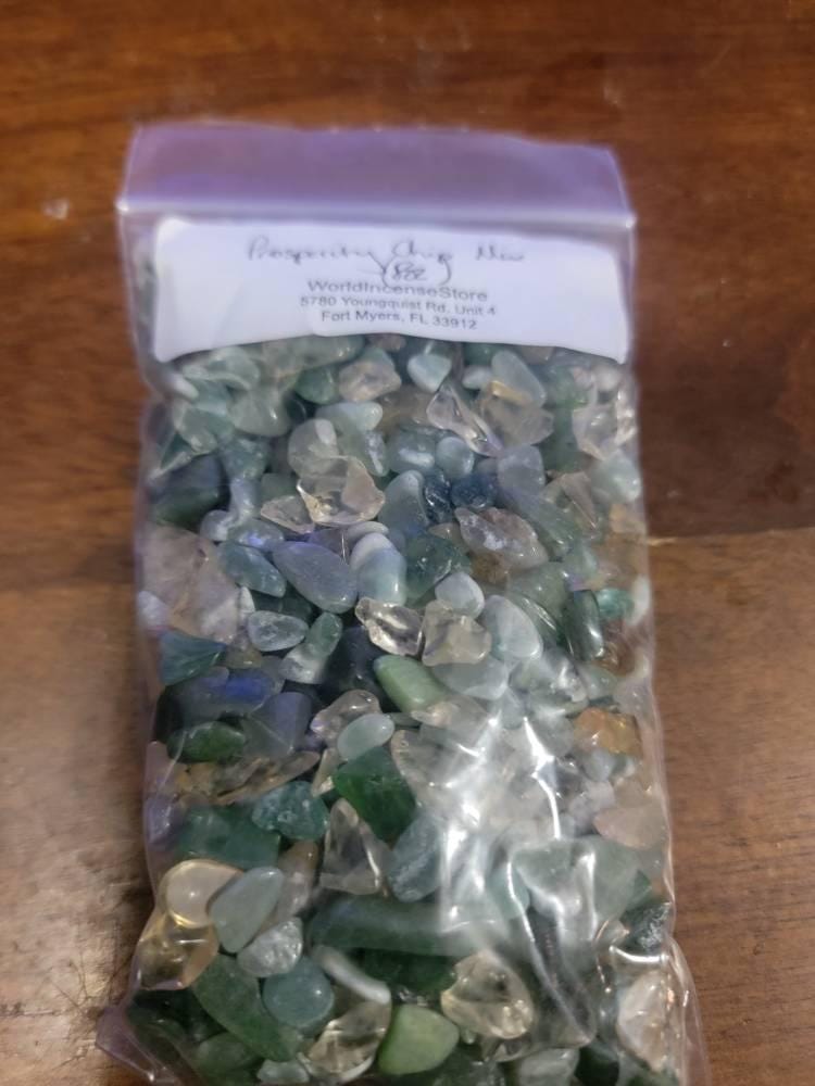 Beautiful Prosperity Crystal Chip mixture consisting of Citrine, Green Aventurine, and Jade Nephrite Chips. Assorted sizes, mostly in the range of 3 - 10 mm. They are great not just for decoration but for all types of arts and crafts projects, etc. Semi rough tumbled mini chip stones, undrilled.