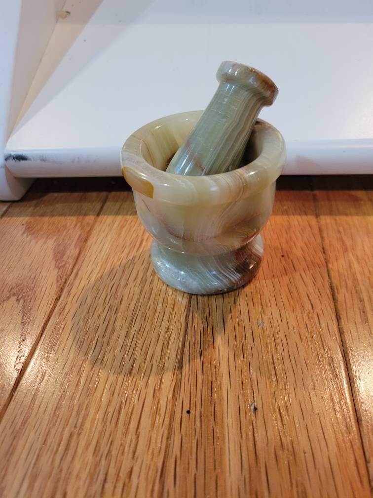 Elevate your kitchen with natural beauty with these hand carved Green Onyx Mortar and Pestle Sets. Perfect for both culinary and spiritual practices, this unique set is a functional piece of art and a useable tool. Measuring approximately 2.25" Tall and 2.5" Wide, the perfect small size.