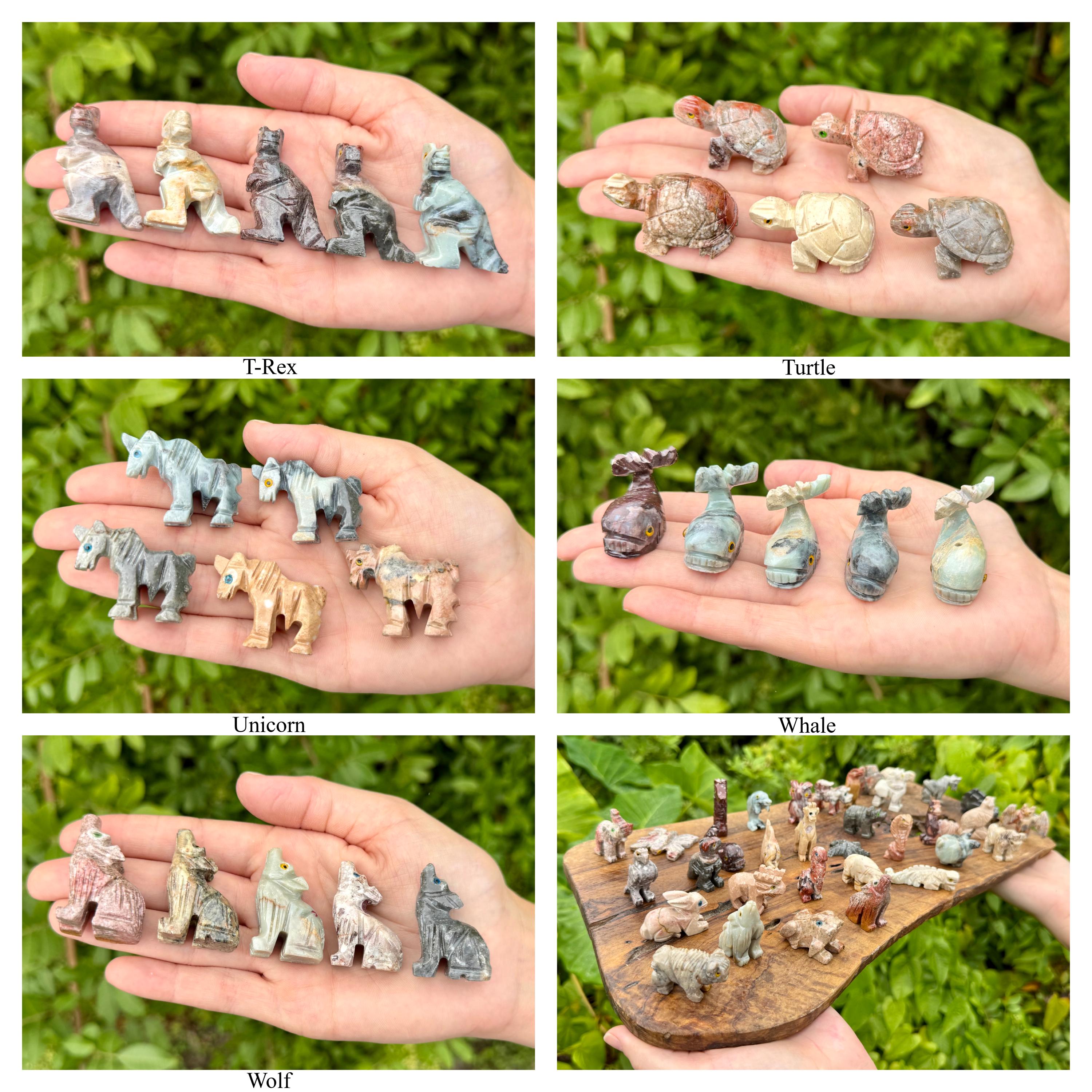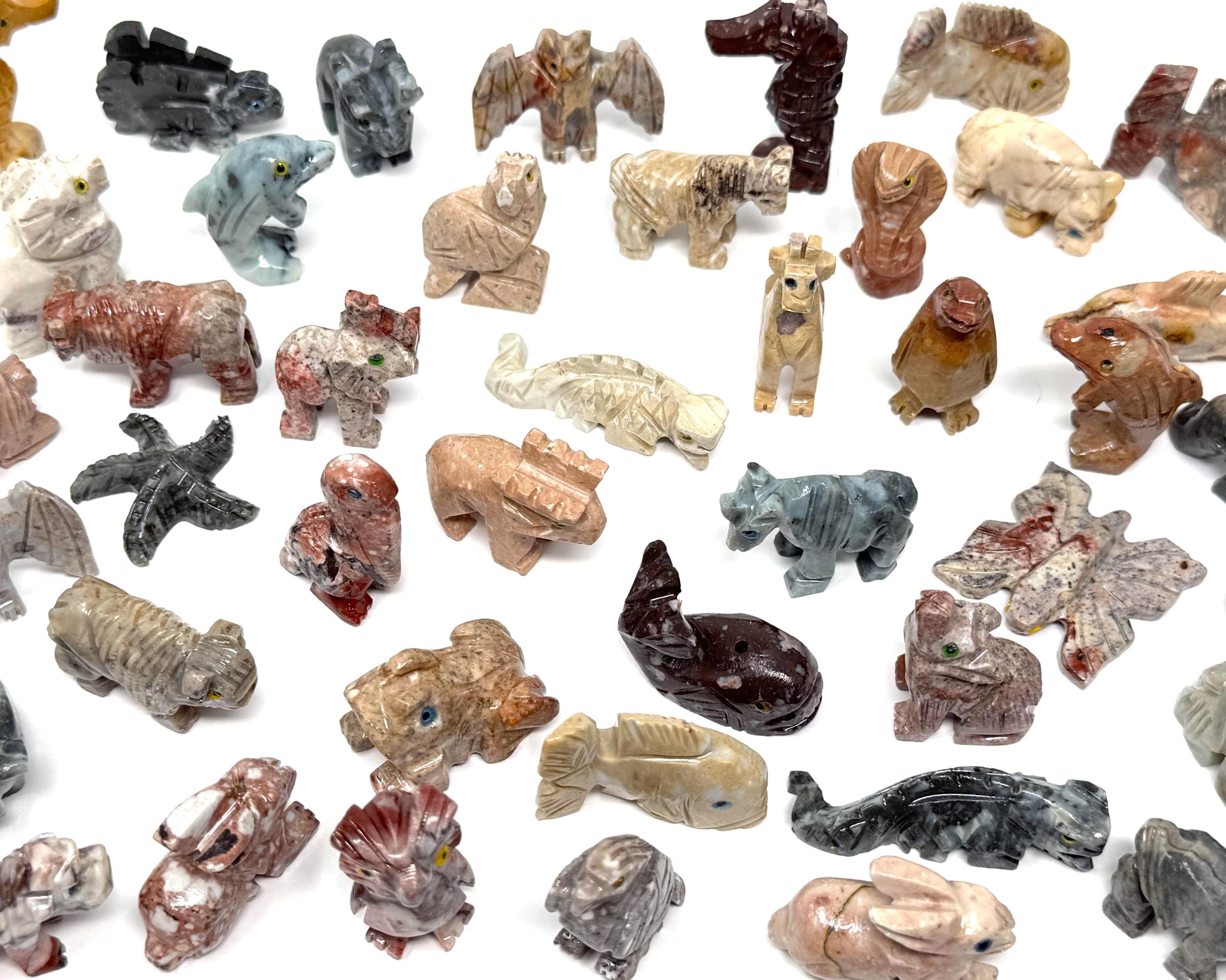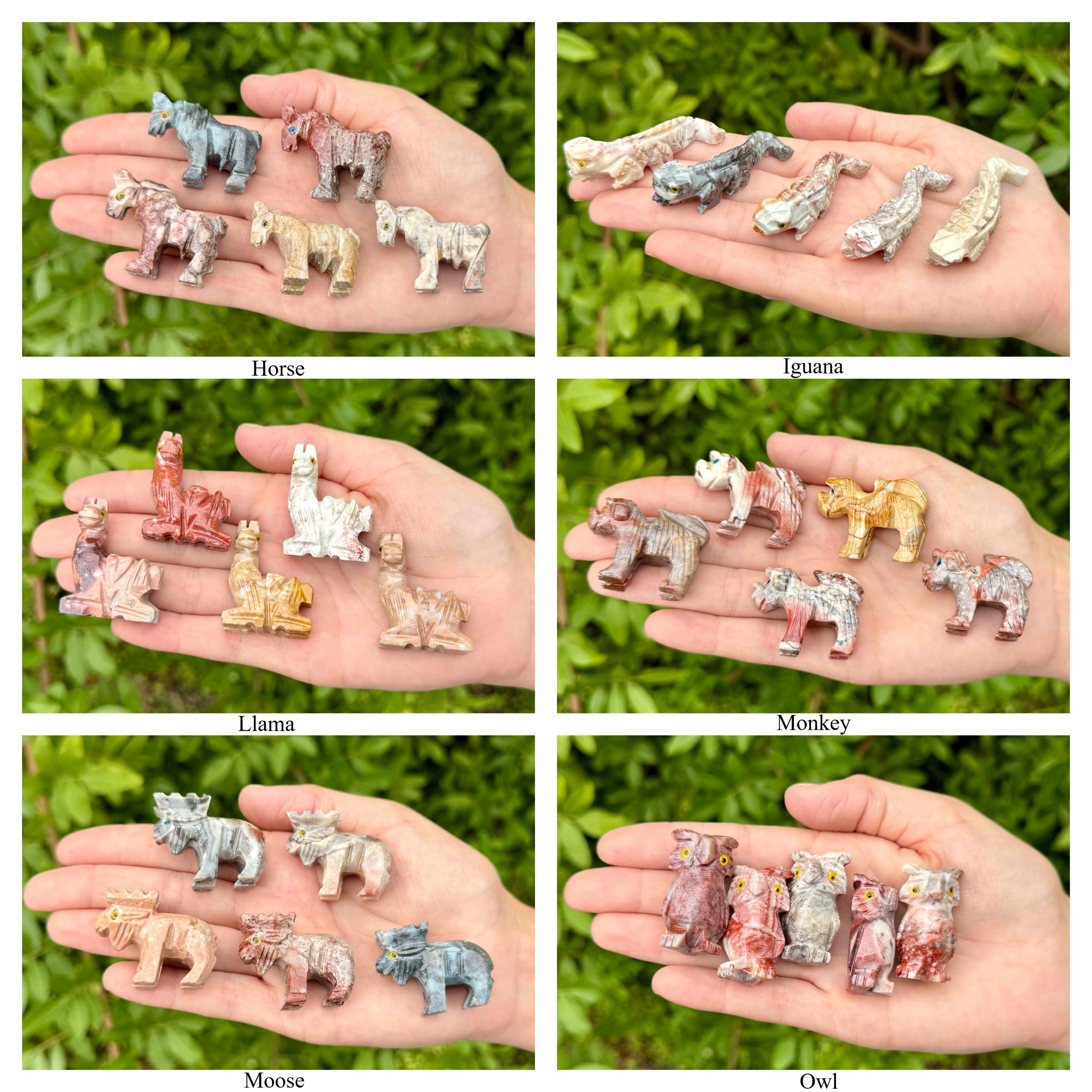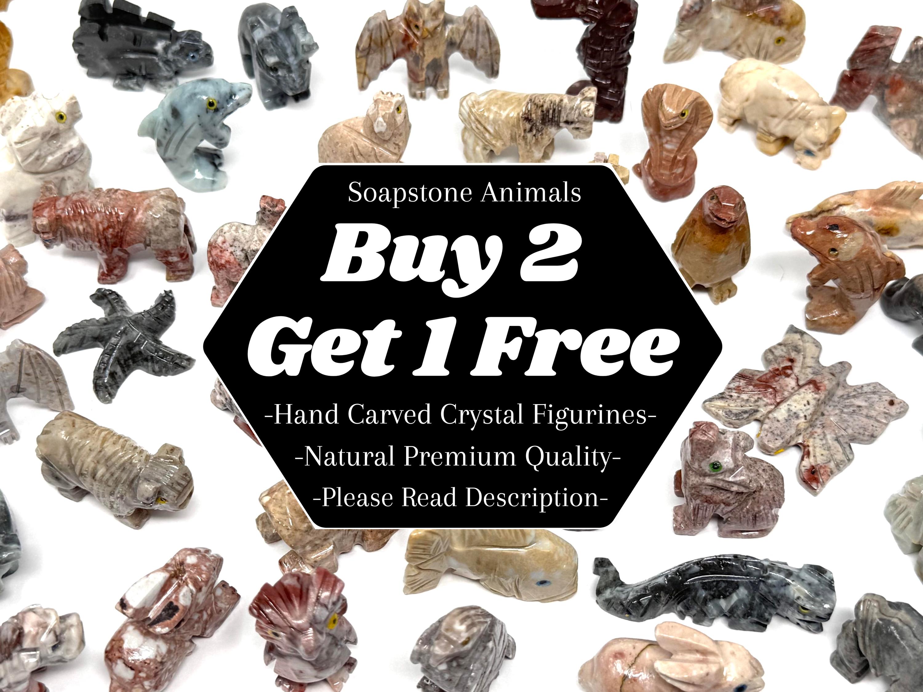 Beautiful hand made Soapstone Animals in 35 different unique shapes! Bring the love of Crystals and Animals together with these wonderful figurines. Each piece is a unique work of art carefully sculpted to show the grace and spirit of each animal. Each figurine stands up with its own character. Size varies with each Animal but most are around 1.25" +/-.