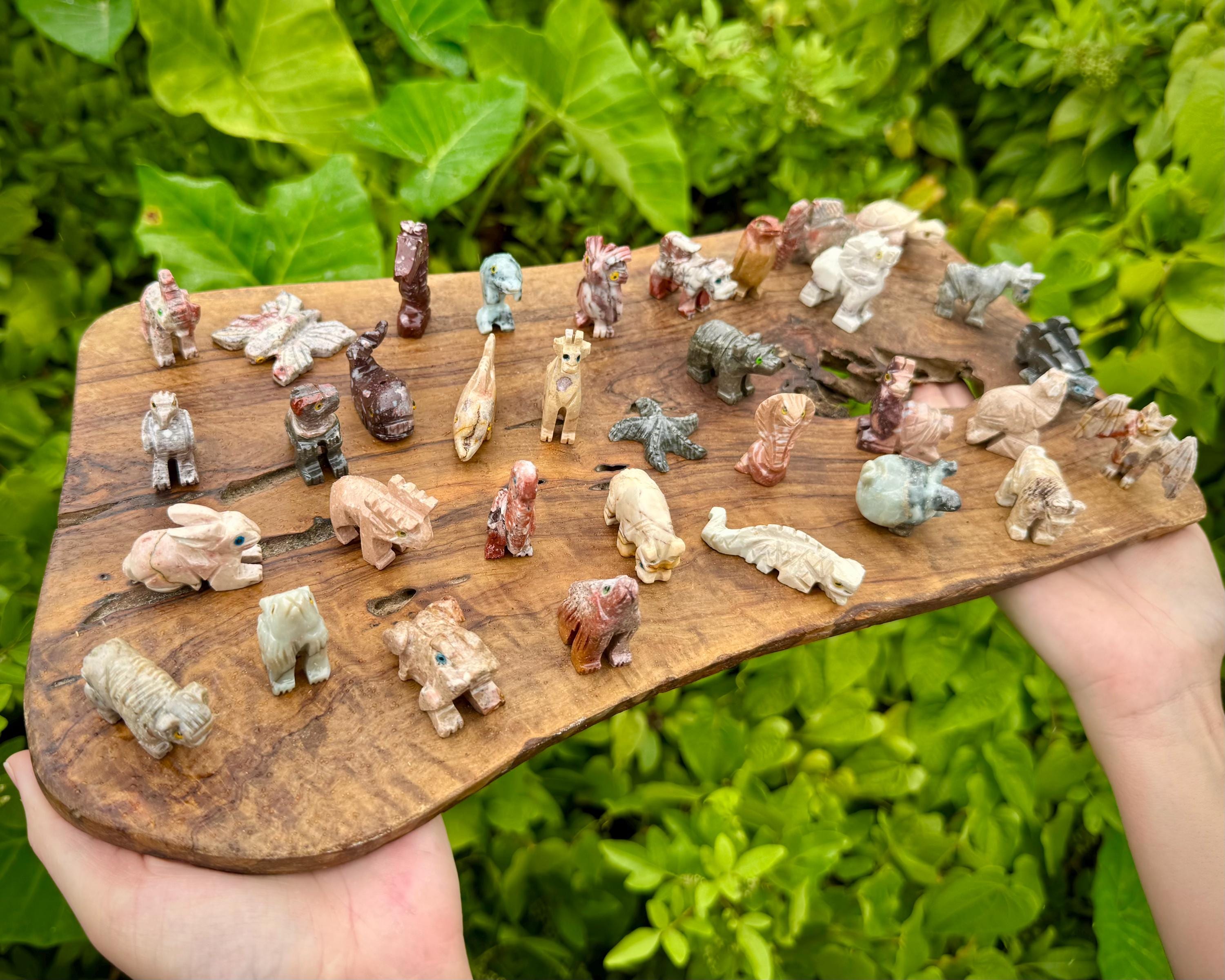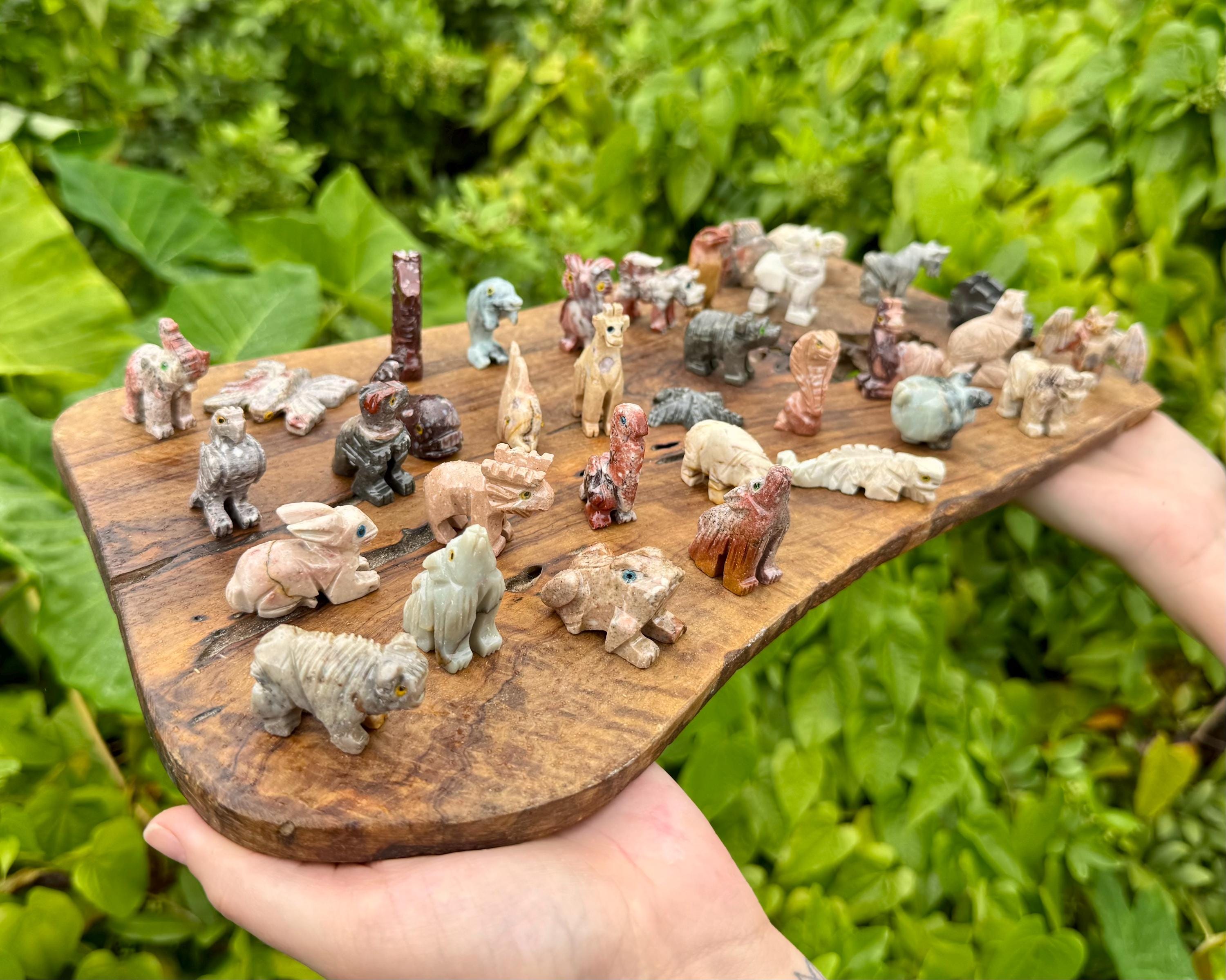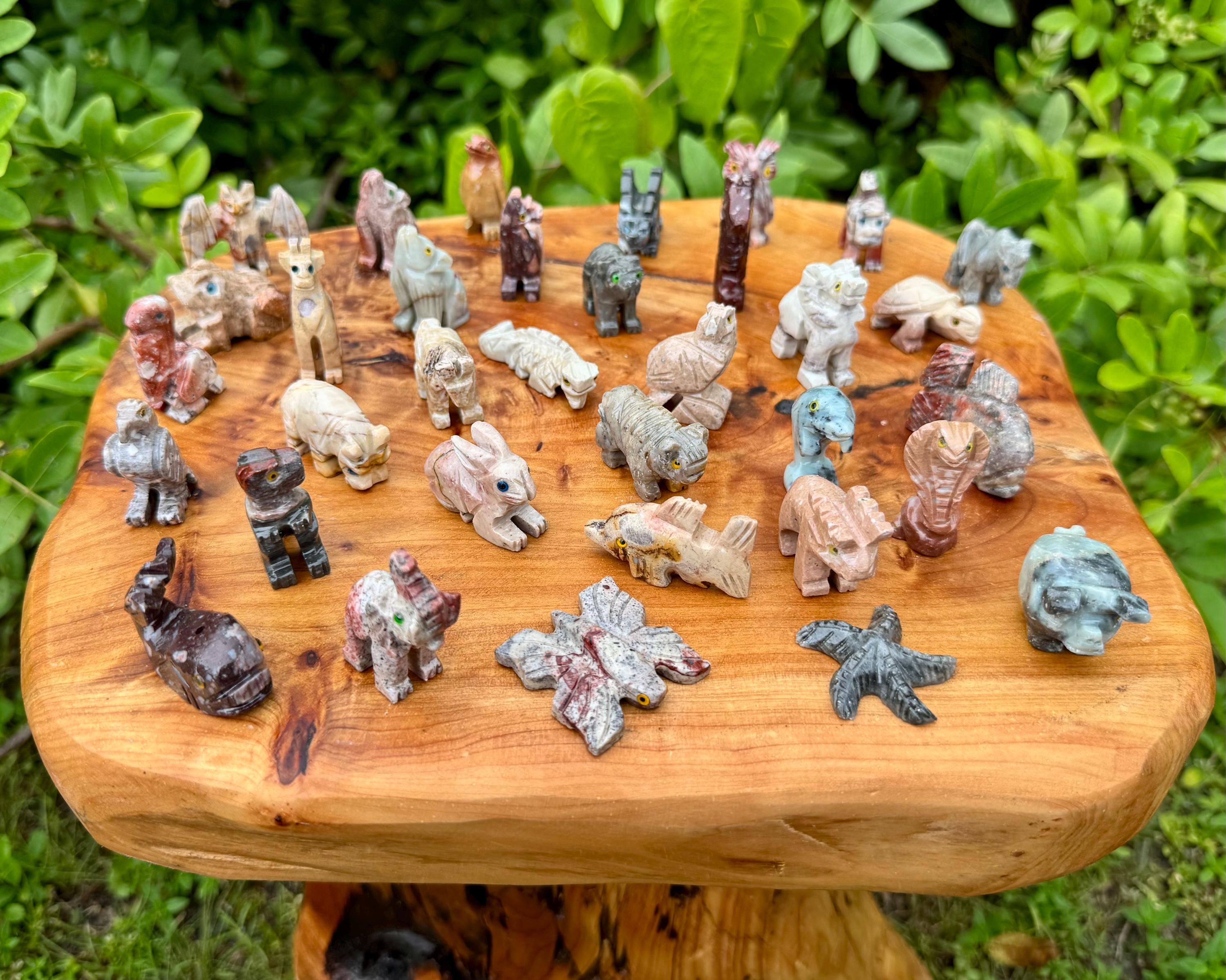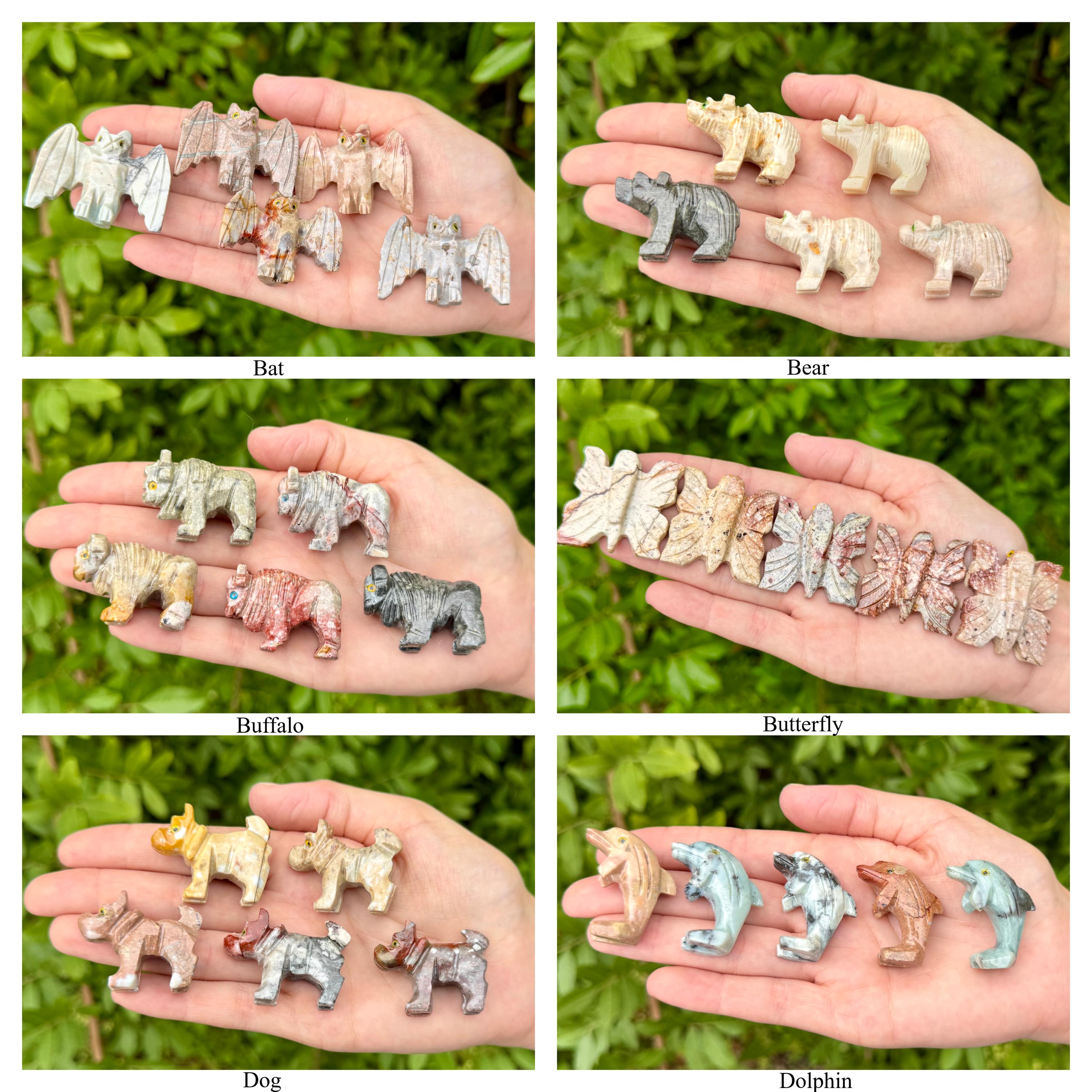 Beautiful hand made Soapstone Animals in 35 different unique shapes! Bring the love of Crystals and Animals together with these wonderful figurines. Each piece is a unique work of art carefully sculpted to show the grace and spirit of each animal. Each figurine stands up with its own character. Size varies with each Animal but most are around 1.25" +/-.