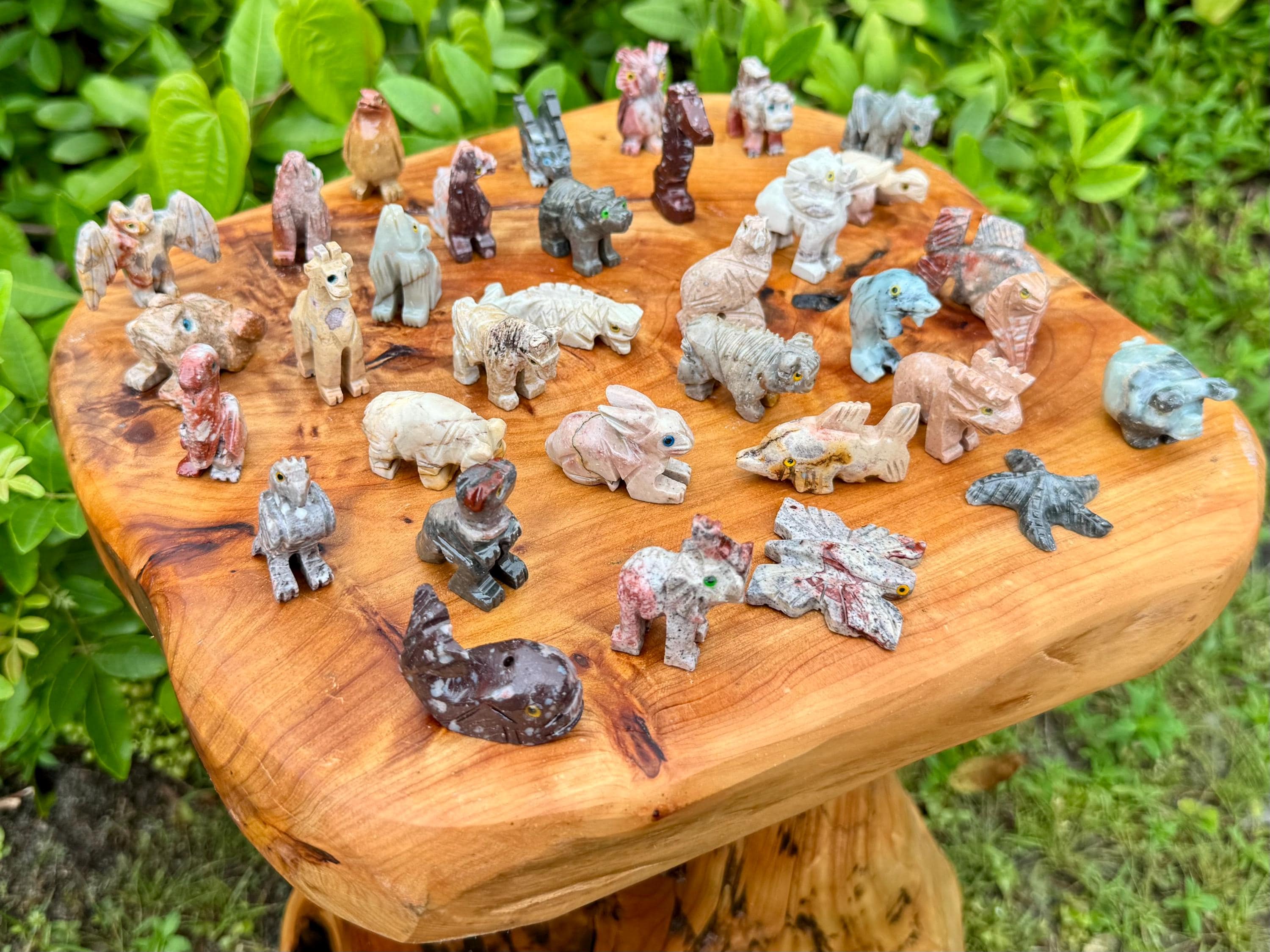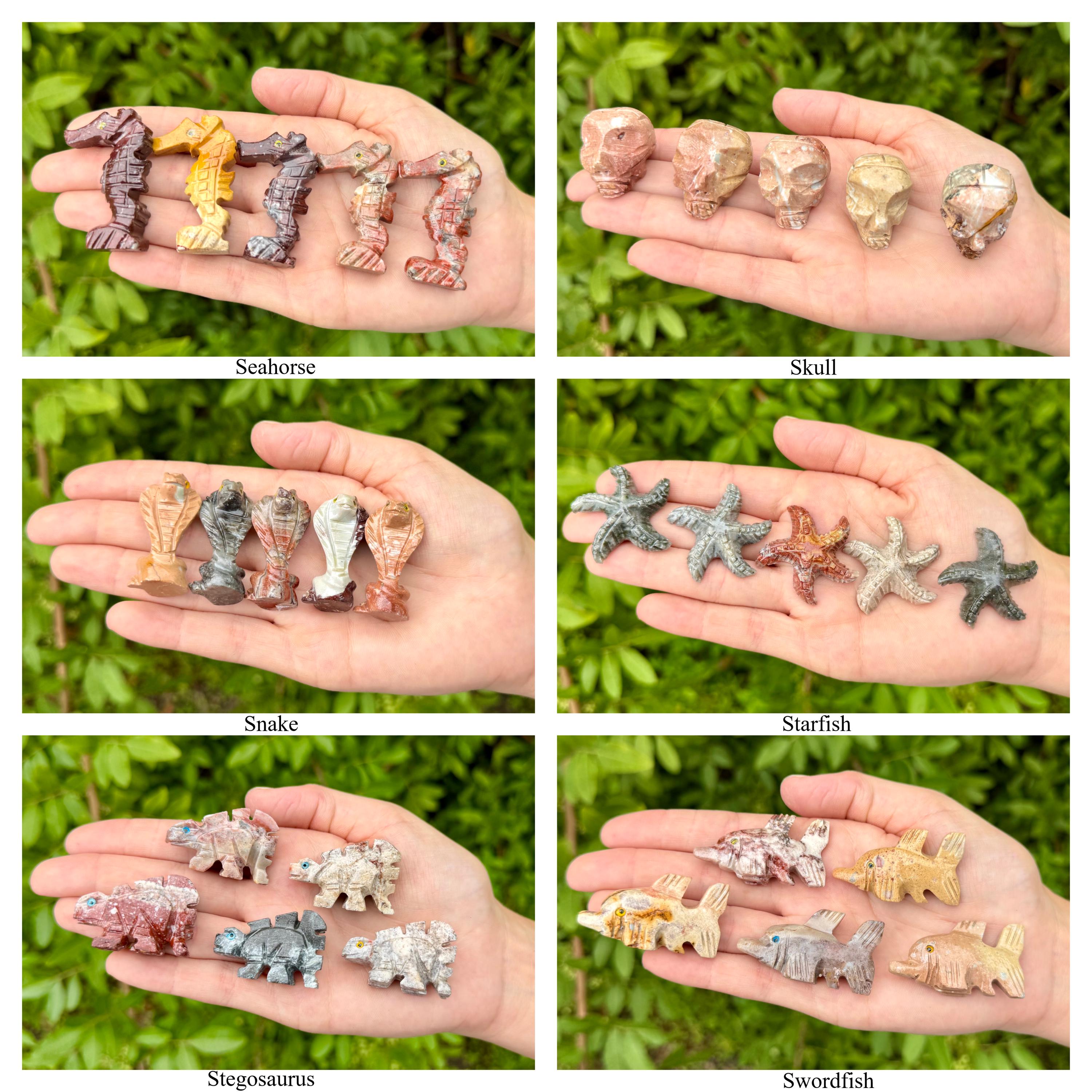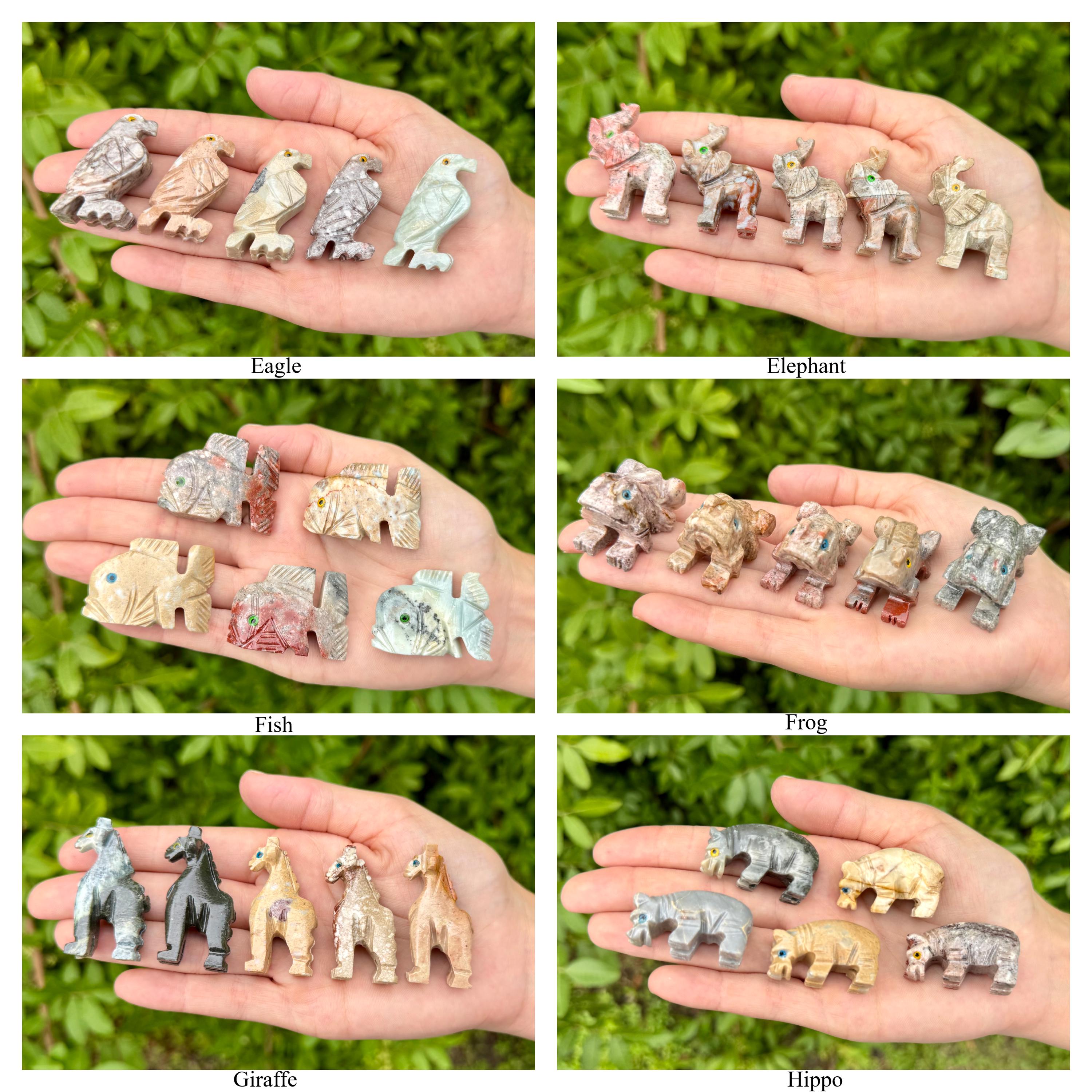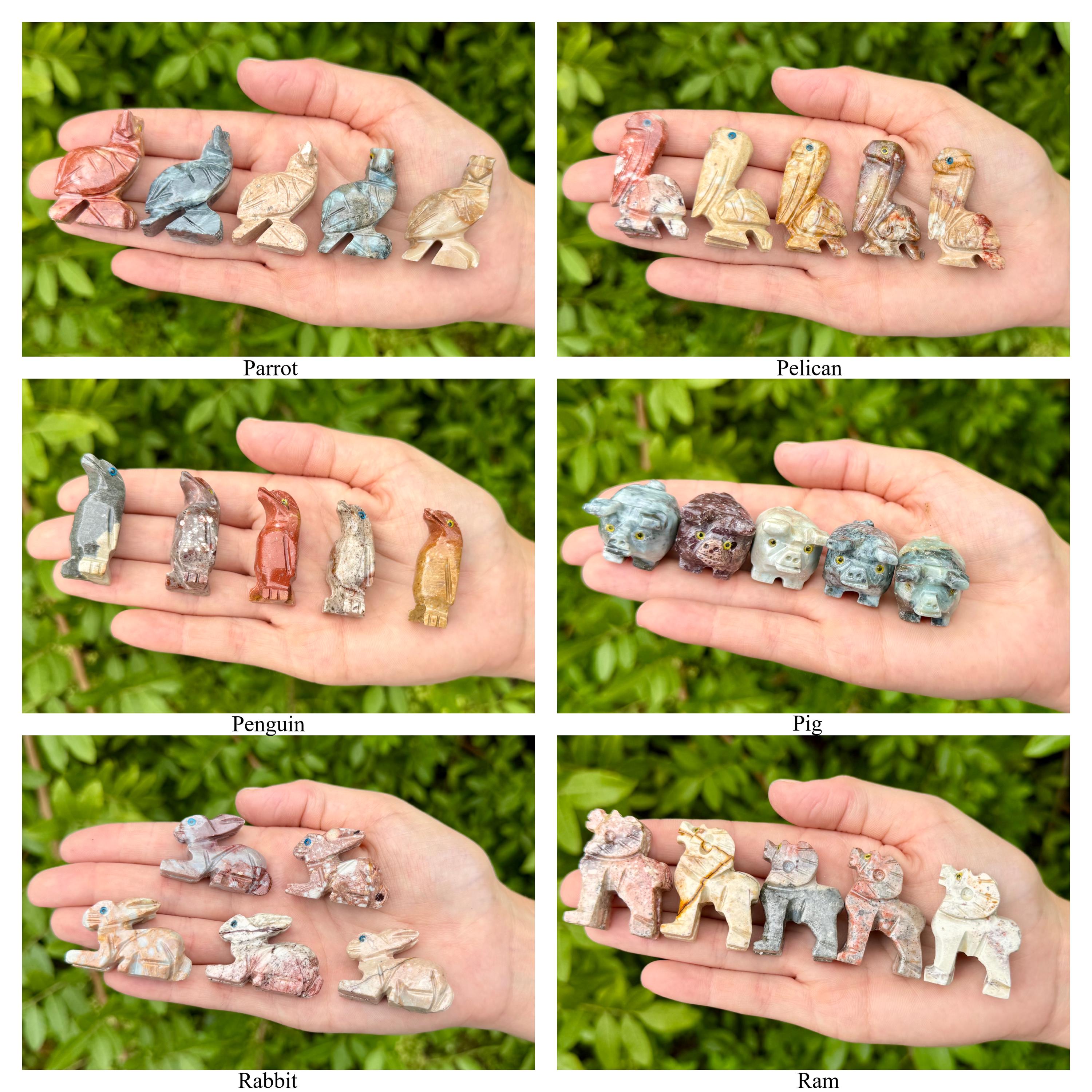 Beautiful hand made Soapstone Animals in 35 different unique shapes! Bring the love of Crystals and Animals together with these wonderful figurines. Each piece is a unique work of art carefully sculpted to show the grace and spirit of each animal. Each figurine stands up with its own character. Size varies with each Animal but most are around 1.25" +/-.