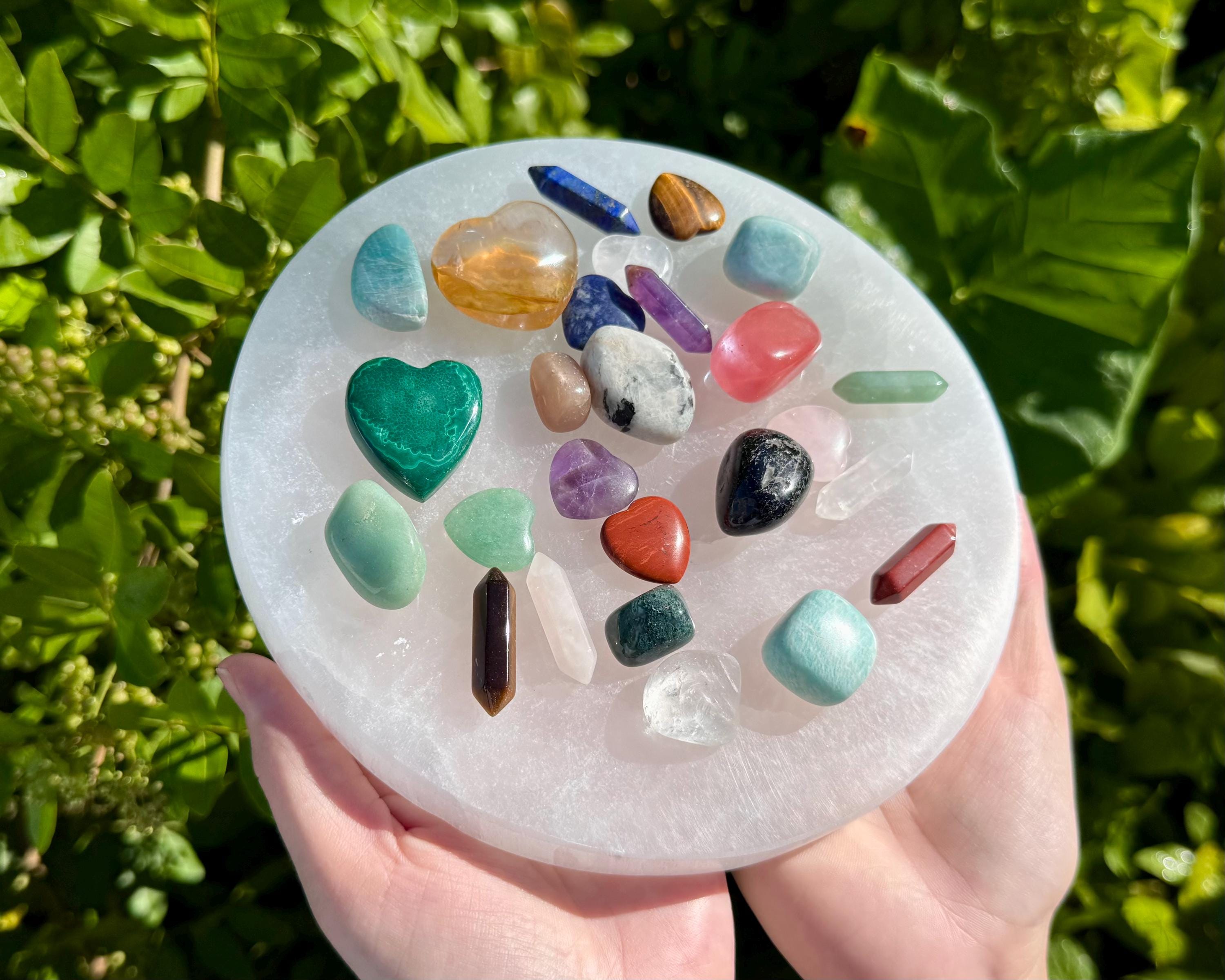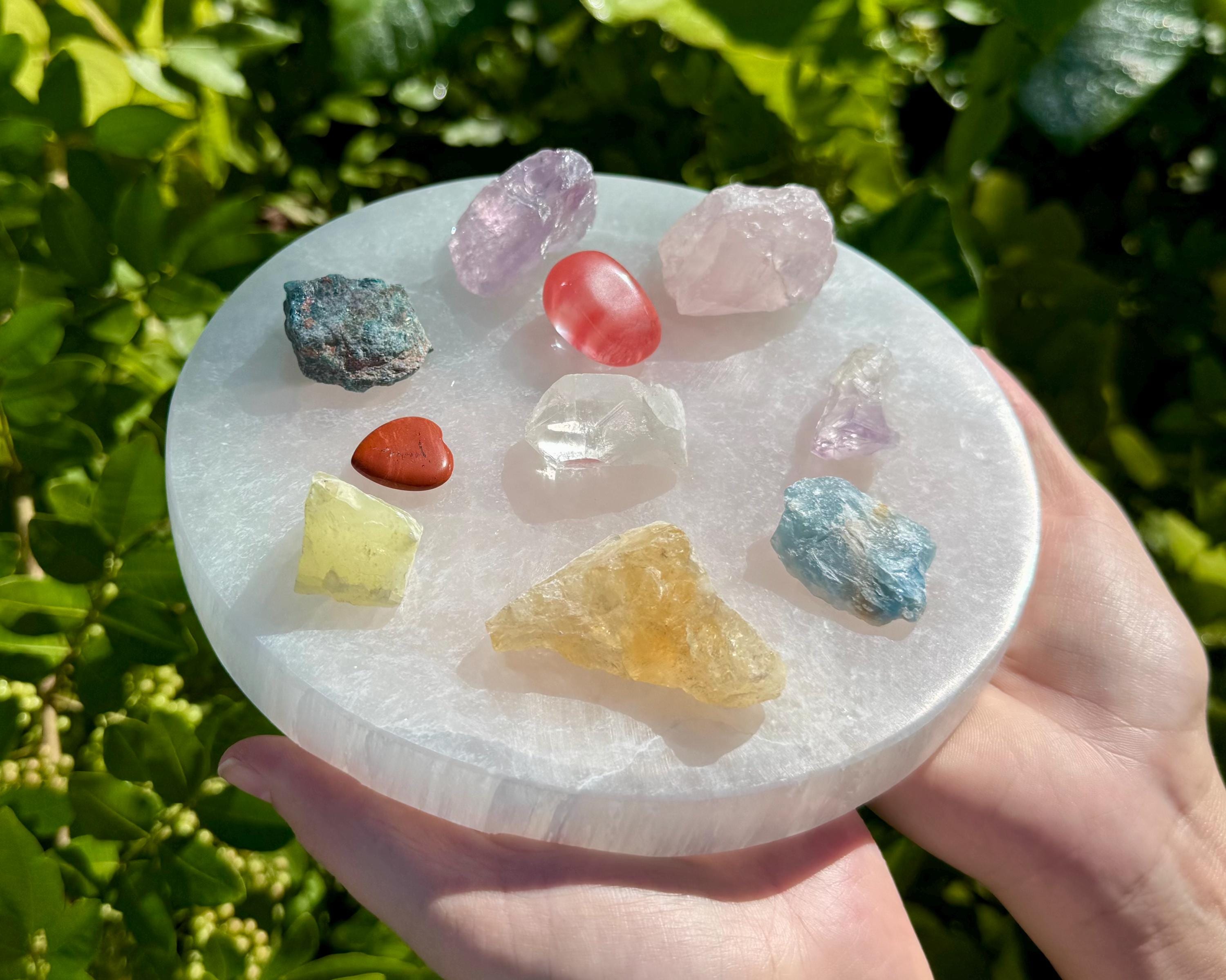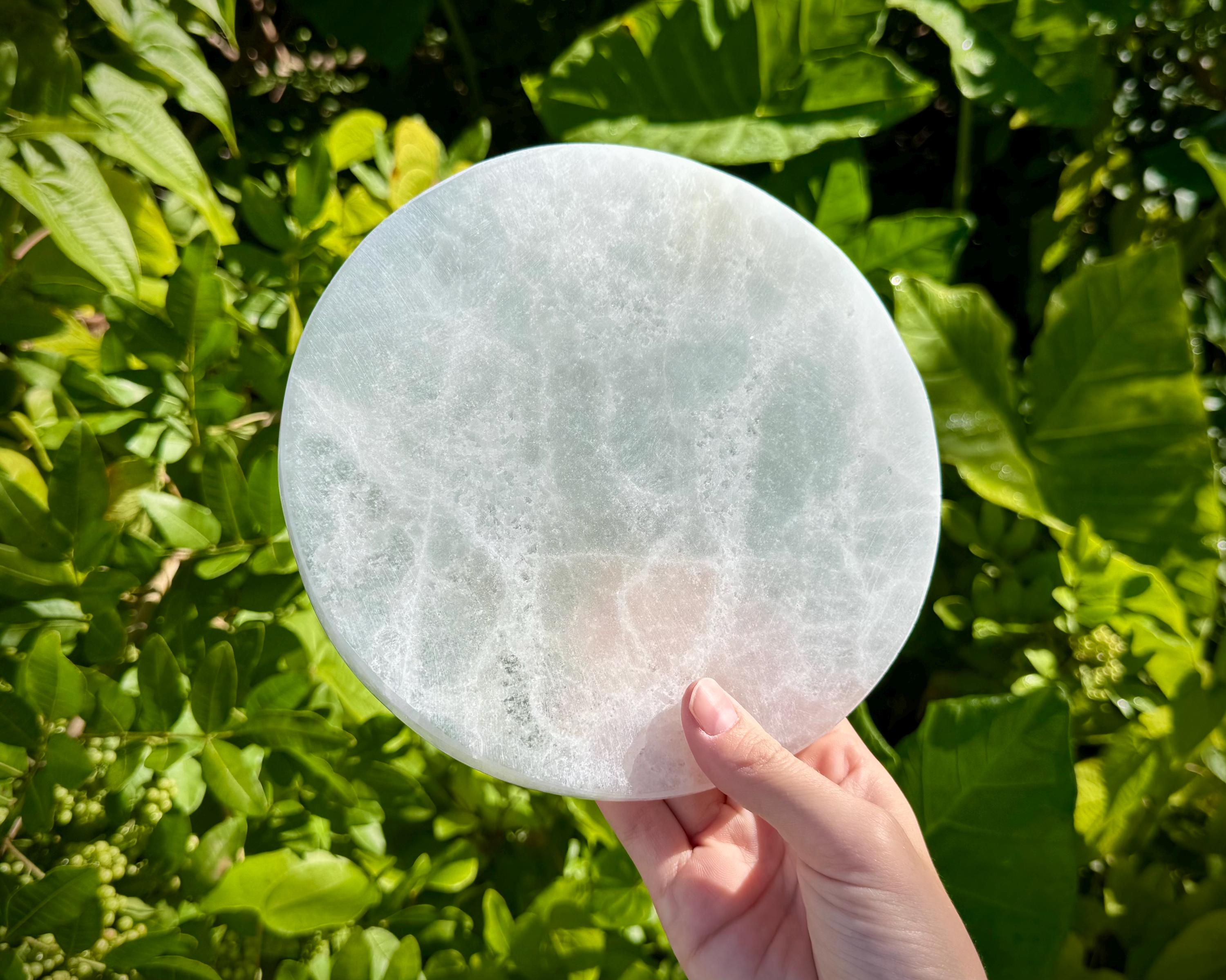 Some notes on the material: This fibrous crystal has natural fissures and fibers running through it - it can look like 'veins' running through the material. This can give the appearance of damage - its is not - it is very normal for selenite. Due to its soft nature the material can also show 'cracks' or' veins' and the edge can also look a little uneven with minor 'nicks' and 'scratches' - again it is normal for selenite. Selenite can have minor inclusions so the odd speck, dark mark or minor discoloration may be visible. Be aware that selenite should be kept away from water so do not use water to cleanse the plate.