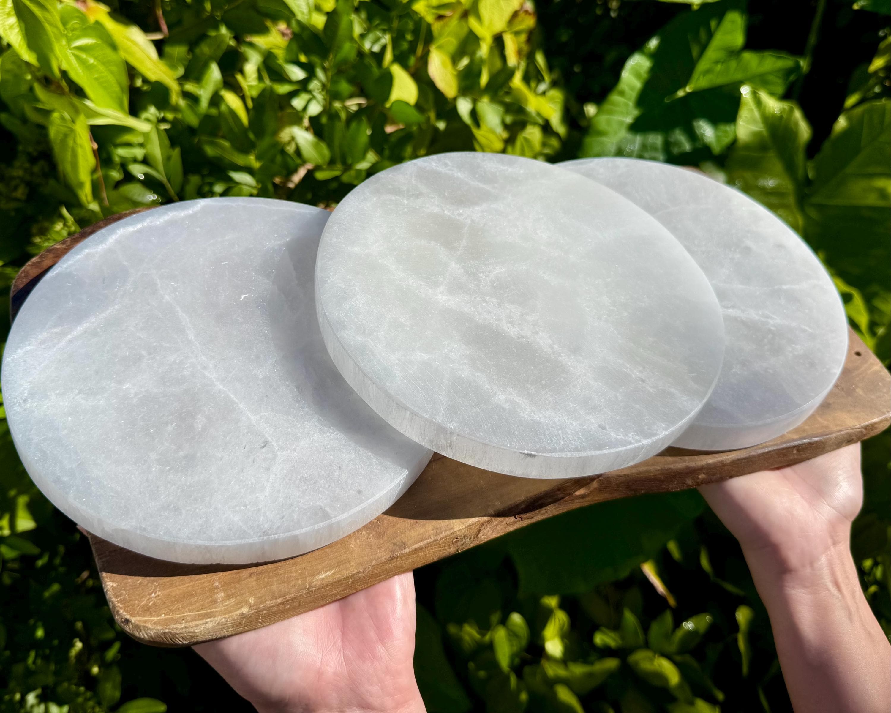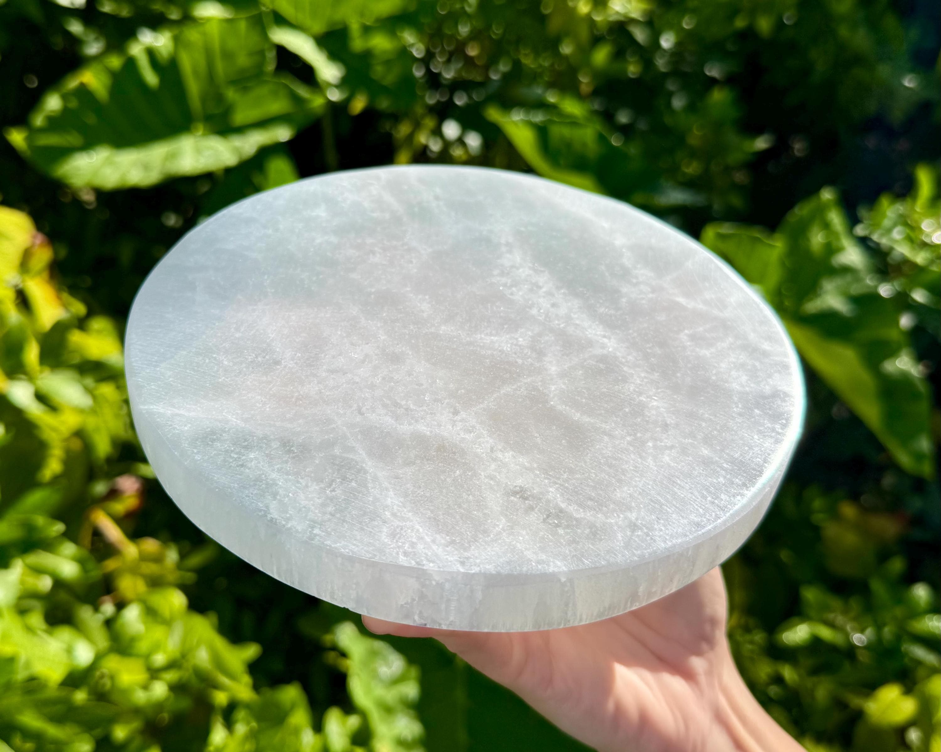 Stunning JUMBO sized round Selenite Charging Stations from Morocco. 8" Diameter and 0.75" thick +/-. These are very solid dense selenite plate that can hold a surprising amount of crystals. Please allow for some variance from piece to piece due to it being a hand-made natural product.