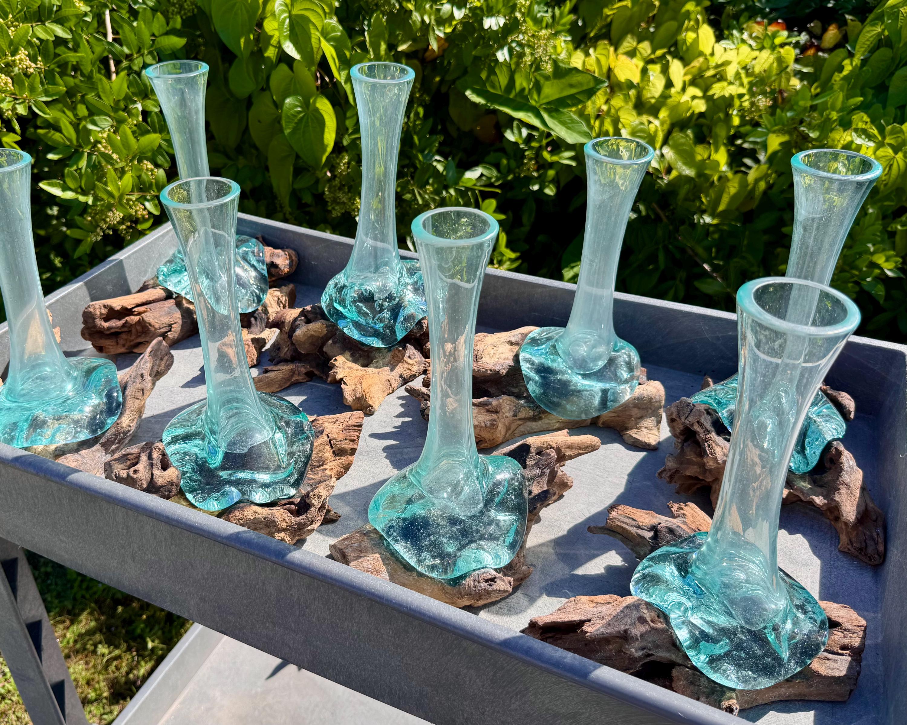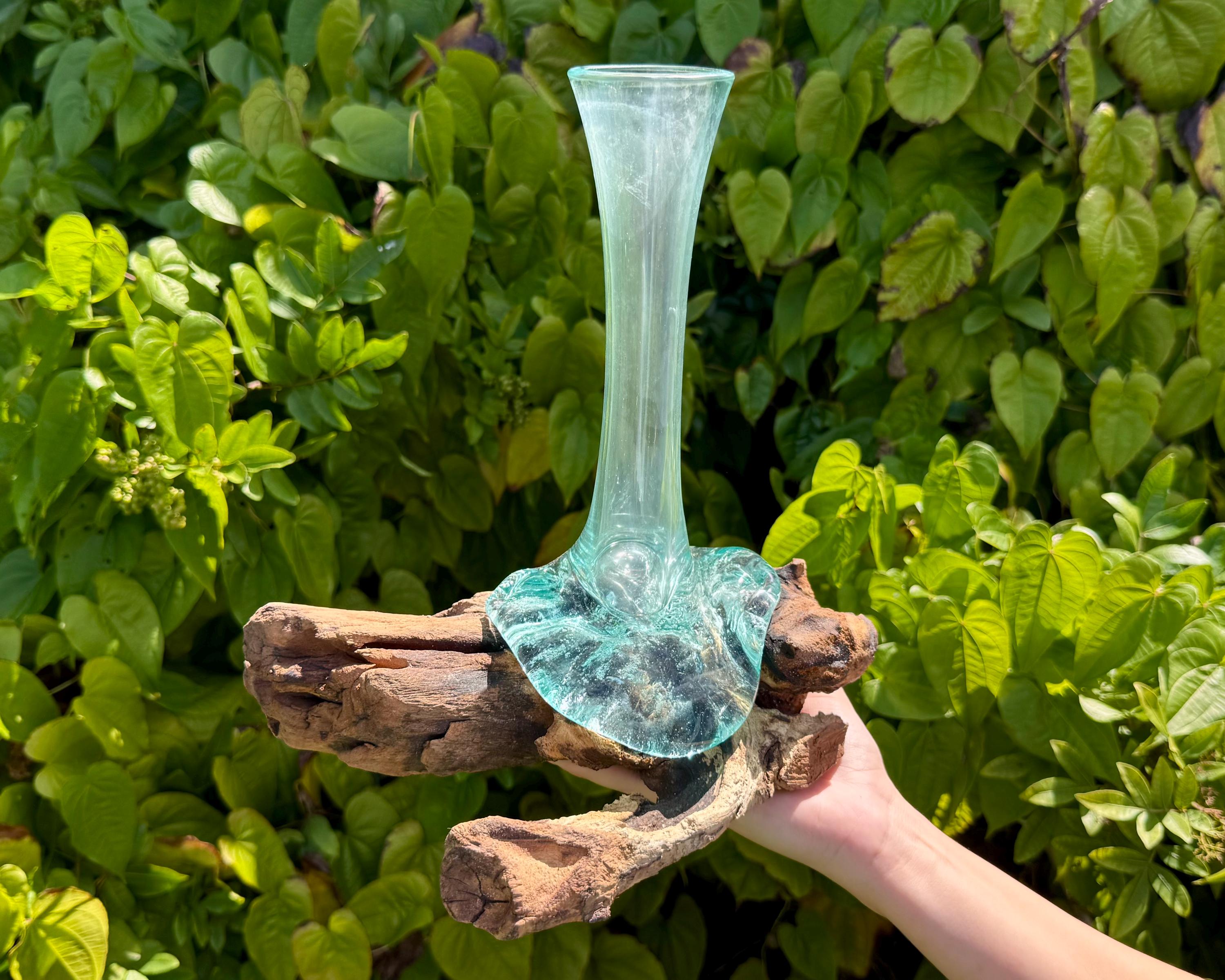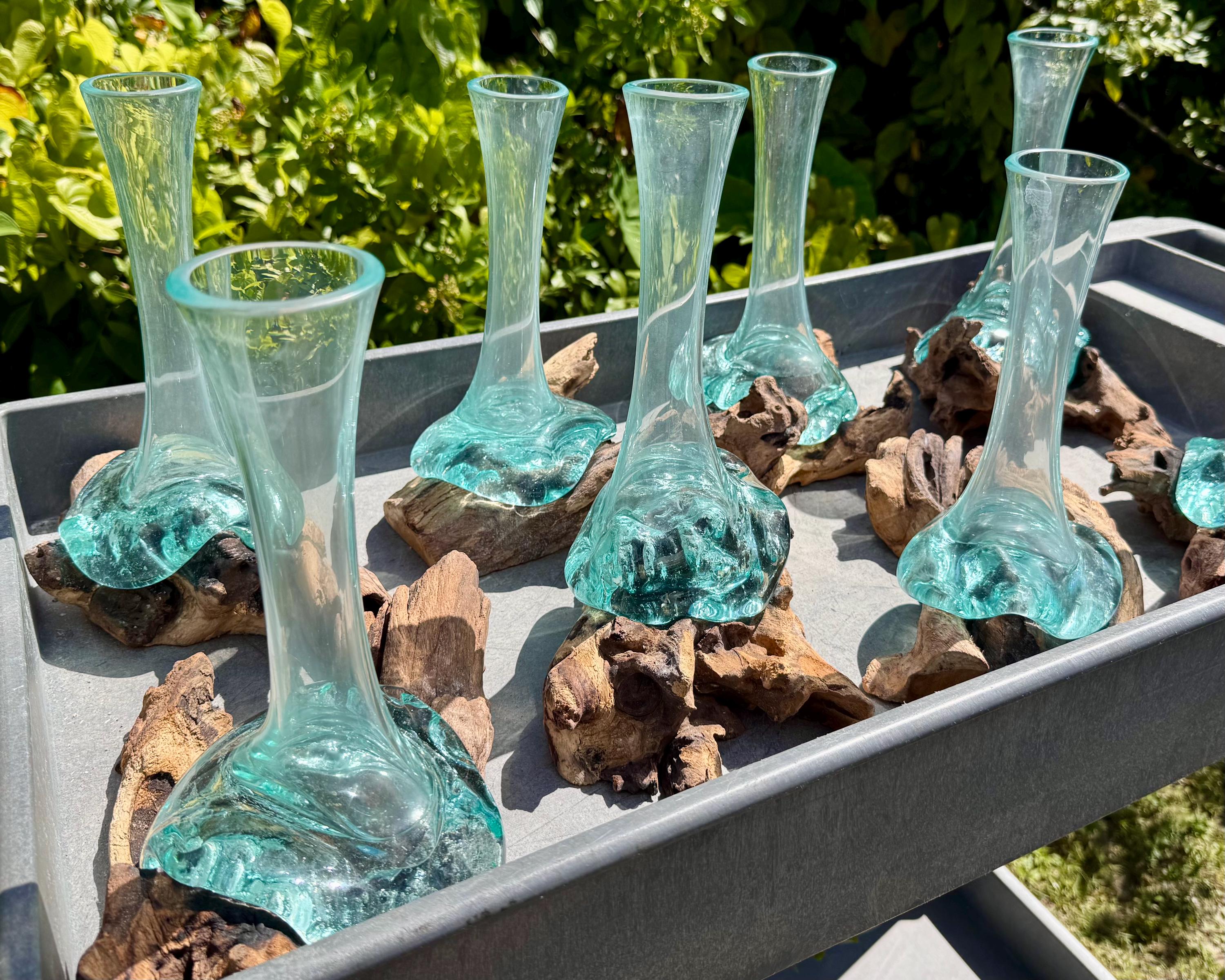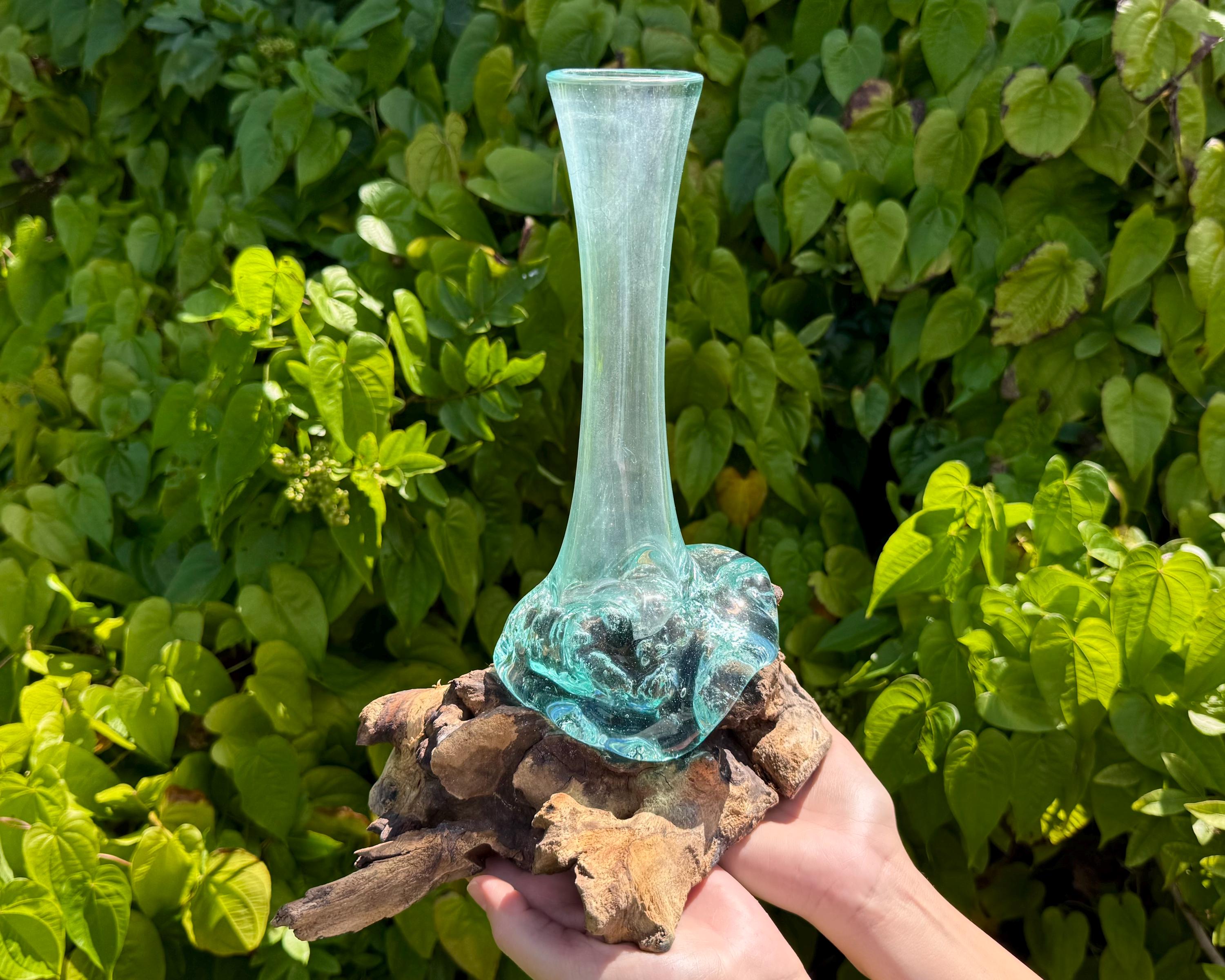 Beautiful Blown Glass Vaces on Wooden Root Bases. The Wooden Base is made from the Gamal Tree Root from Bali, Indonesia. Each Root Base is hand cut, cleaned then kiln dried to ensure quality. The stunning aqua colored molten Glass is then hand blown and perfectly formed onto each base. No two will be identical! These incredible works of art are ethically sourced from farmers and artisans of Indonesia supporting small local economies.