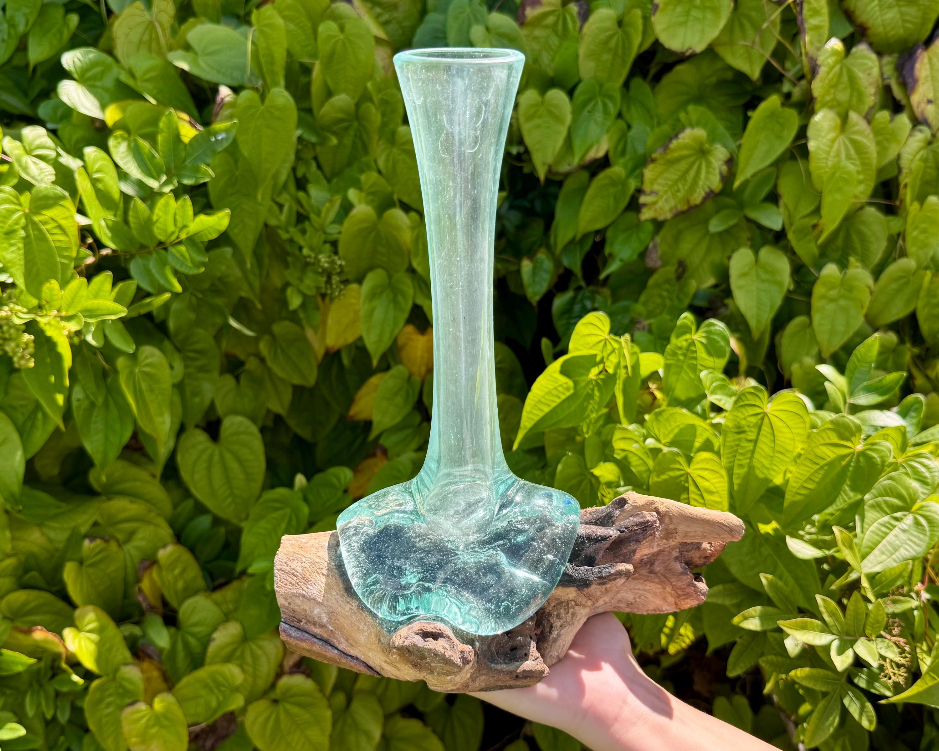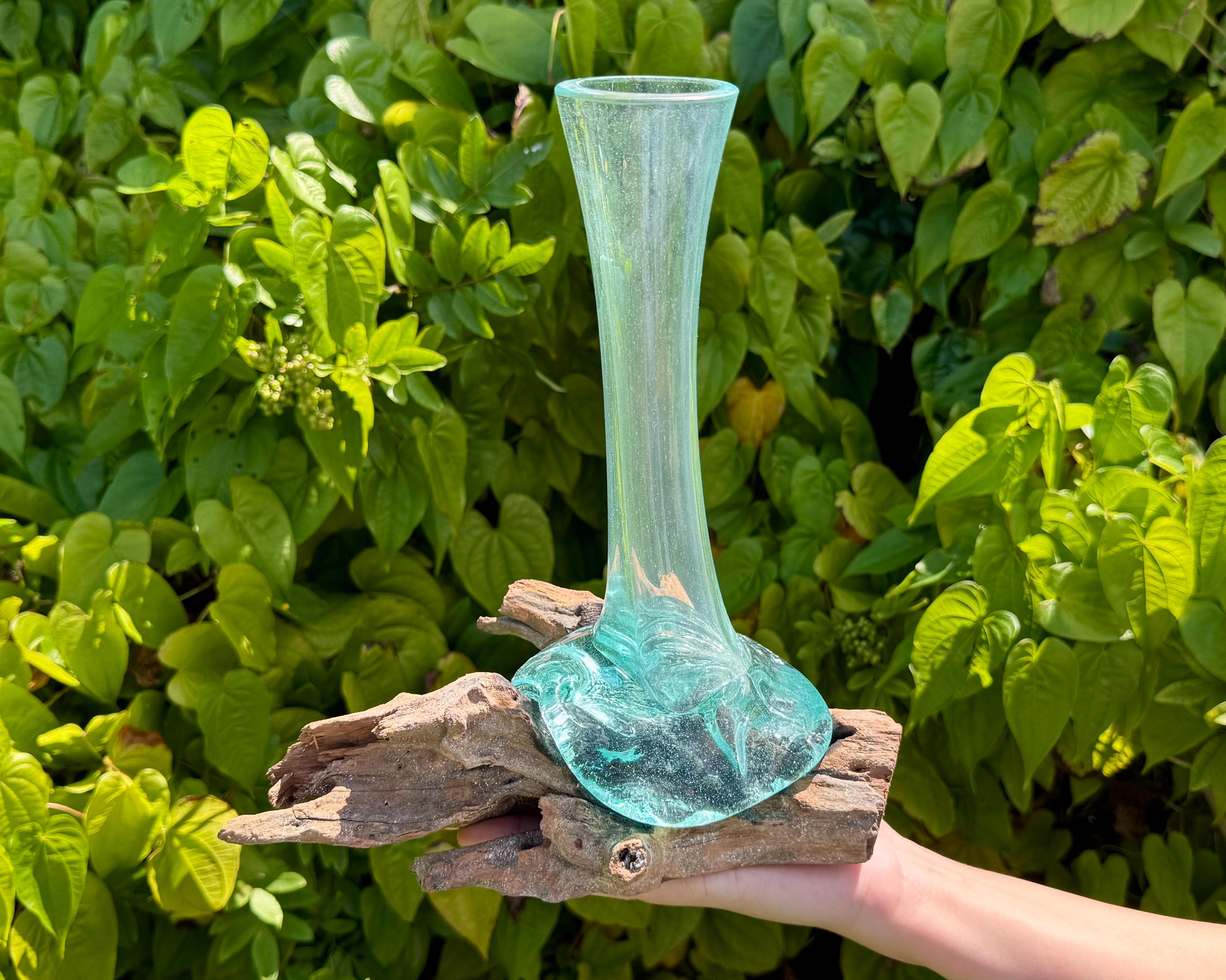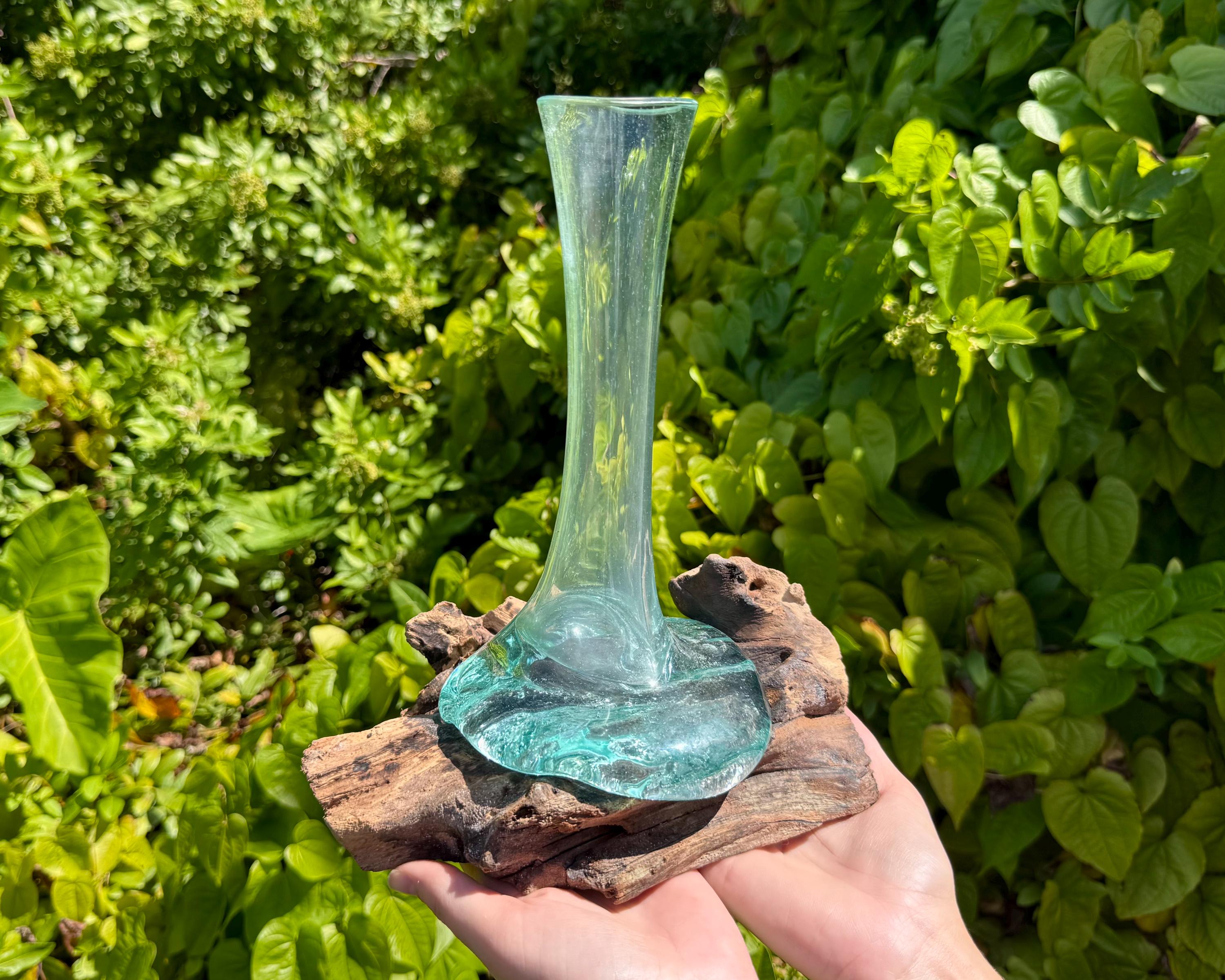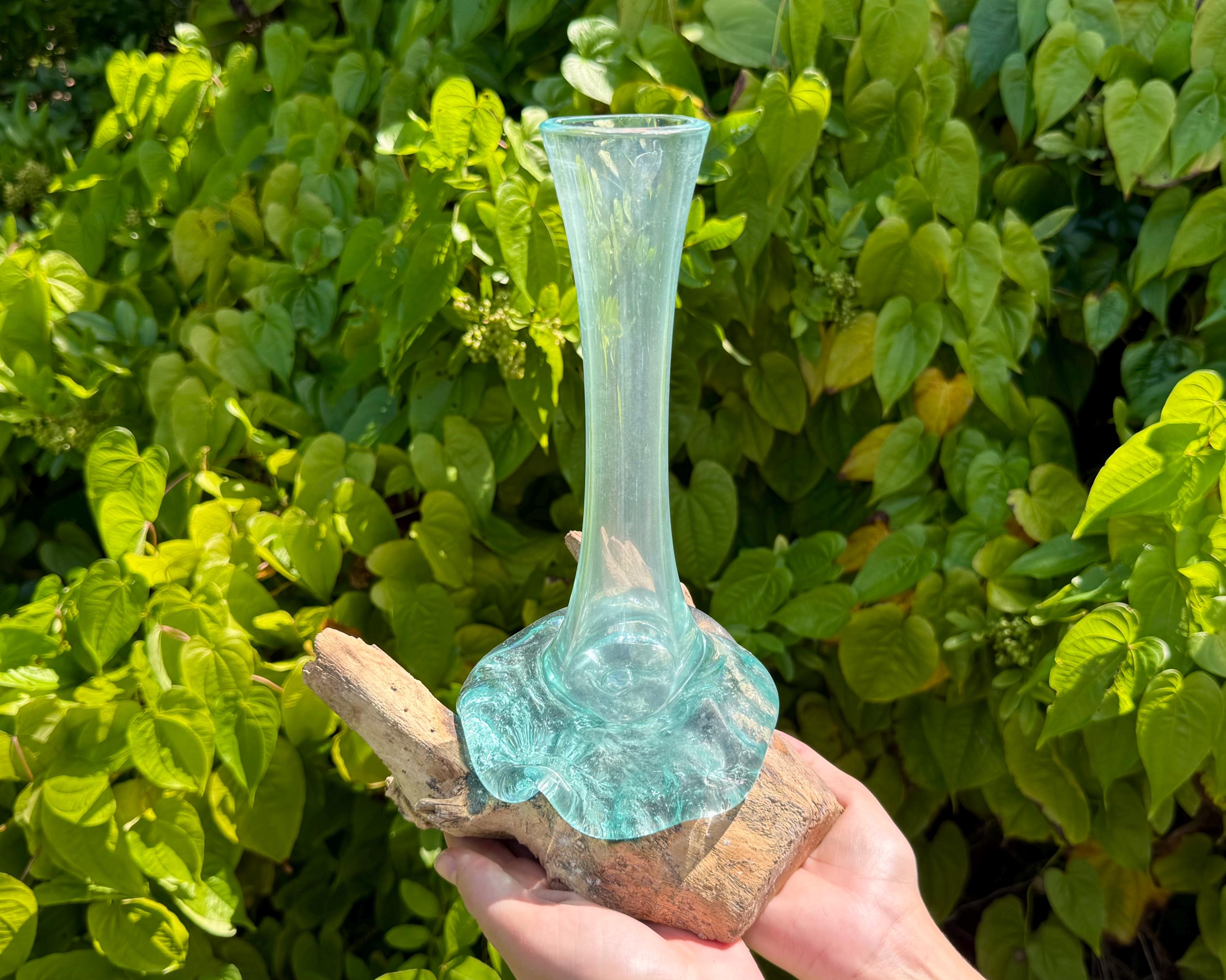 Beautiful Blown Glass Vaces on Wooden Root Bases. The Wooden Base is made from the Gamal Tree Root from Bali, Indonesia. Each Root Base is hand cut, cleaned then kiln dried to ensure quality. The stunning aqua colored molten Glass is then hand blown and perfectly formed onto each base. No two will be identical! These incredible works of art are ethically sourced from farmers and artisans of Indonesia supporting small local economies.
