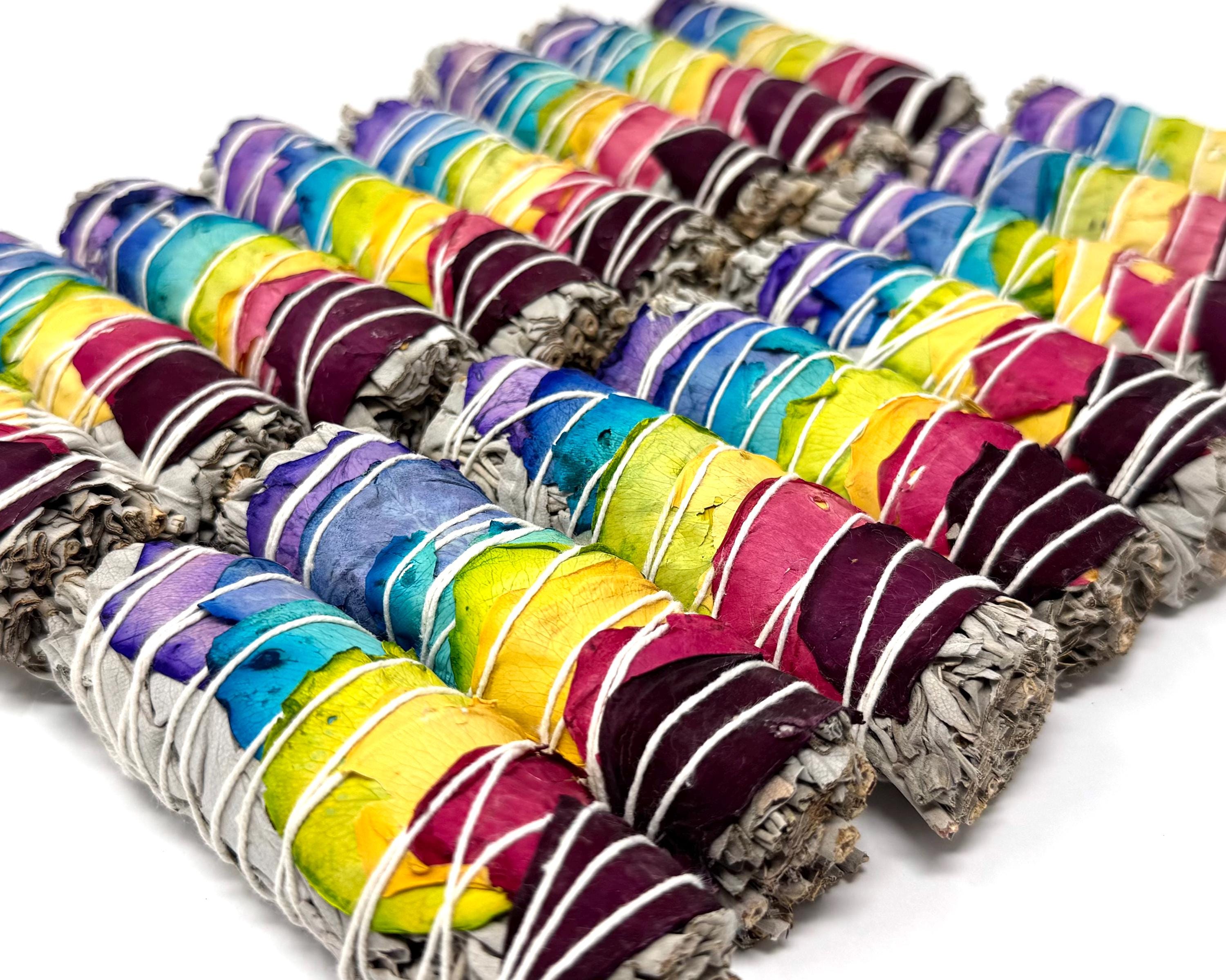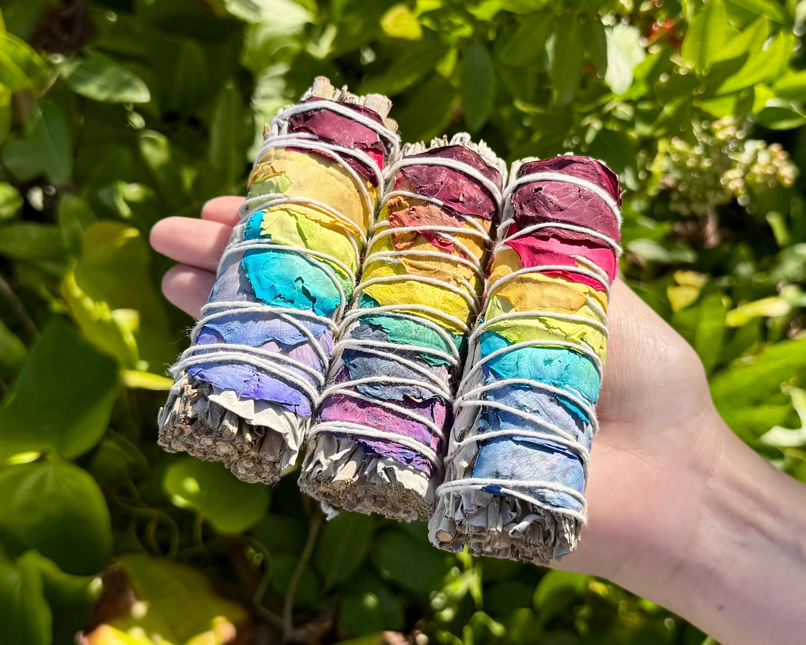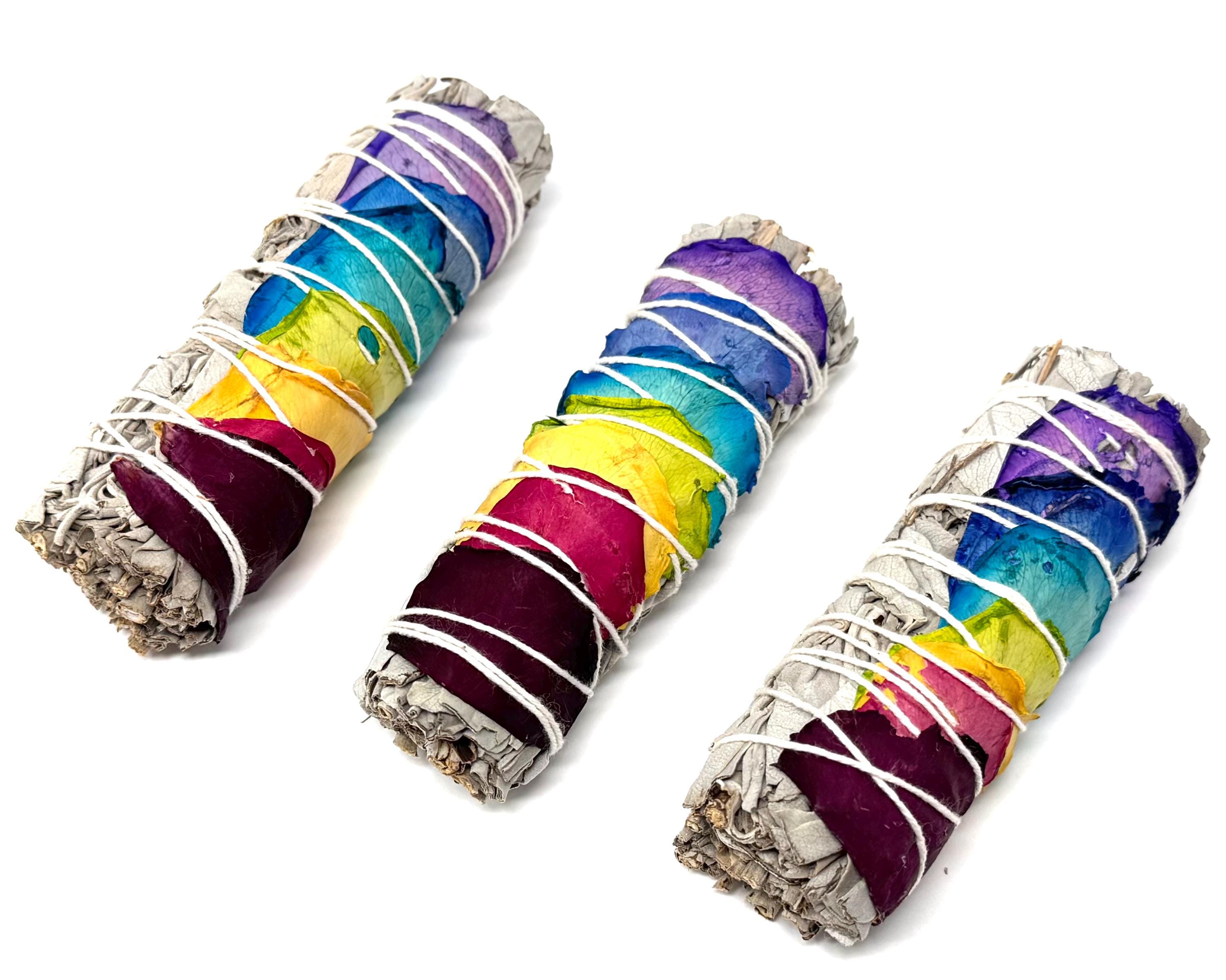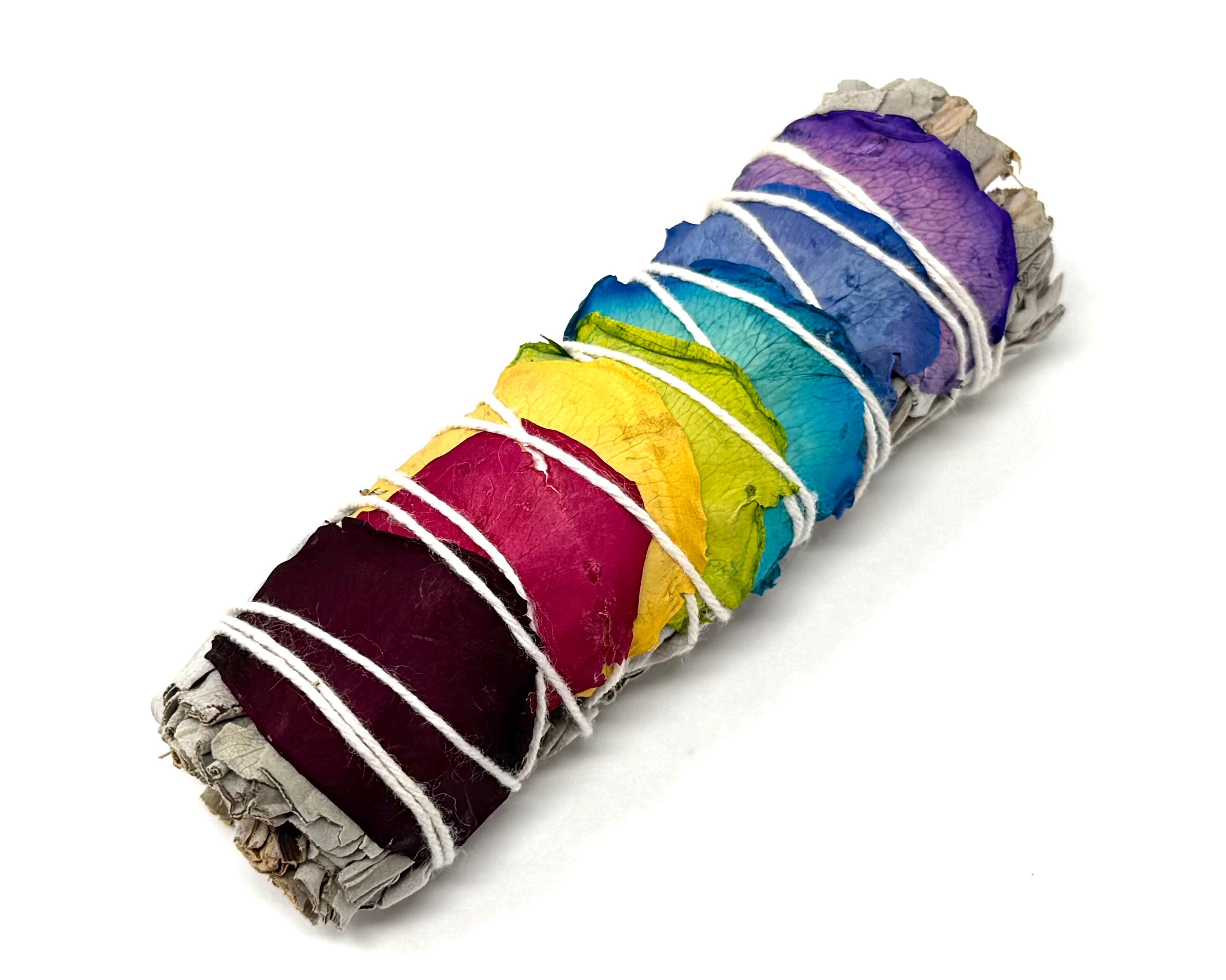 Welcome positive energy and clear your space with our stunning 7 Chakra Rose Petal White Sage Smudge Sticks! Each bundle is meticulously hand-wrapped with ethically sourced White Sage and adorned with vibrant, all natural rose petals representing the major Chakras. This is more than just a cleansing tool - its a ritual for balance and renewal. The Chakra Rose Petals are applied to align with the Seven Chakras, promoting balance, healing, and spiritual harmony during your smudging ritual.