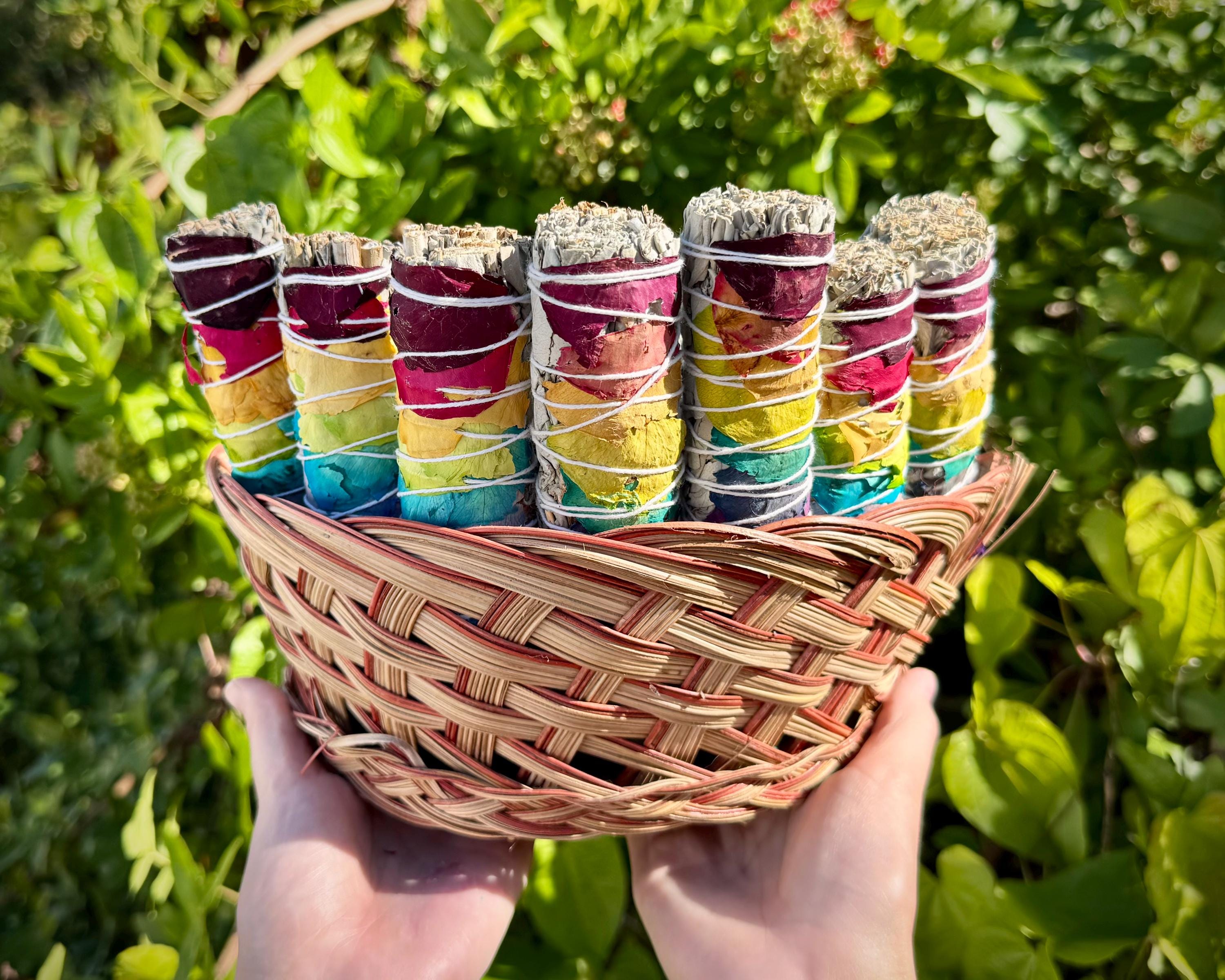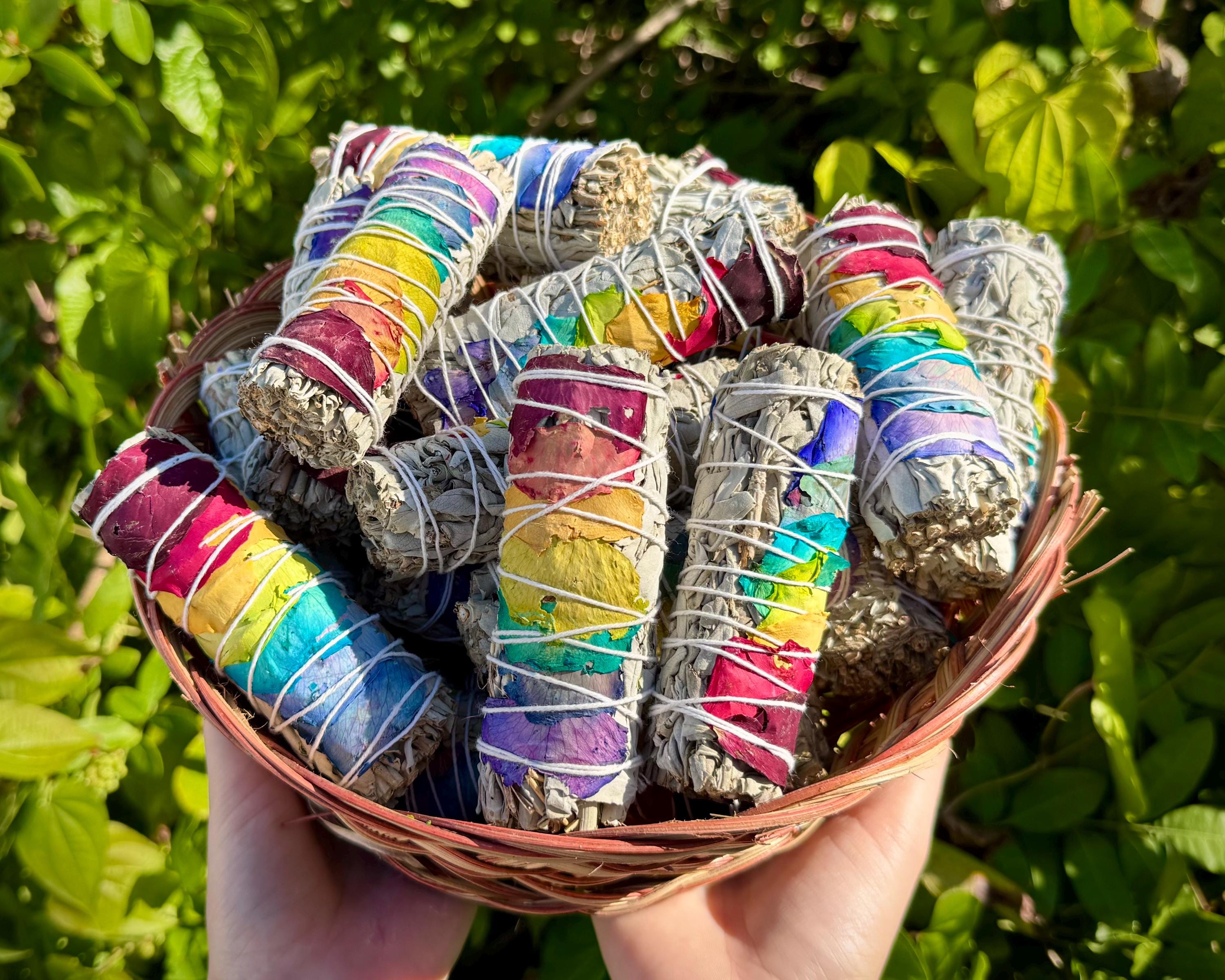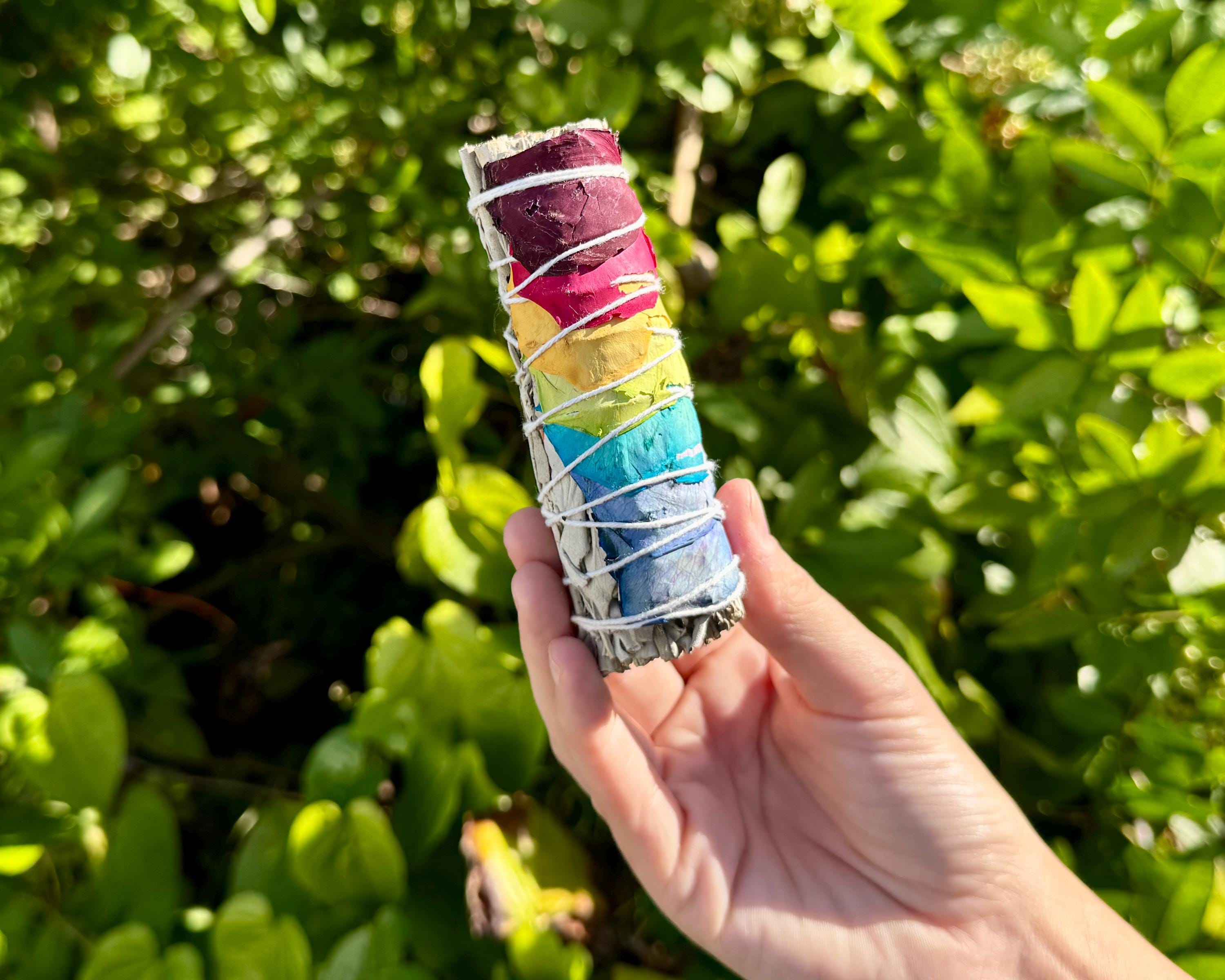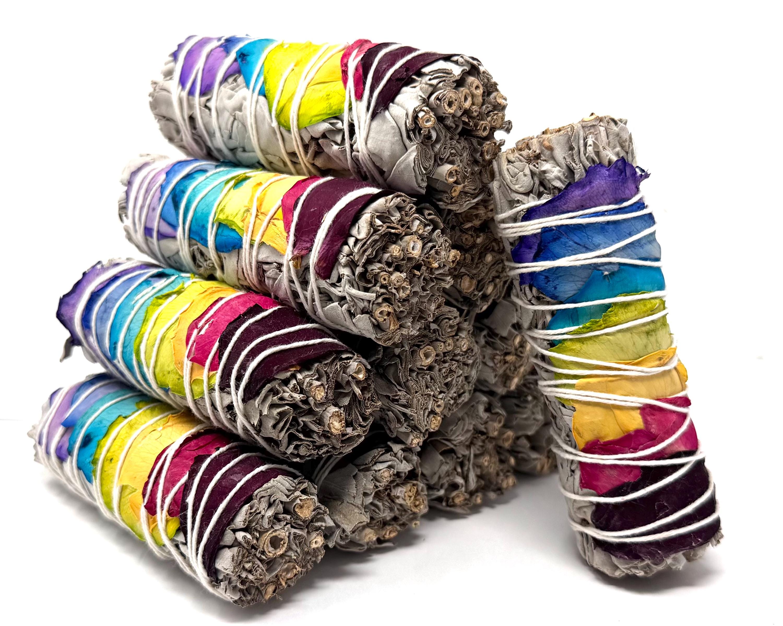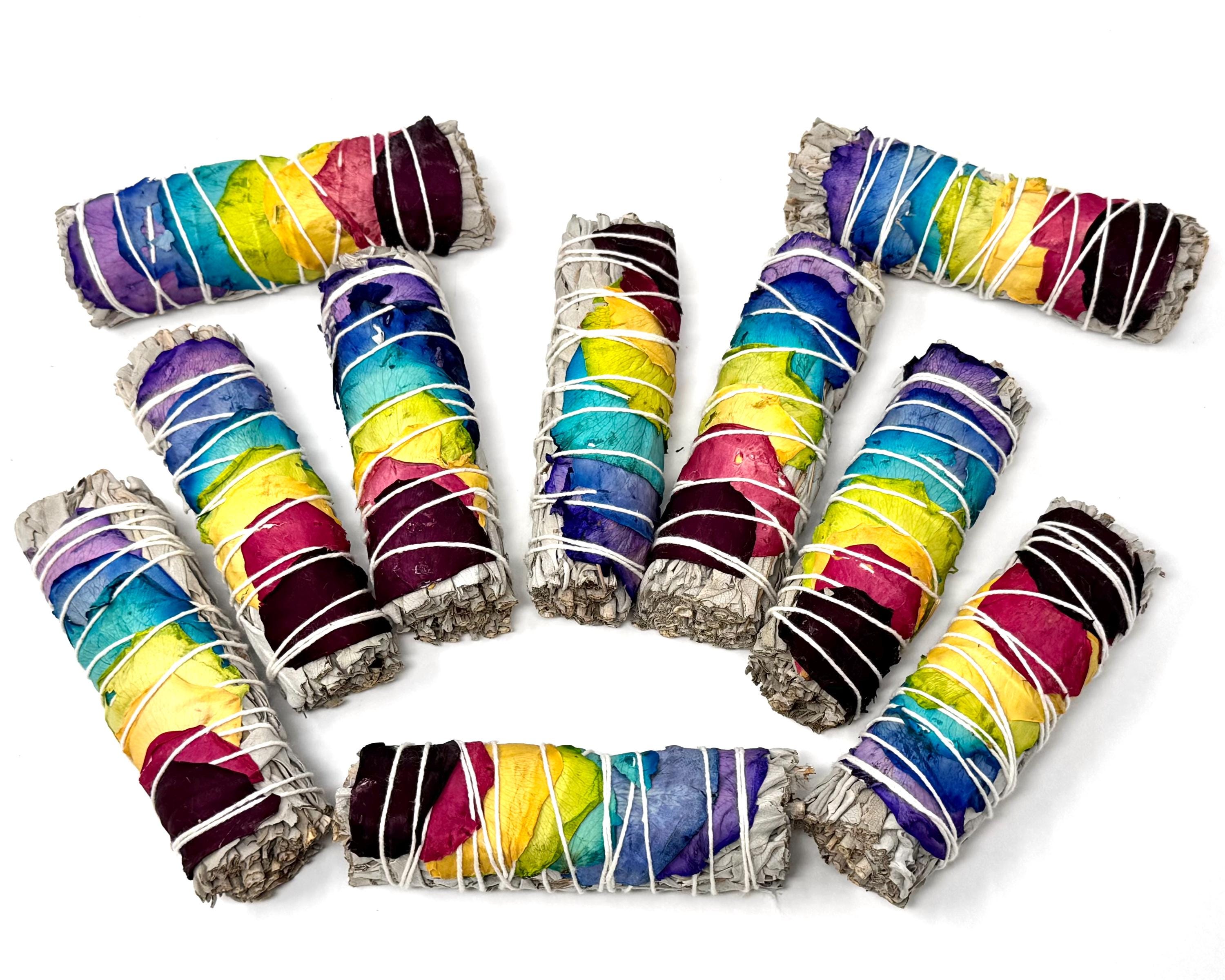 Welcome positive energy and clear your space with our stunning 7 Chakra Rose Petal White Sage Smudge Sticks! Each bundle is meticulously hand-wrapped with ethically sourced White Sage and adorned with vibrant, all natural rose petals representing the major Chakras. This is more than just a cleansing tool - its a ritual for balance and renewal. The Chakra Rose Petals are applied to align with the Seven Chakras, promoting balance, healing, and spiritual harmony during your smudging ritual.
