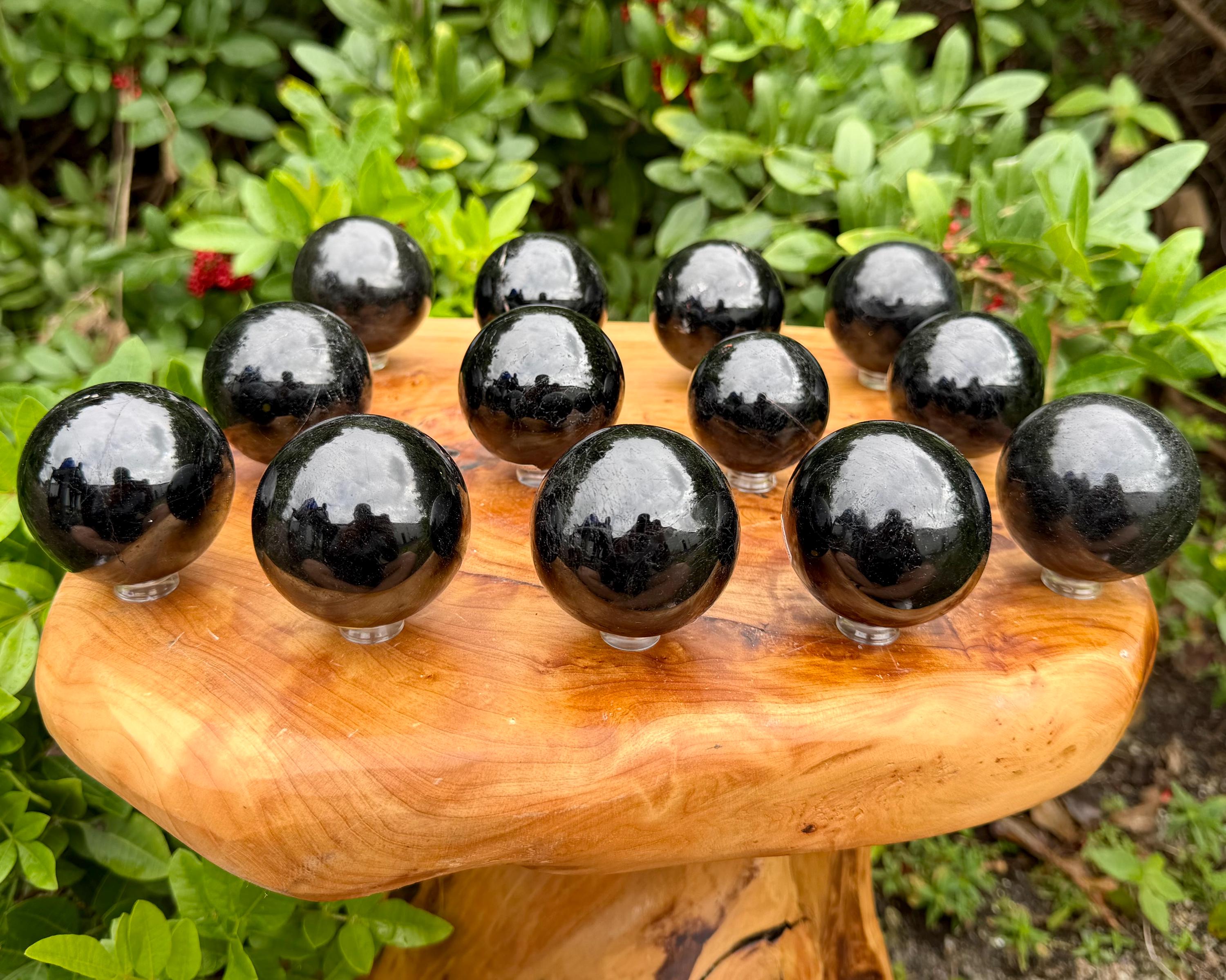 Magnificent polished Black Tourmaline Spheres from Madagascar. High quality Tourmaline ranging from approximately 1.5 - 2" +/- .