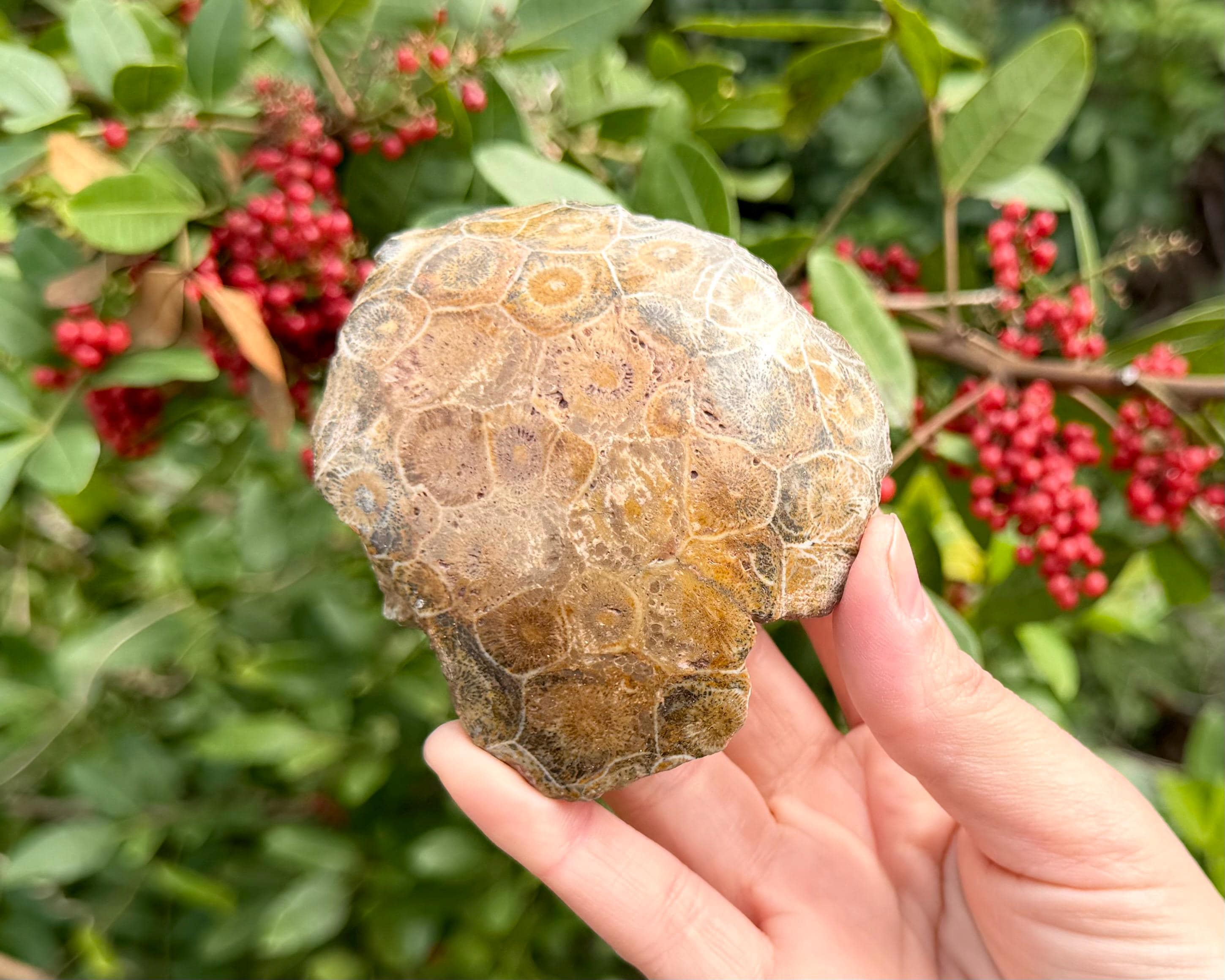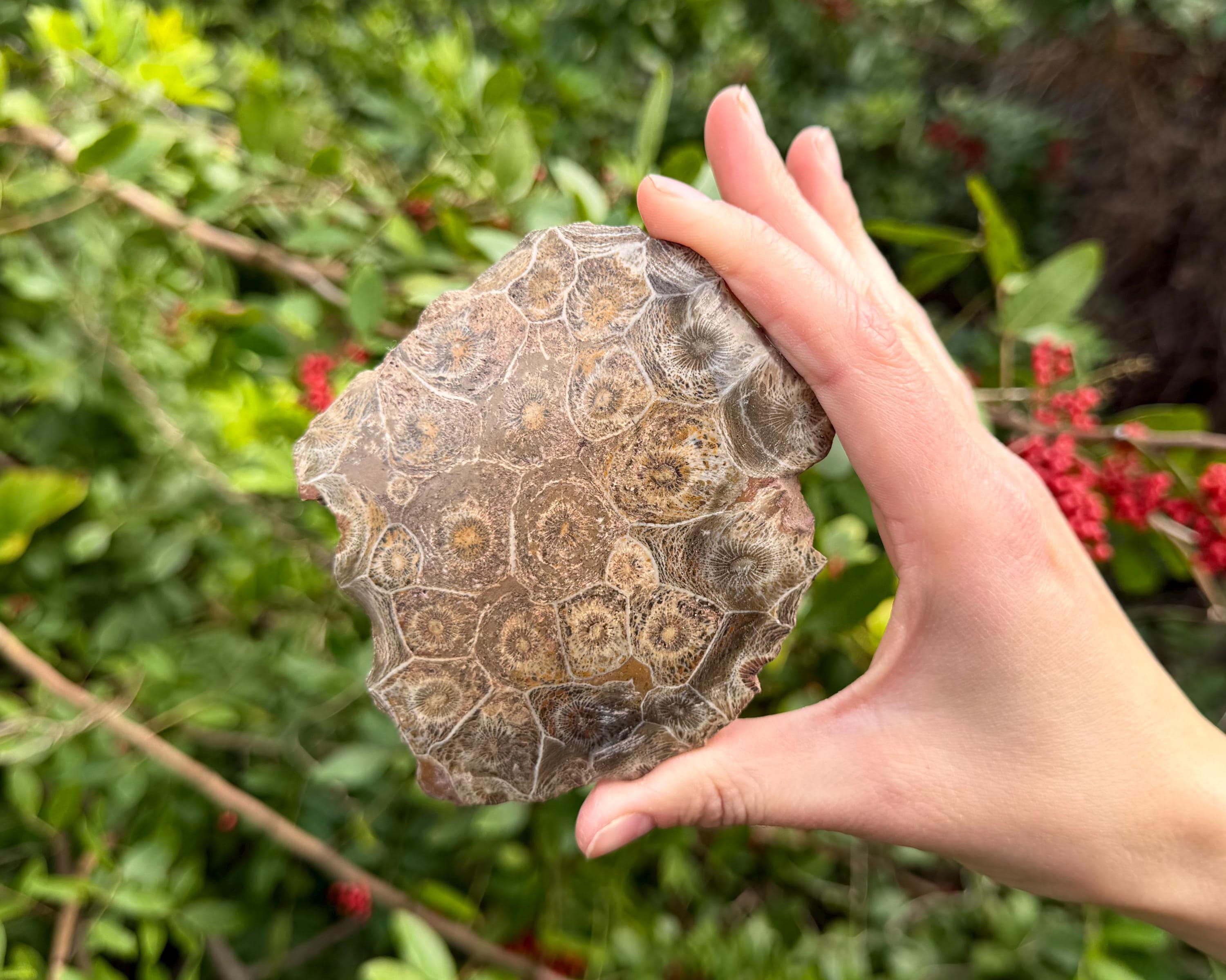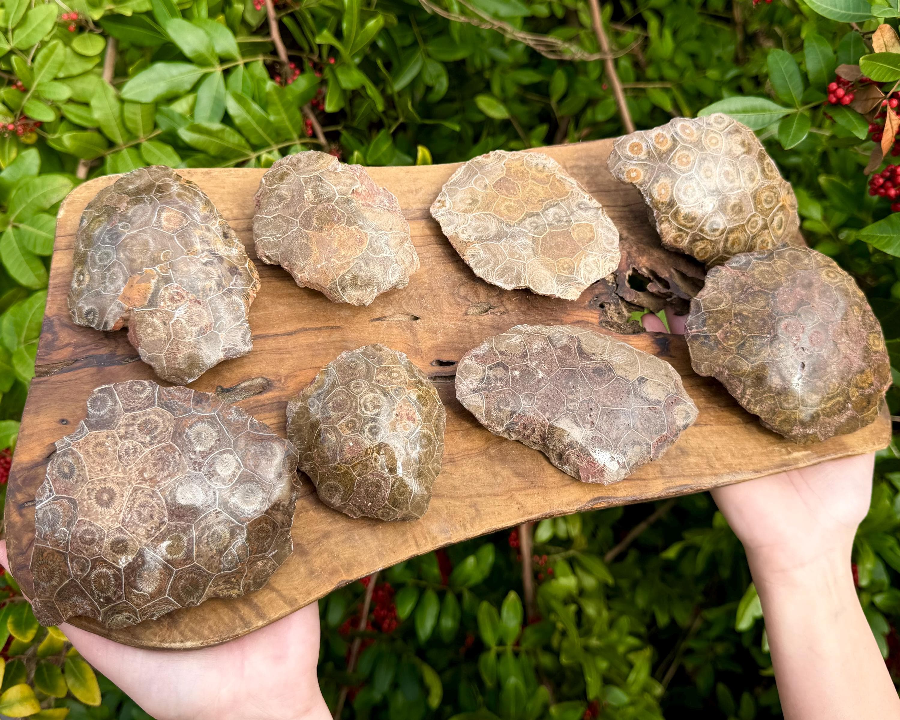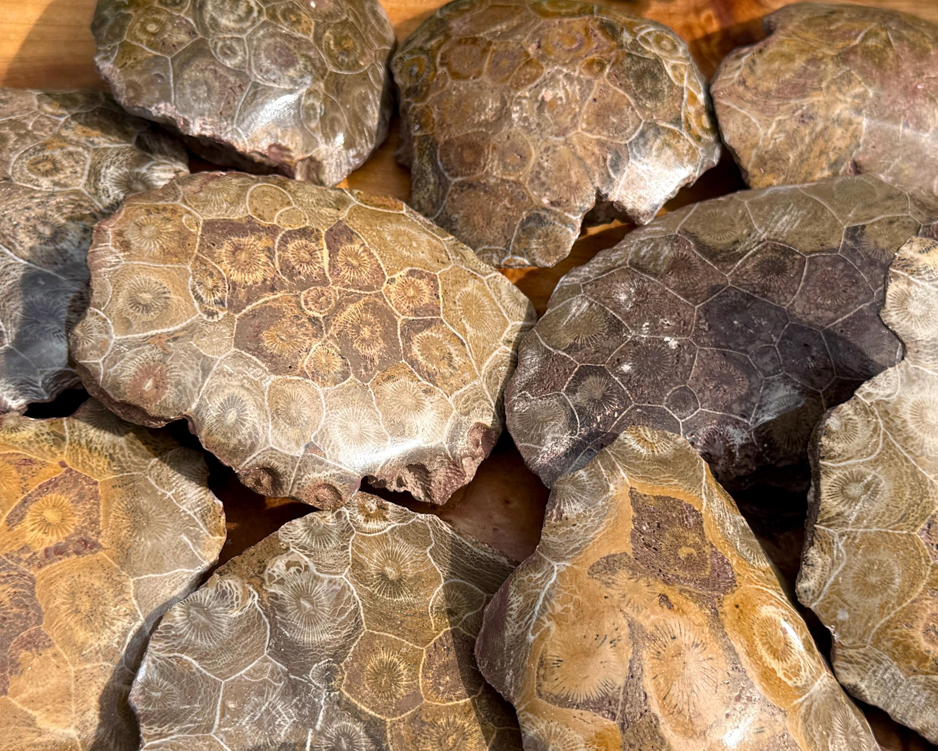Travel back millions of years with these stunning Fossilized Coral Chunks from Morocco. These specimens are agatized, meaning the original organic coral structure has been replaced over eons by silica, preserving the delicate, star flower like patterns of the ancient coral colonies in incredible detail! One side of each chunk has been hand polished to show case the mesmerizing patterns, while the other side remains in its raw, natural state to display the authentic texture of the Fossil. Wonderful additions to any collection!