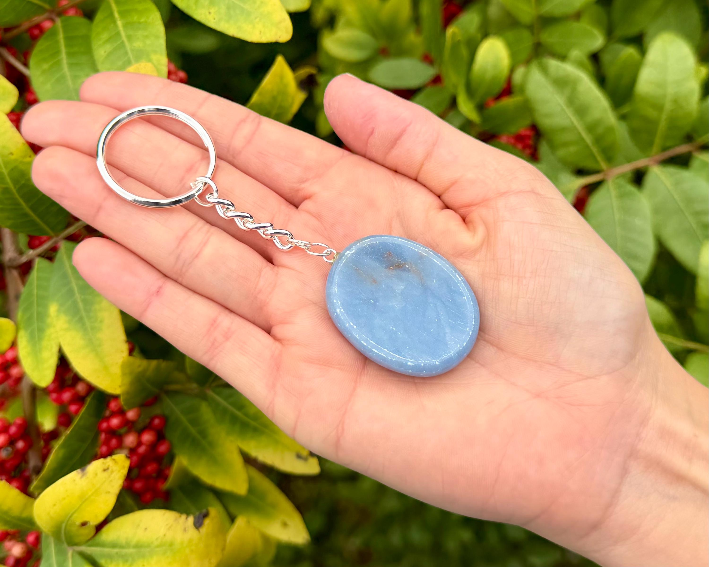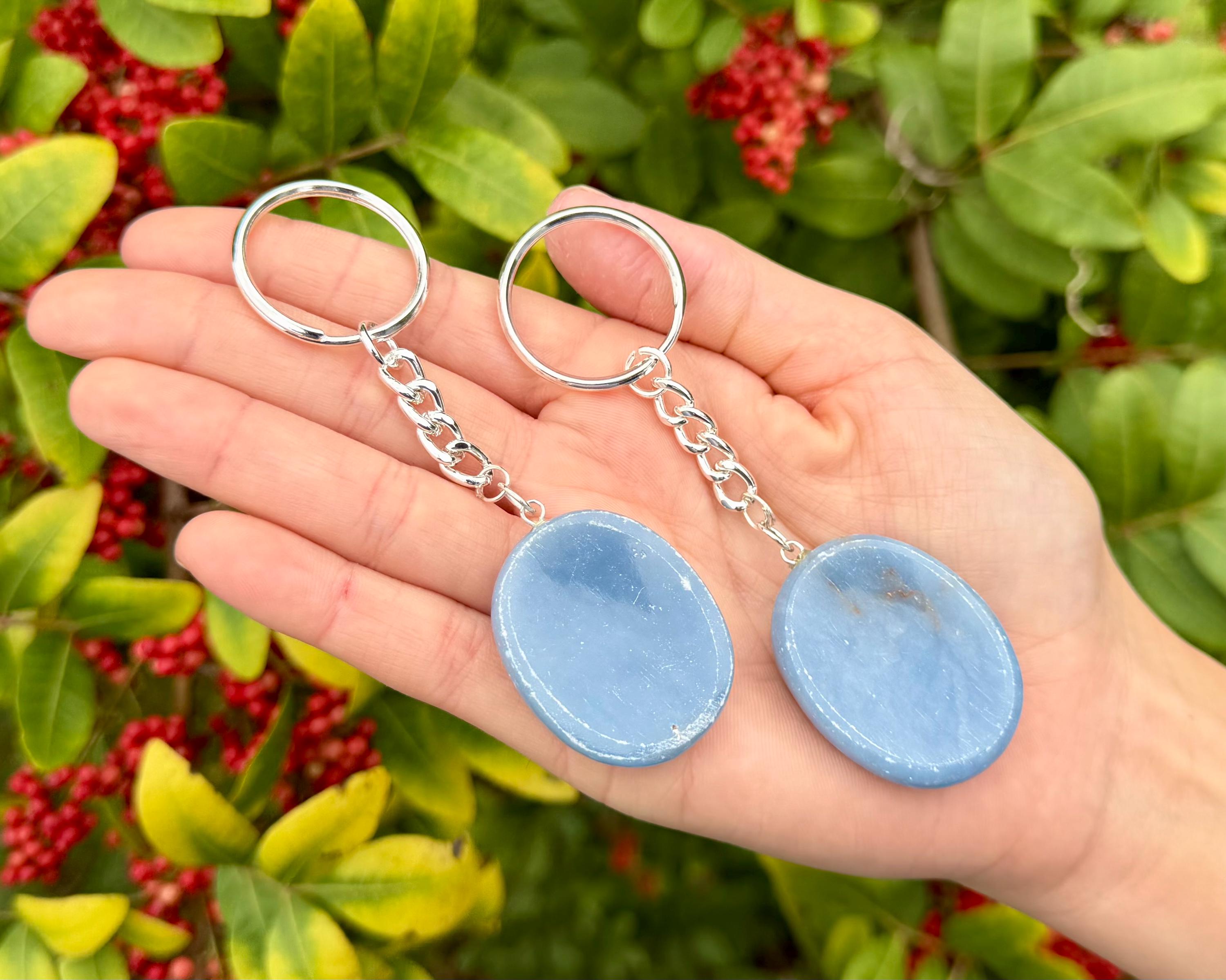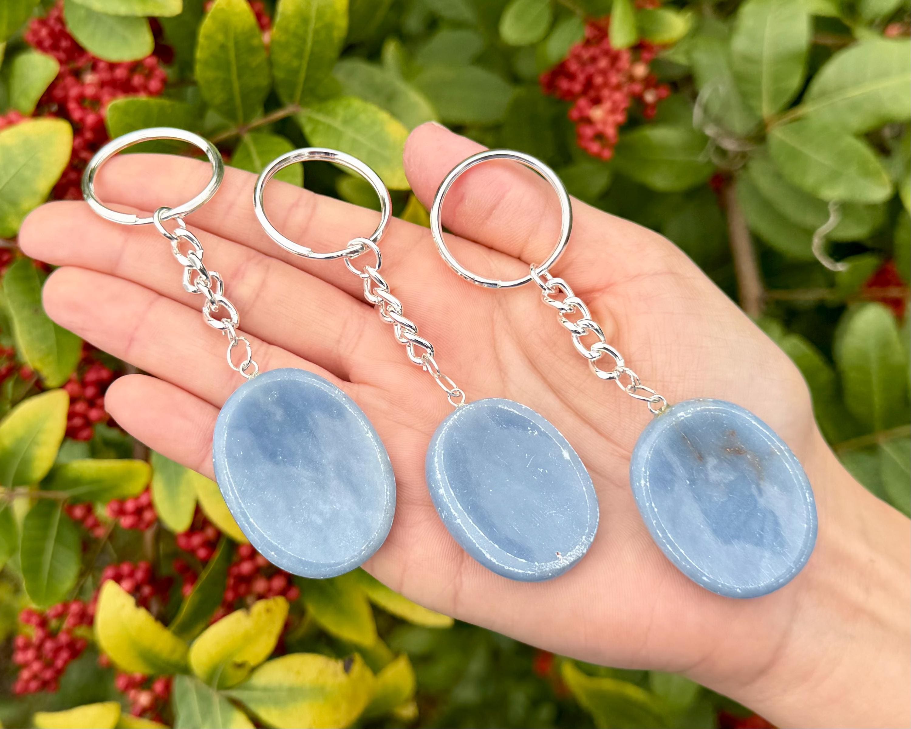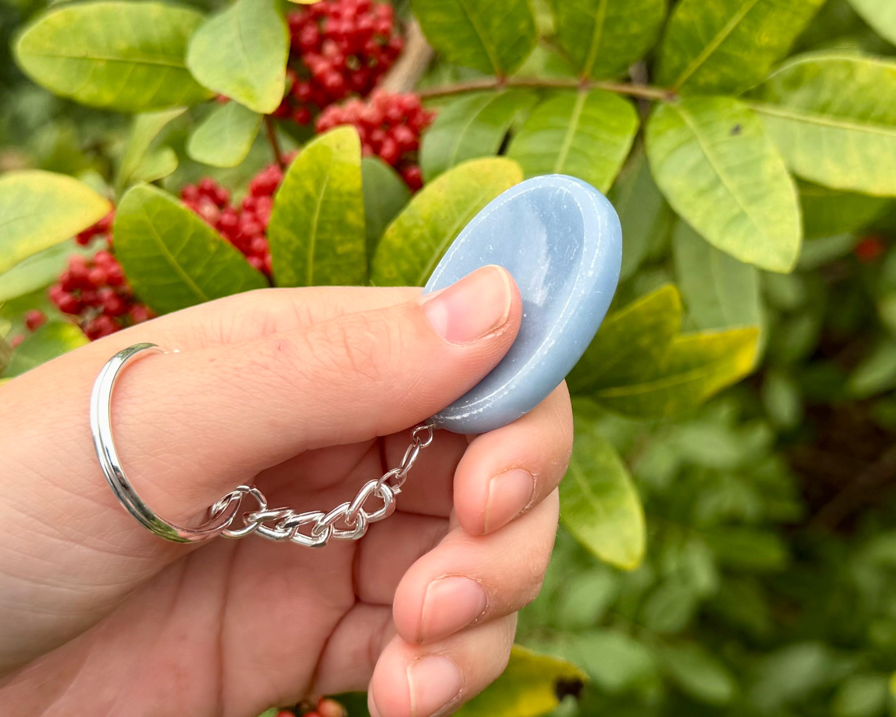 Beautiful Angelite Worry Stone Key Chains about 1.5" in size. Bring the grounding and calming energy of natural crystals into your daily hustle. These Worry Stone Key chains feature a smooth, ergonomic indentation perfectly for your thumb. When life gets overwhelming, simply rub the surface of the stone. This tactile practice is a time tested way to sooth stress, improve focus, and find a moment of Zen in a busy day. Now with the added benefit of having them with your keys, something we cant leave the house without!
