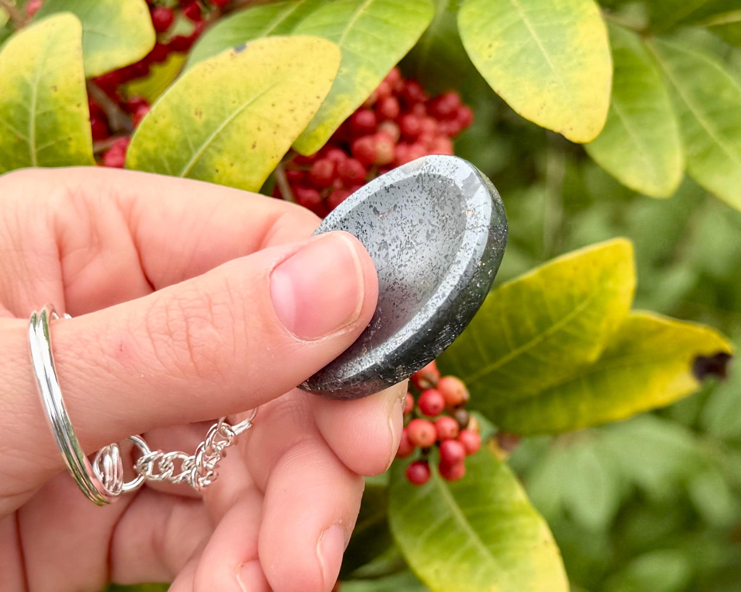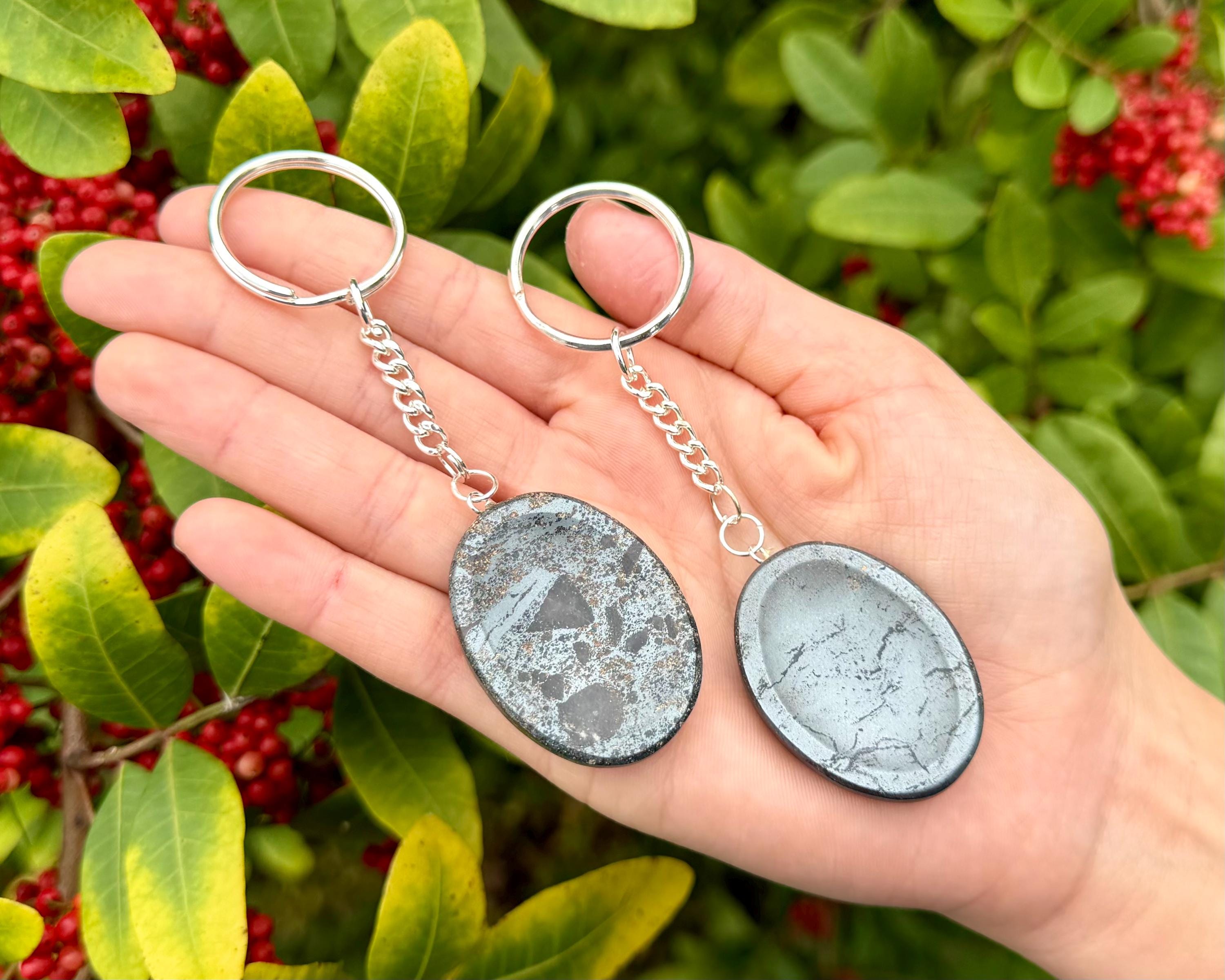 Beautiful Hematite Worry Stone Key Chains about 1.5" in size. Bring the grounding and calming energy of natural crystals into your daily hustle. These Worry Stone Key chains feature a smooth, ergonomic indentation perfectly for your thumb. When life gets overwhelming, simply rub the surface of the stone. This tactile practice is a time tested way to sooth stress, improve focus, and find a moment of Zen in a busy day. Now with the added benefit of having them with your keys, something we cant leave the house without!