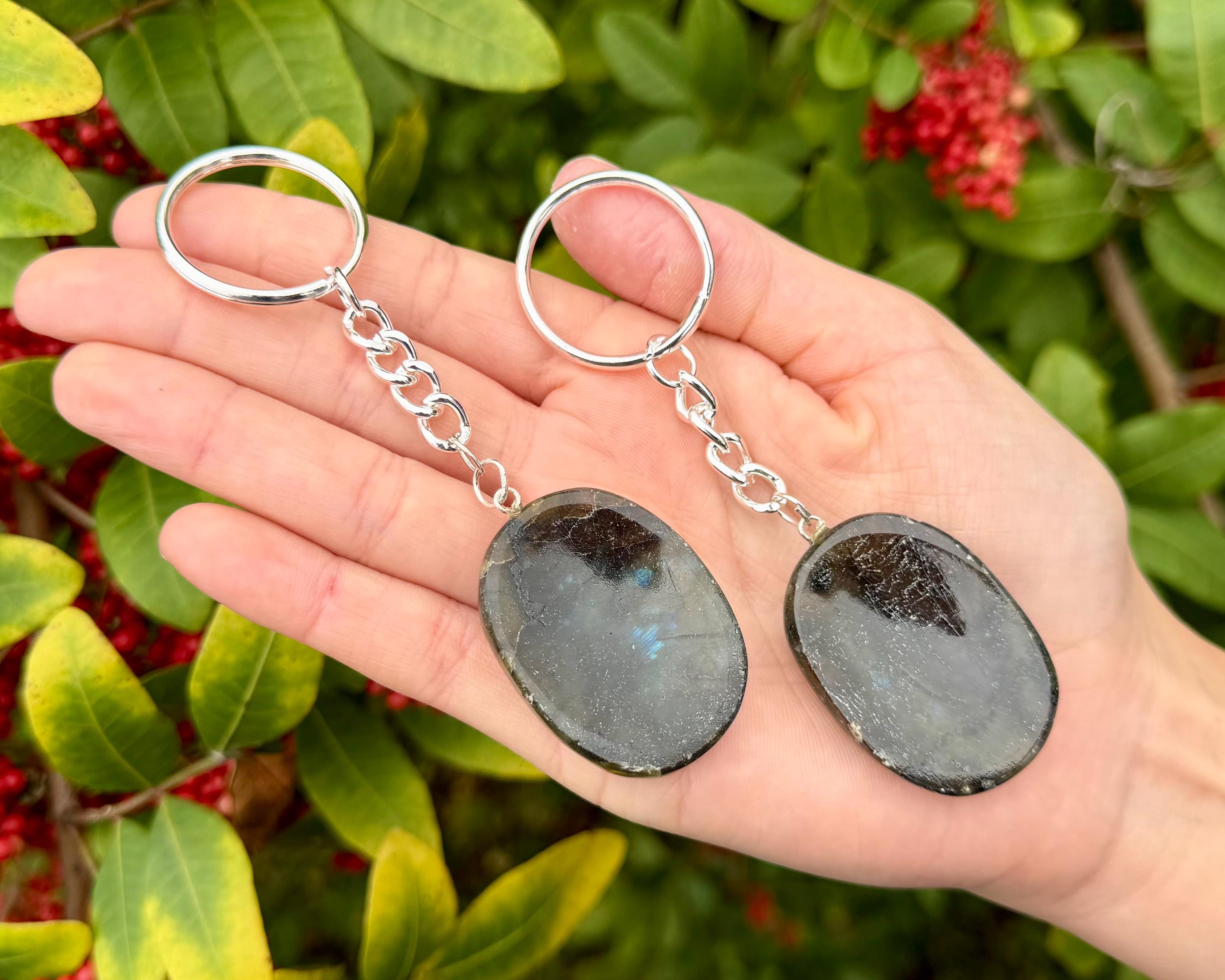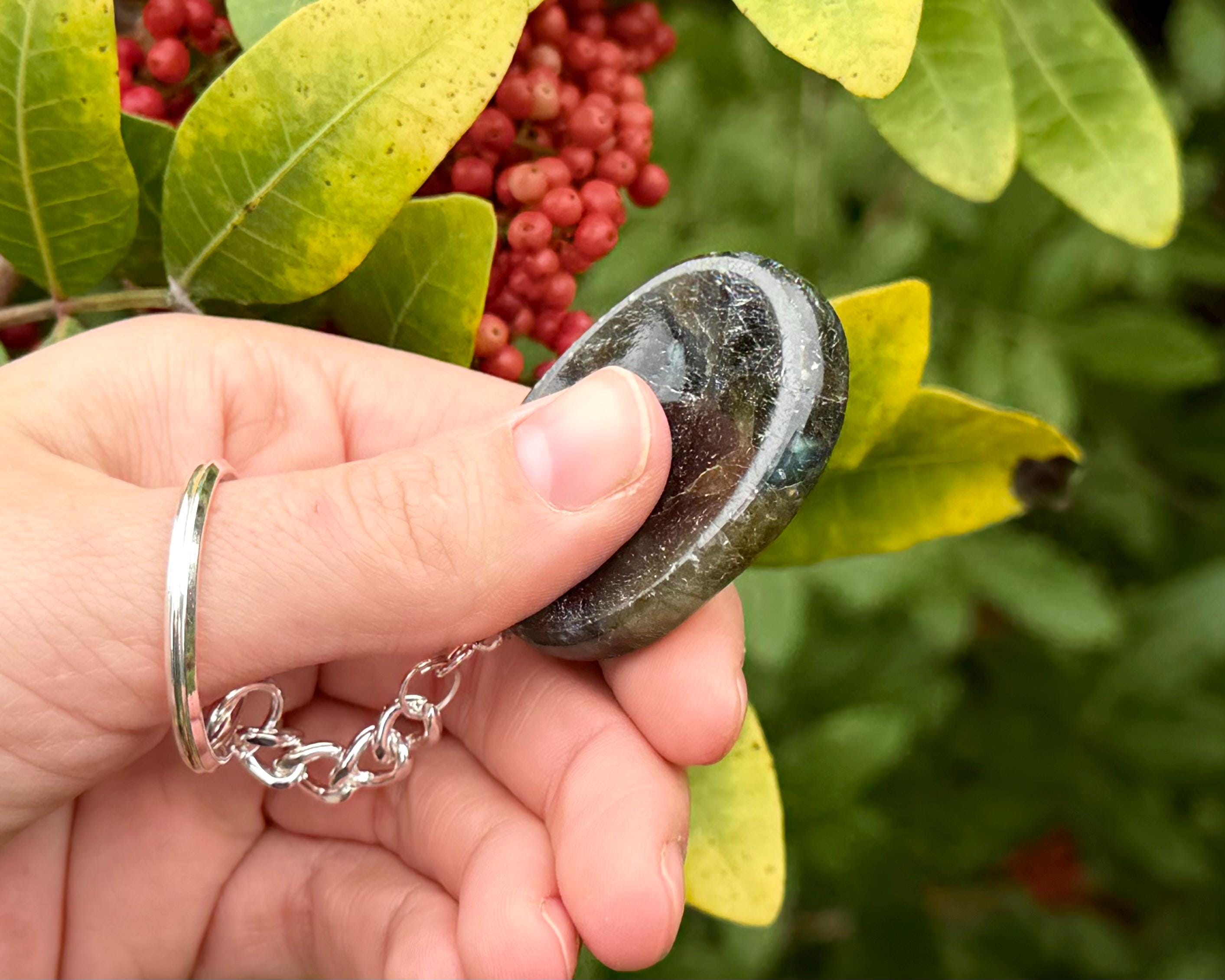 Beautiful Labradorite Worry Stone Key Chains about 1.5" in size. Bring the grounding and calming energy of natural crystals into your daily hustle. These Worry Stone Key chains feature a smooth, ergonomic indentation perfectly for your thumb. When life gets overwhelming, simply rub the surface of the stone. This tactile practice is a time tested way to sooth stress, improve focus, and find a moment of Zen in a busy day. Now with the added benefit of having them with your keys, something we cant leave the house without!
