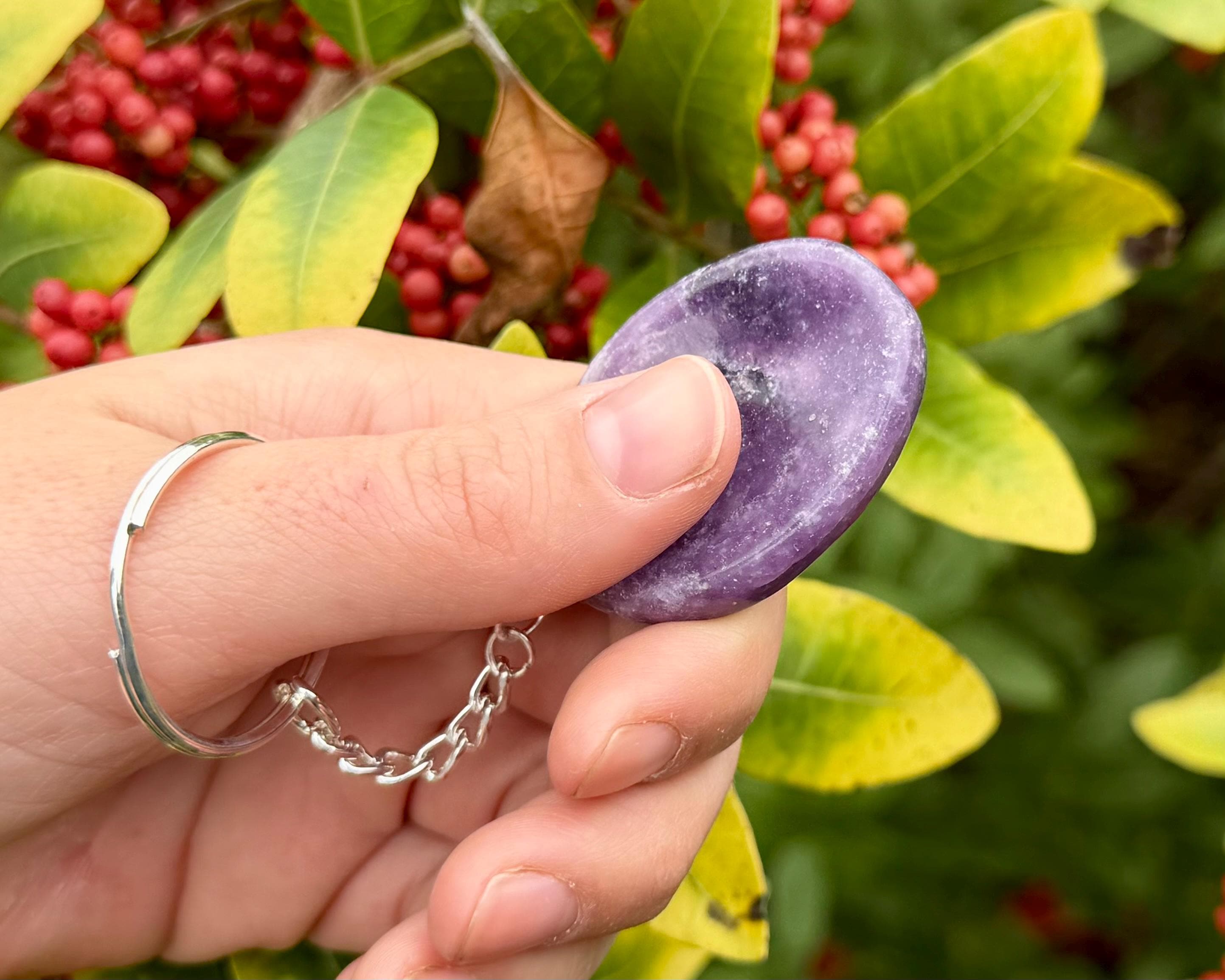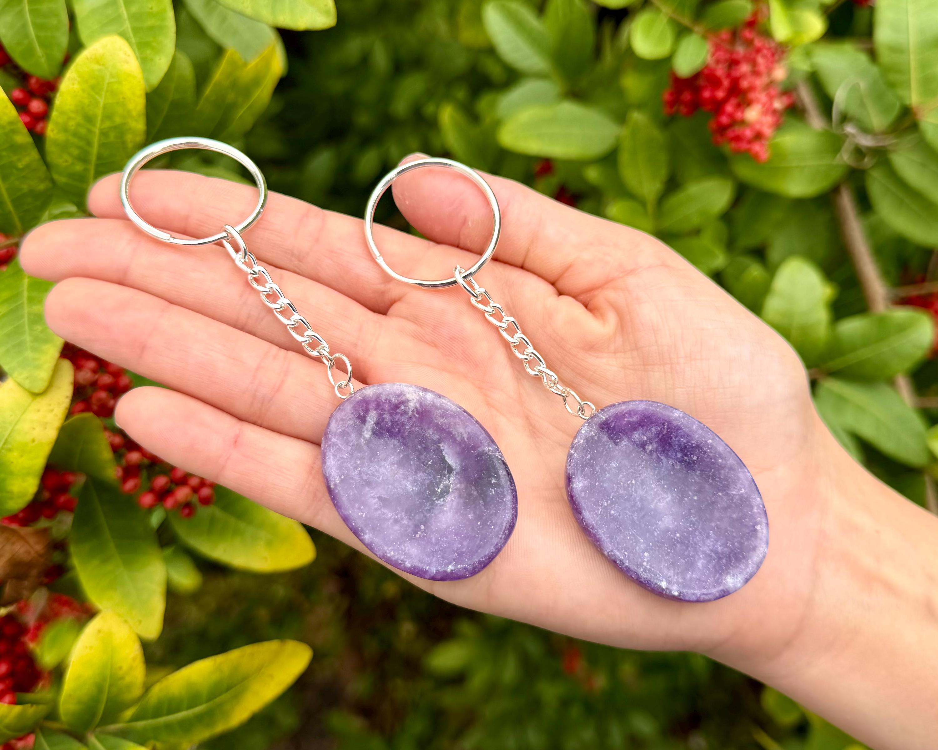 Beautiful Lepidolite Worry Stone Key Chains about 1.5" in size. Bring the grounding and calming energy of natural crystals into your daily hustle. These Worry Stone Key chains feature a smooth, ergonomic indentation perfectly for your thumb. When life gets overwhelming, simply rub the surface of the stone. This tactile practice is a time tested way to sooth stress, improve focus, and find a moment of Zen in a busy day. Now with the added benefit of having them with your keys, something we cant leave the house without!