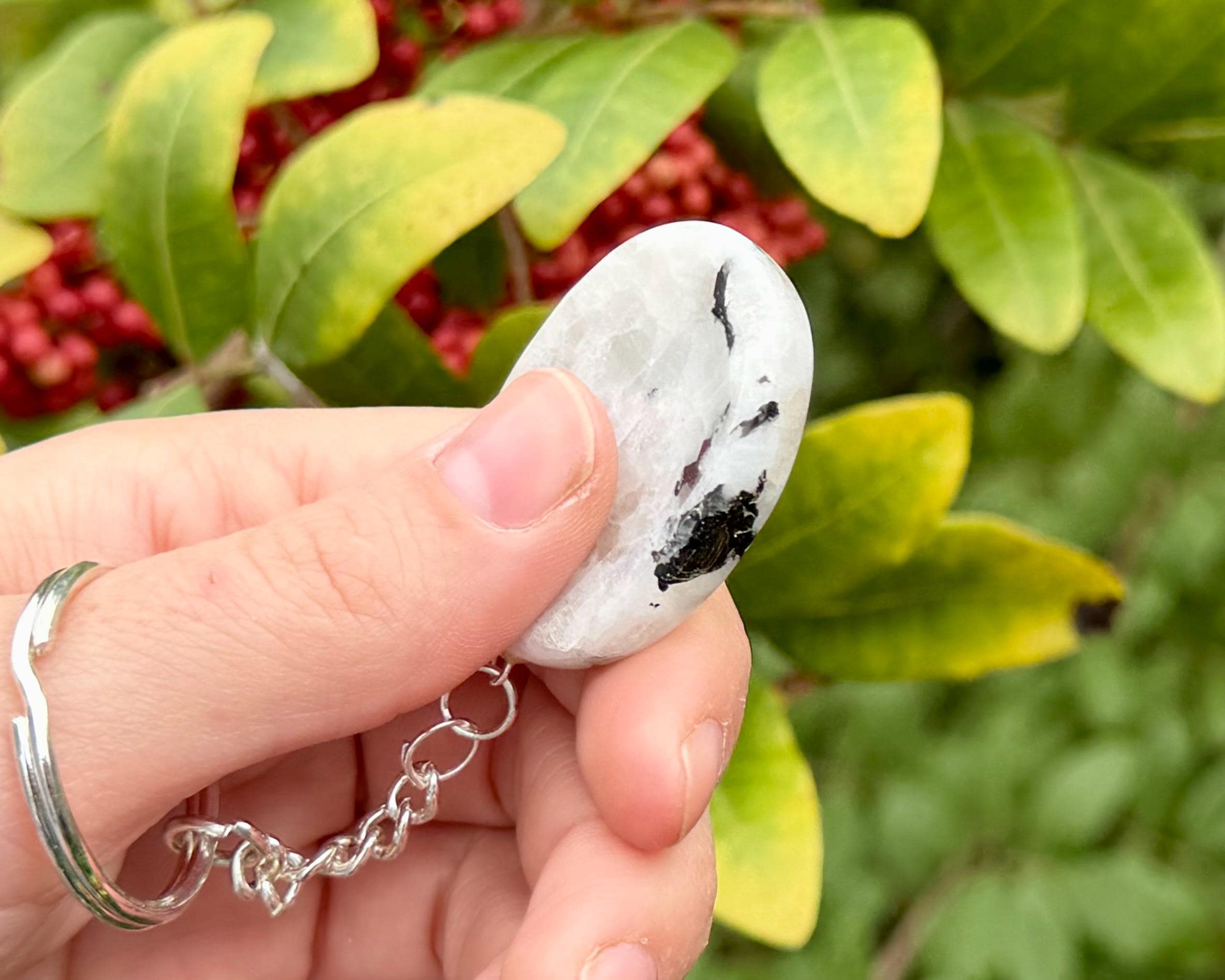 Beautiful Rainbow Moonstone Worry Stone Key Chains about 1.5" in size. Bring the grounding and calming energy of natural crystals into your daily hustle. These Worry Stone Key chains feature a smooth, ergonomic indentation perfectly for your thumb. When life gets overwhelming, simply rub the surface of the stone. This tactile practice is a time tested way to sooth stress, improve focus, and find a moment of Zen in a busy day. Now with the added benefit of having them with your keys, something we cant leave the house without!