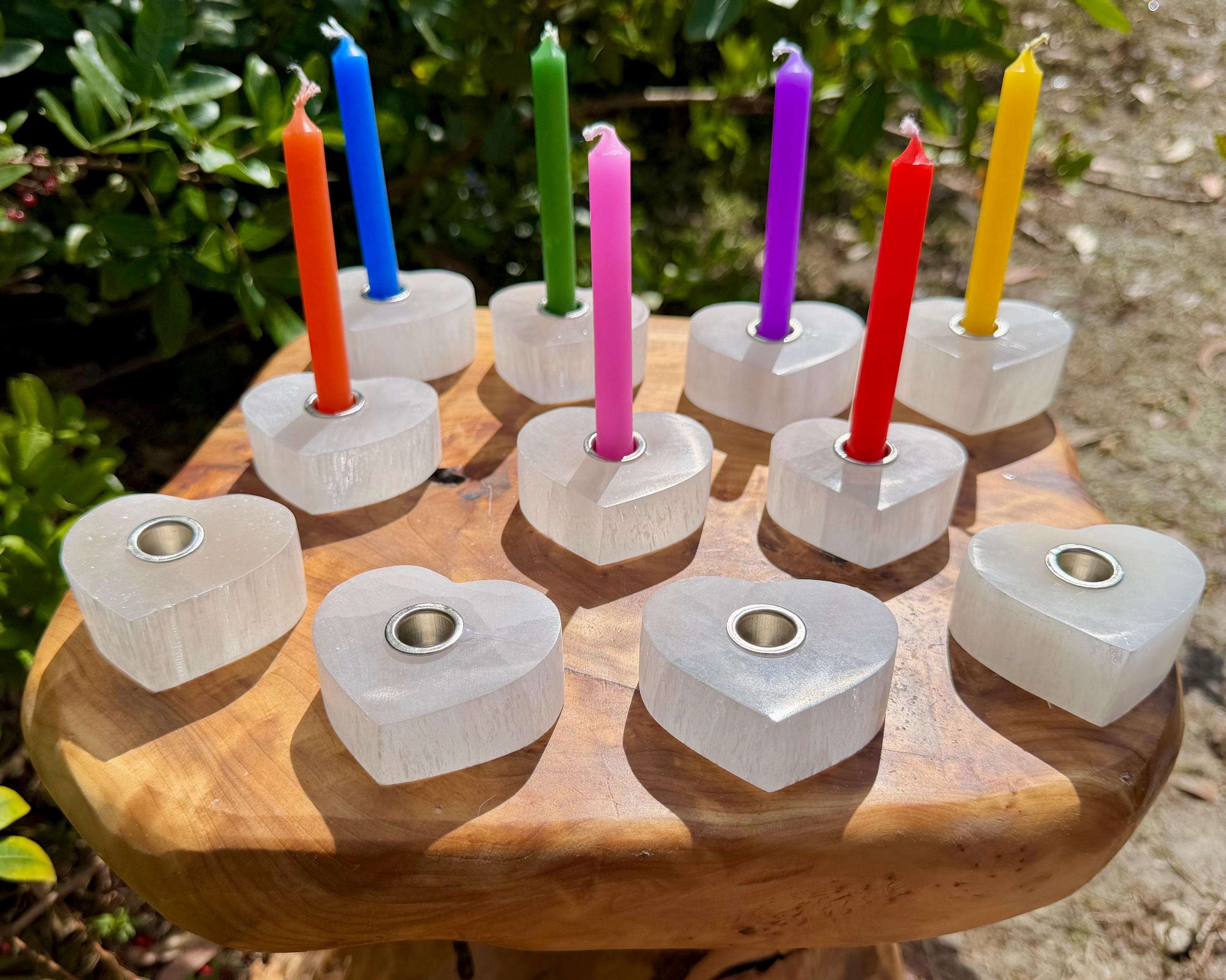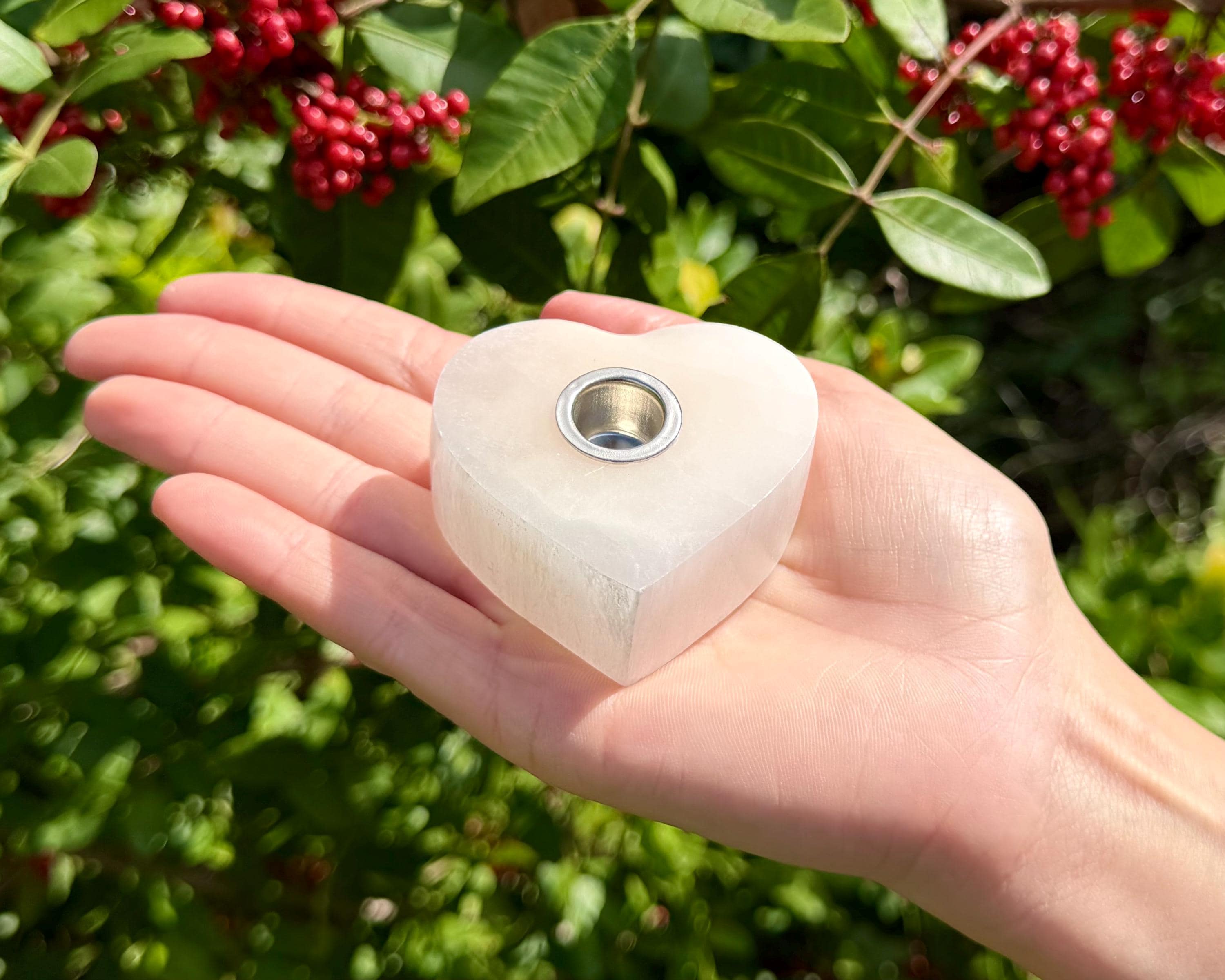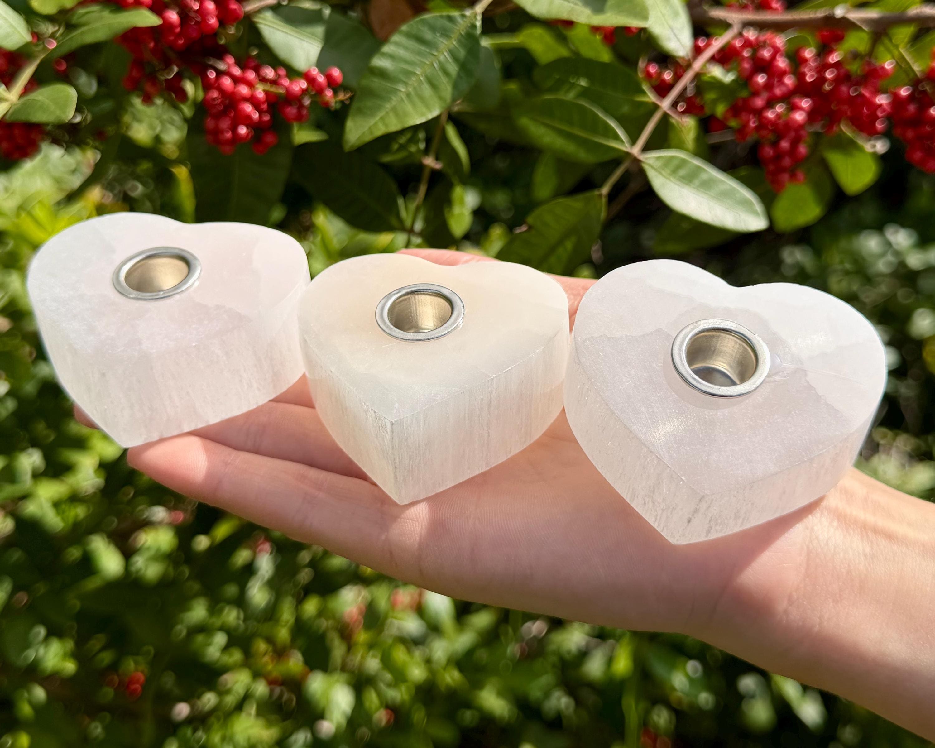 Beautiful carved white Selenite Heart Chime Candle holders. Each piece is about 2.25" wide and 0.85" tall and are designed for chime / ritual / spell candles with a 1/2" diameter base. These beautiful calming additions to any space are perfect for meditation as well as decoration. Known for its powerful cleansing properties, Selenite helps to clear the negative energy and amplify the vibrations of other crystals placed within in. Perfect for recharging your favorite gemstones or simply adding a touch of ethereal beauty to your home.