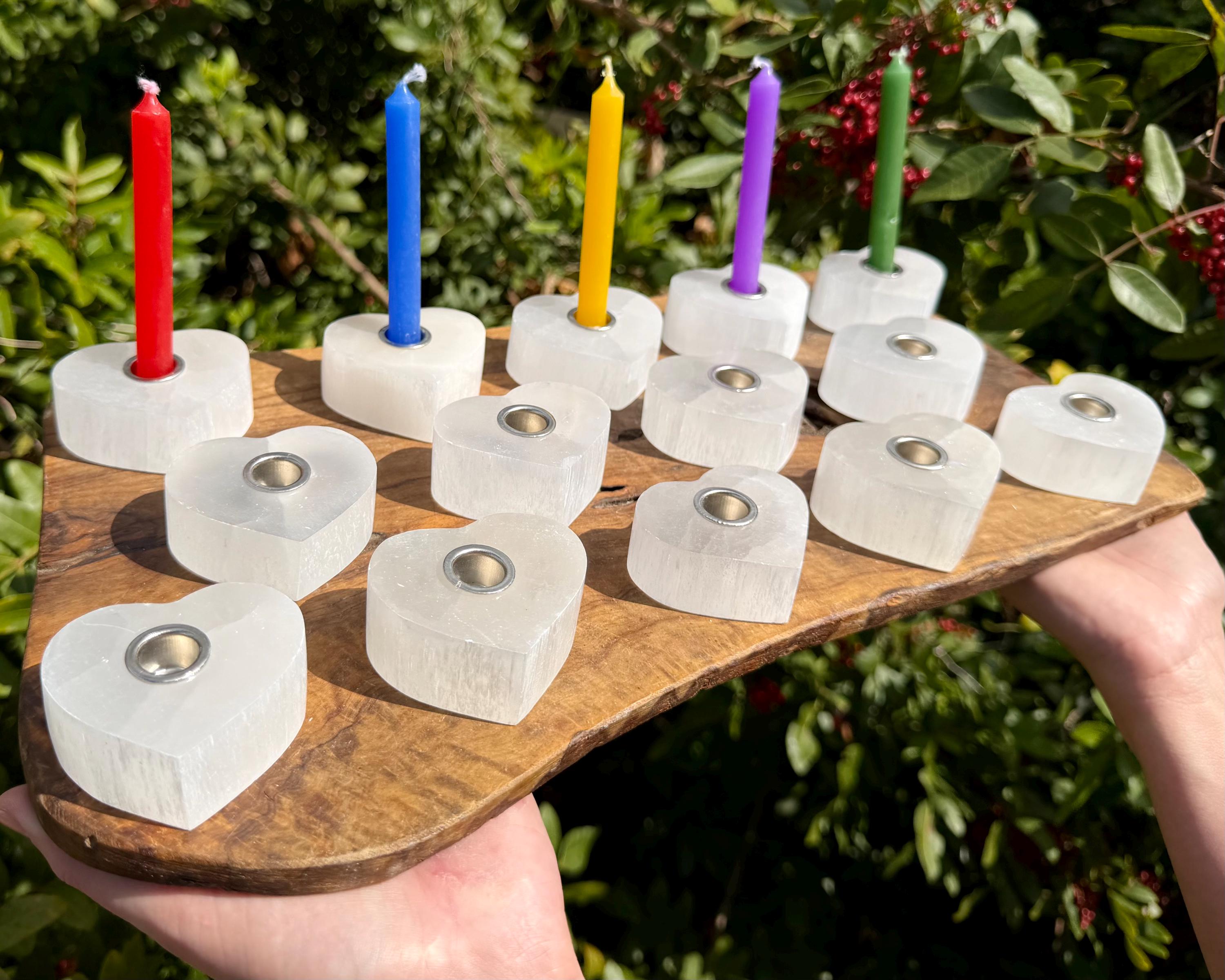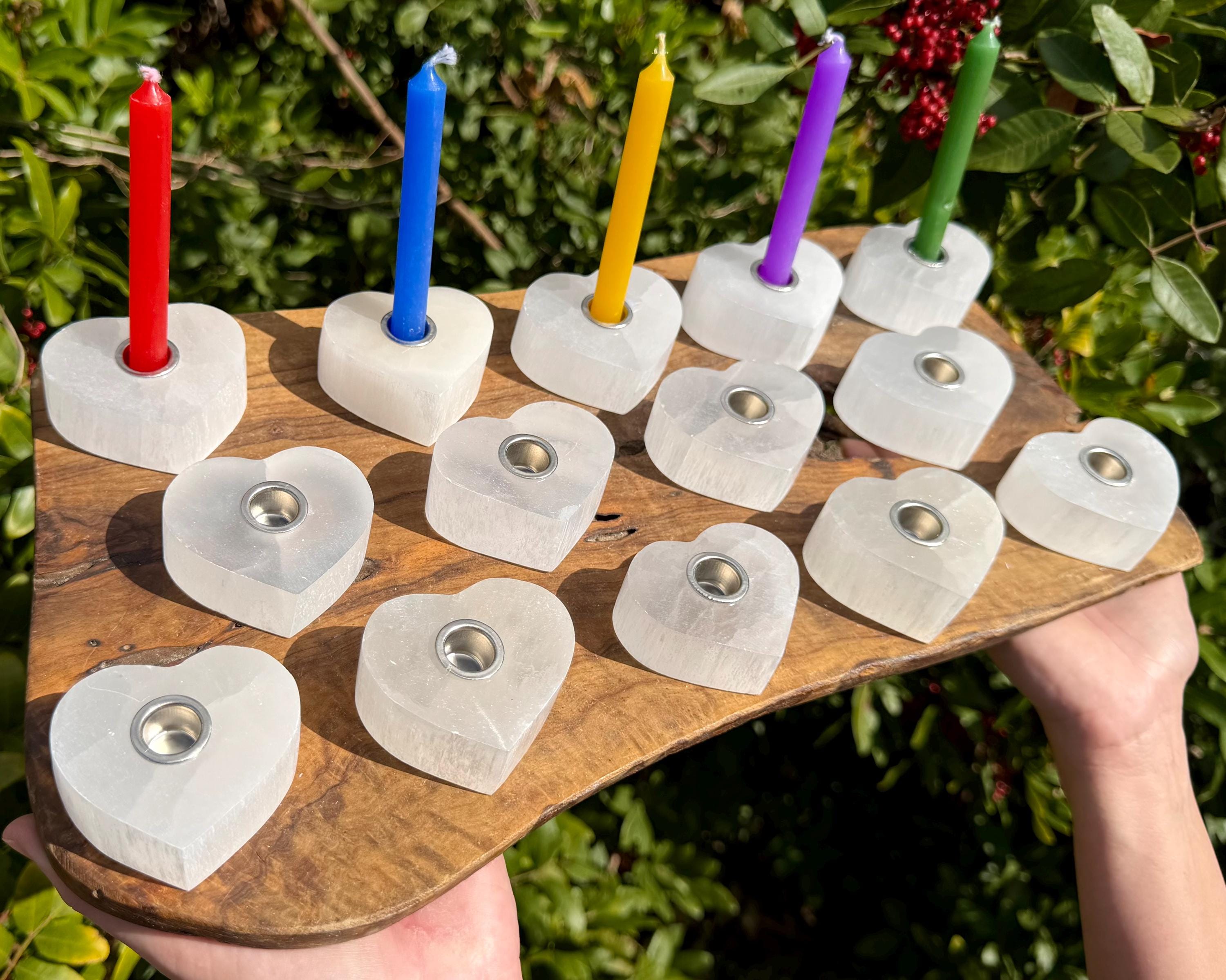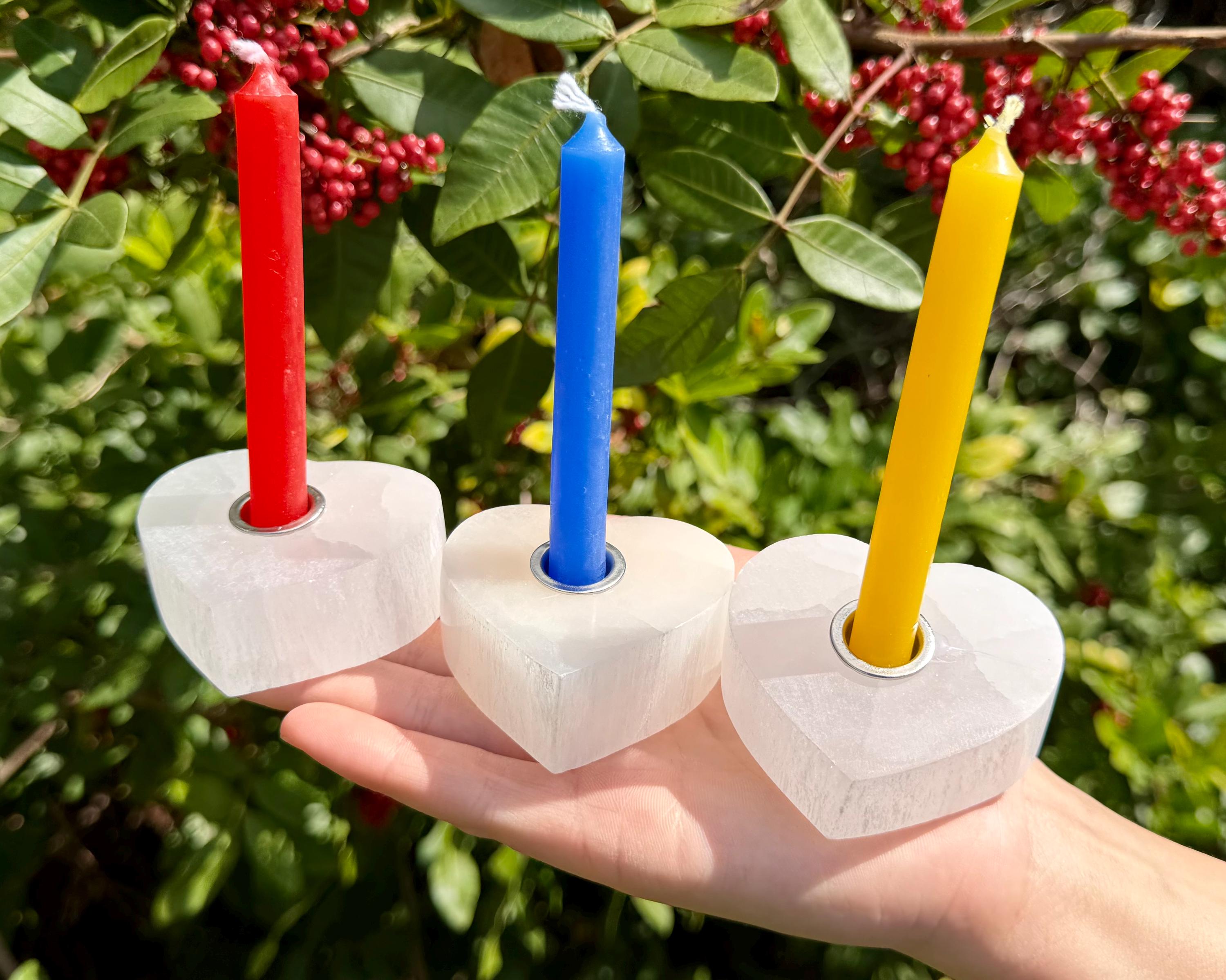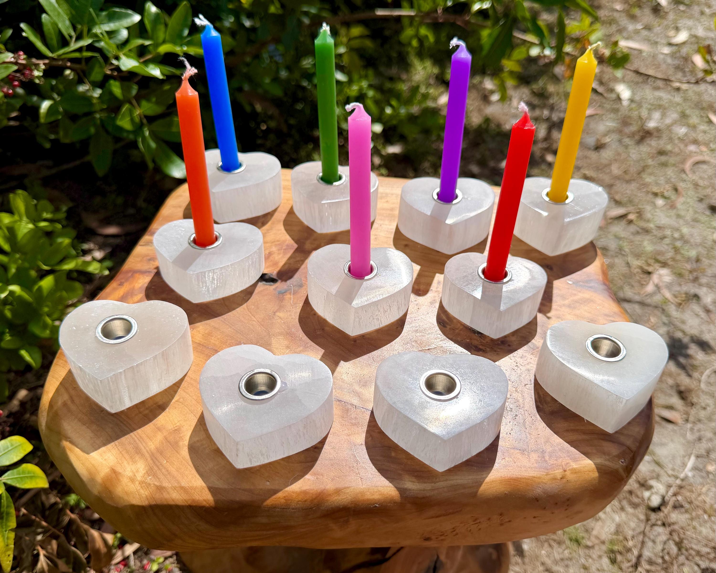 Beautiful carved white Selenite Heart Chime Candle holders. Each piece is about 2.25" wide and 0.85" tall and are designed for chime / ritual / spell candles with a 1/2" diameter base. These beautiful calming additions to any space are perfect for meditation as well as decoration. Known for its powerful cleansing properties, Selenite helps to clear the negative energy and amplify the vibrations of other crystals placed within in. Perfect for recharging your favorite gemstones or simply adding a touch of ethereal beauty to your home.