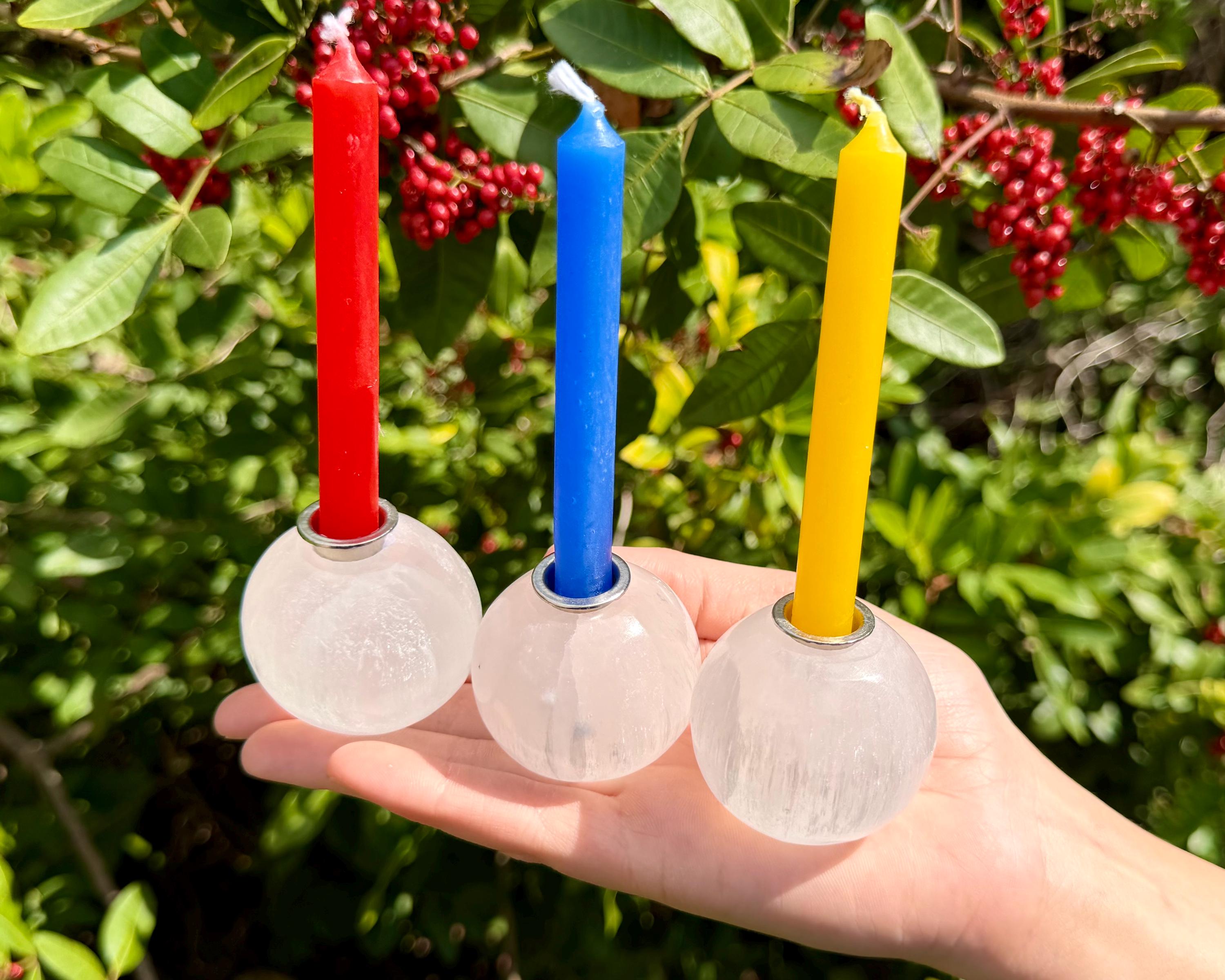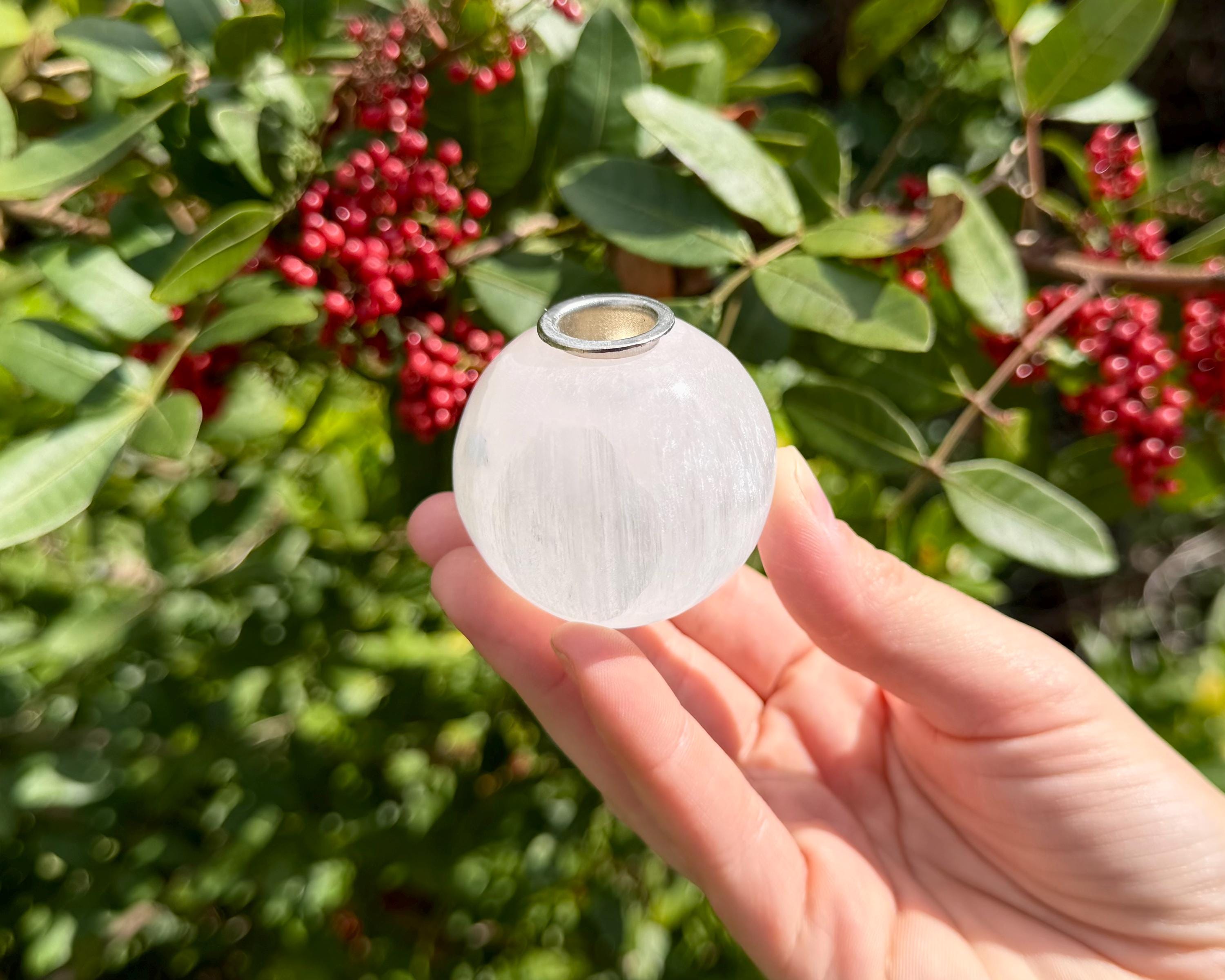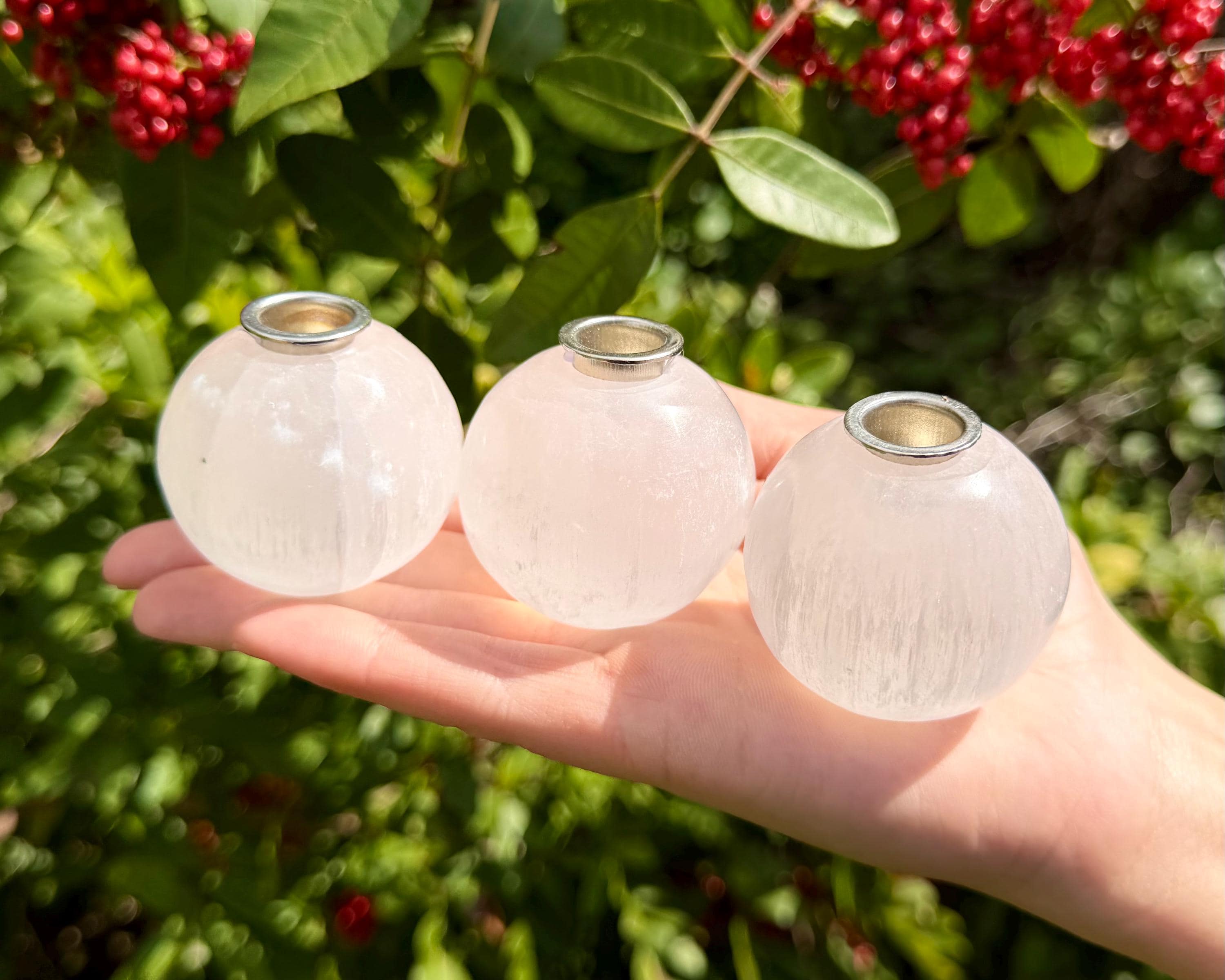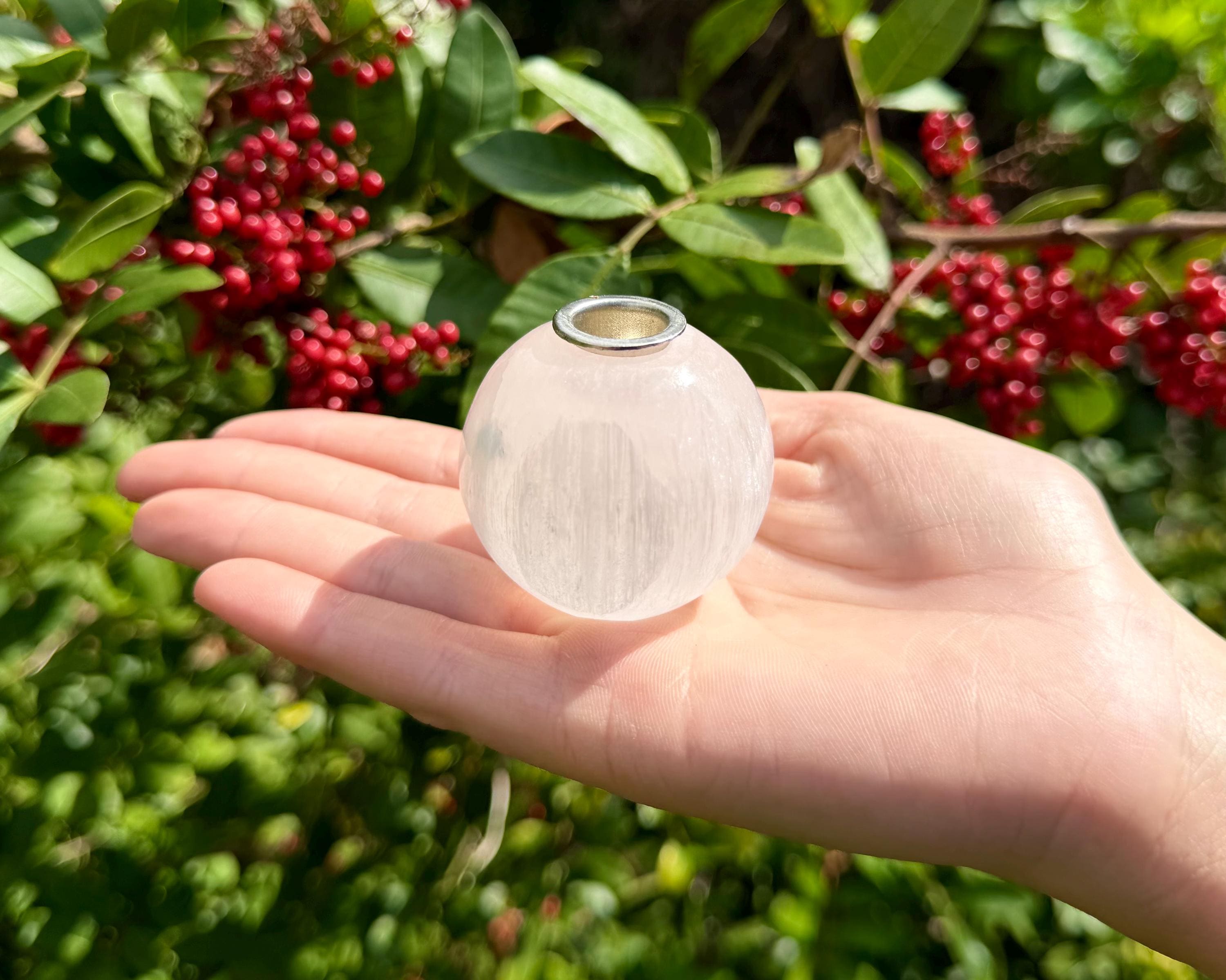 Beautiful carved white Selenite Sphere Chime Candle holders. Each piece is about 1.75 - 2" wide and 1.75" tall and are designed for chime / ritual / spell candles with a 1/2" diameter base. These beautiful calming additions to any space are perfect for meditation as well as decoration. Known for its powerful cleansing properties, Selenite helps to clear the negative energy and amplify the vibrations of other crystals placed within in. Perfect for recharging your favorite gemstones or simply adding a touch of ethereal beauty to your home.