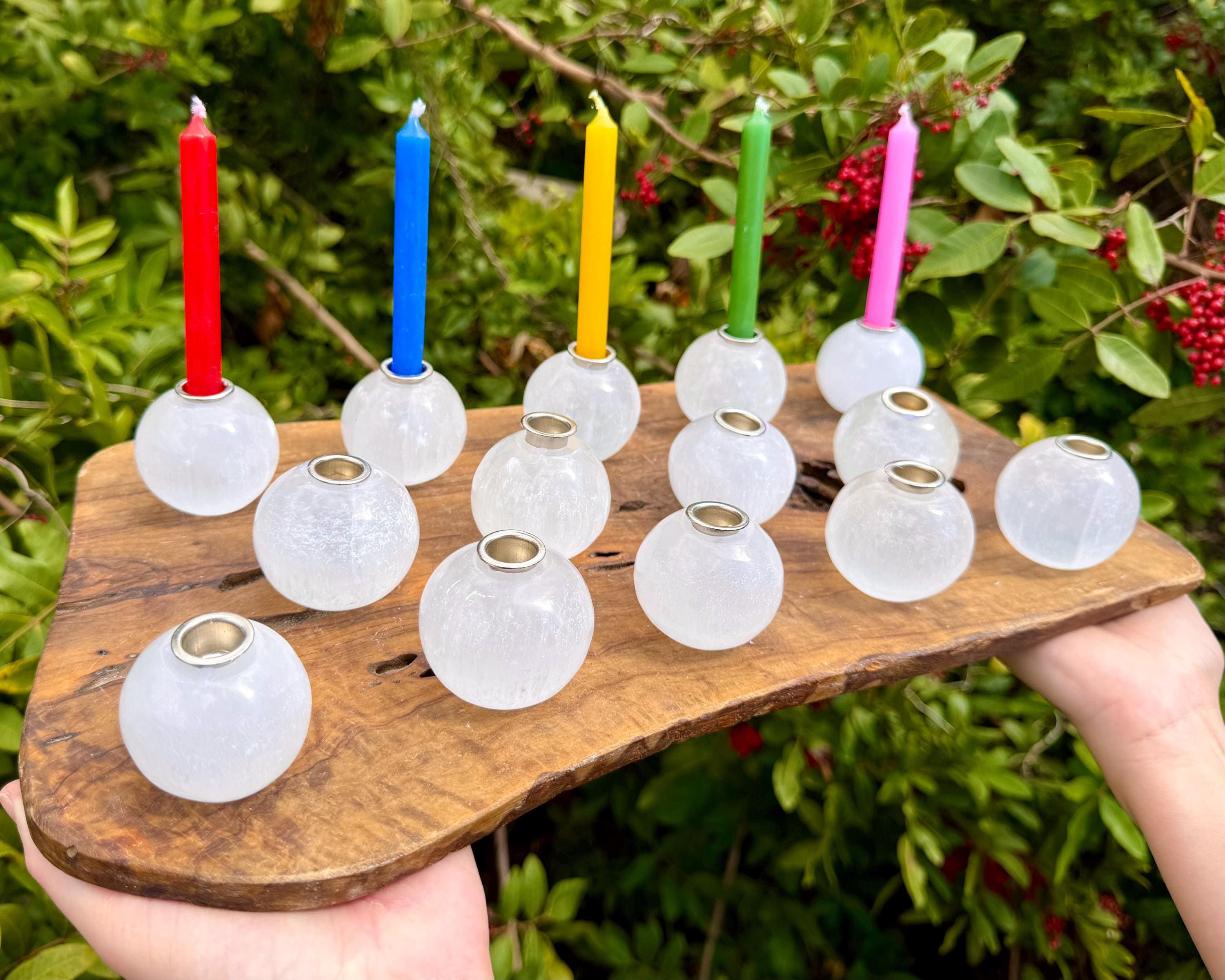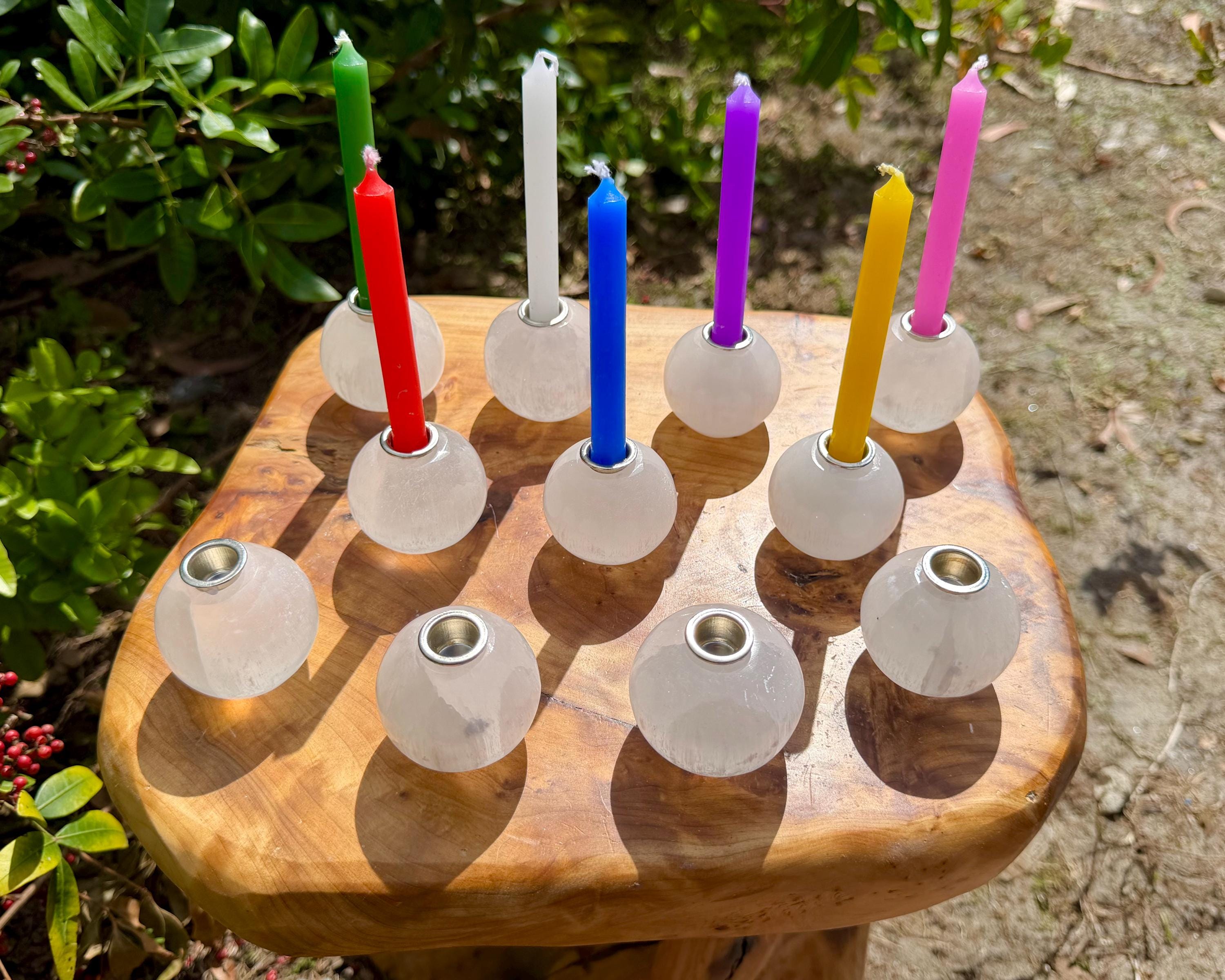 Selenite scratches, chips, dents, and fractures very easily. Due to its soft nature, please expect all Selenite products to have some minor 'imperfections'. We have posted pictures of multiple angles to give you an idea of the variance in size and shape from piece to piece. Please note that the sale is for the candle holder only - candles are not included.