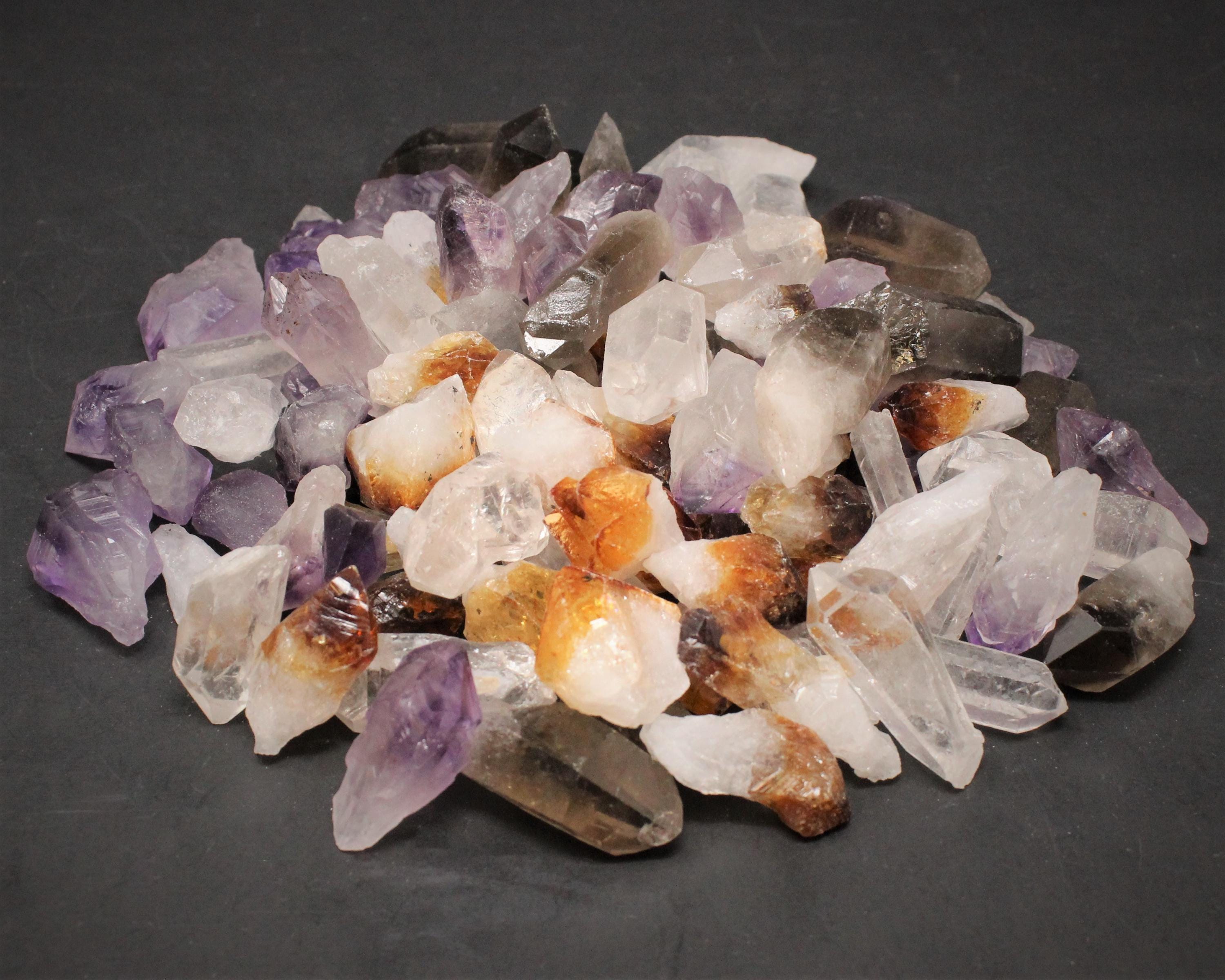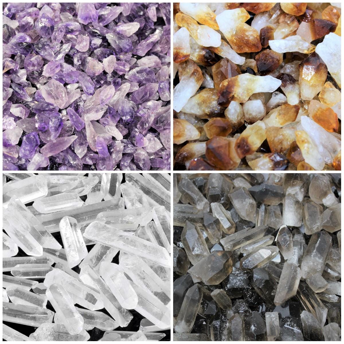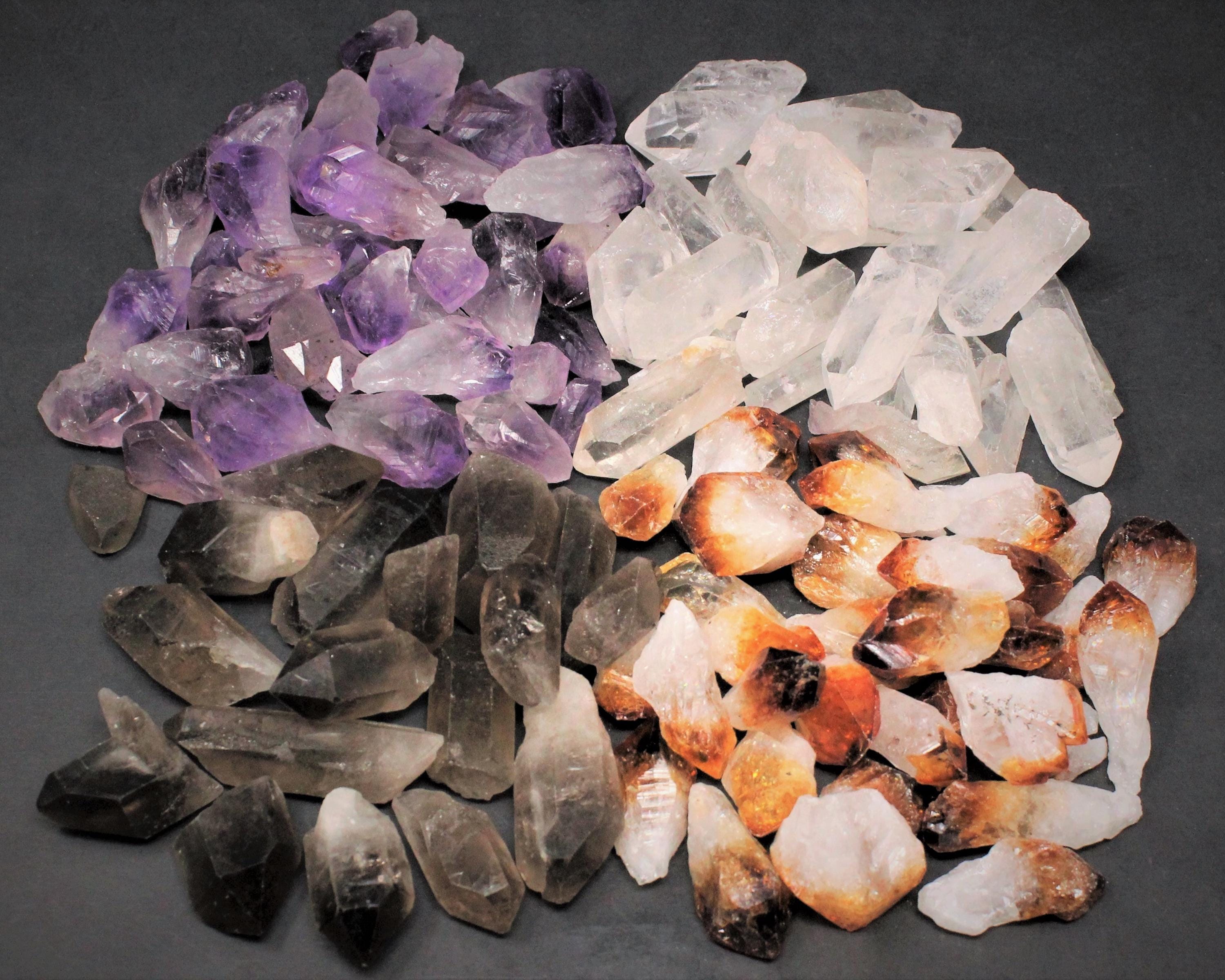 Beautiful Mixed lot of Amethyst, Citrine, Clear Quartz and Smoky Quartz Crystal Points - sold in 8 oz (1/2 lb) Box Lots. Box measures 4" x 3" x 1". Each box will contain 2 oz each of all 4 points totaling 8 ounces (1/2 lb).