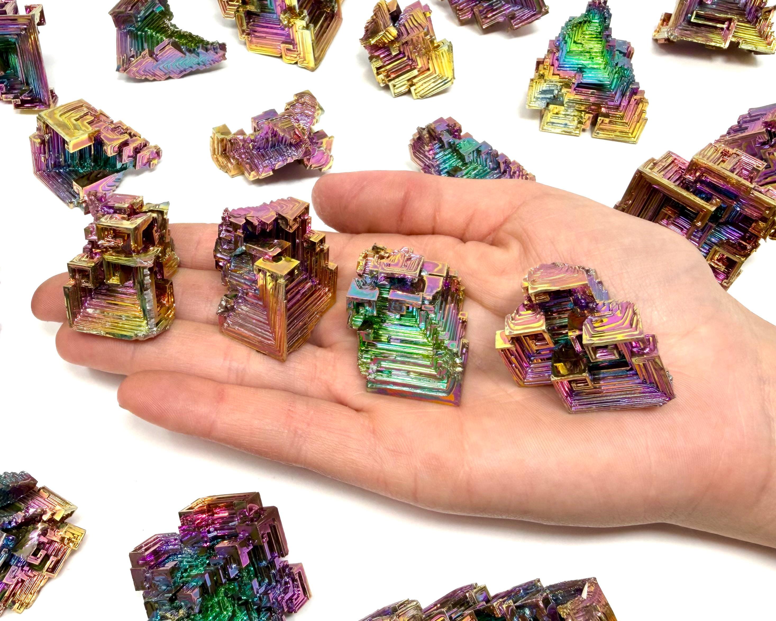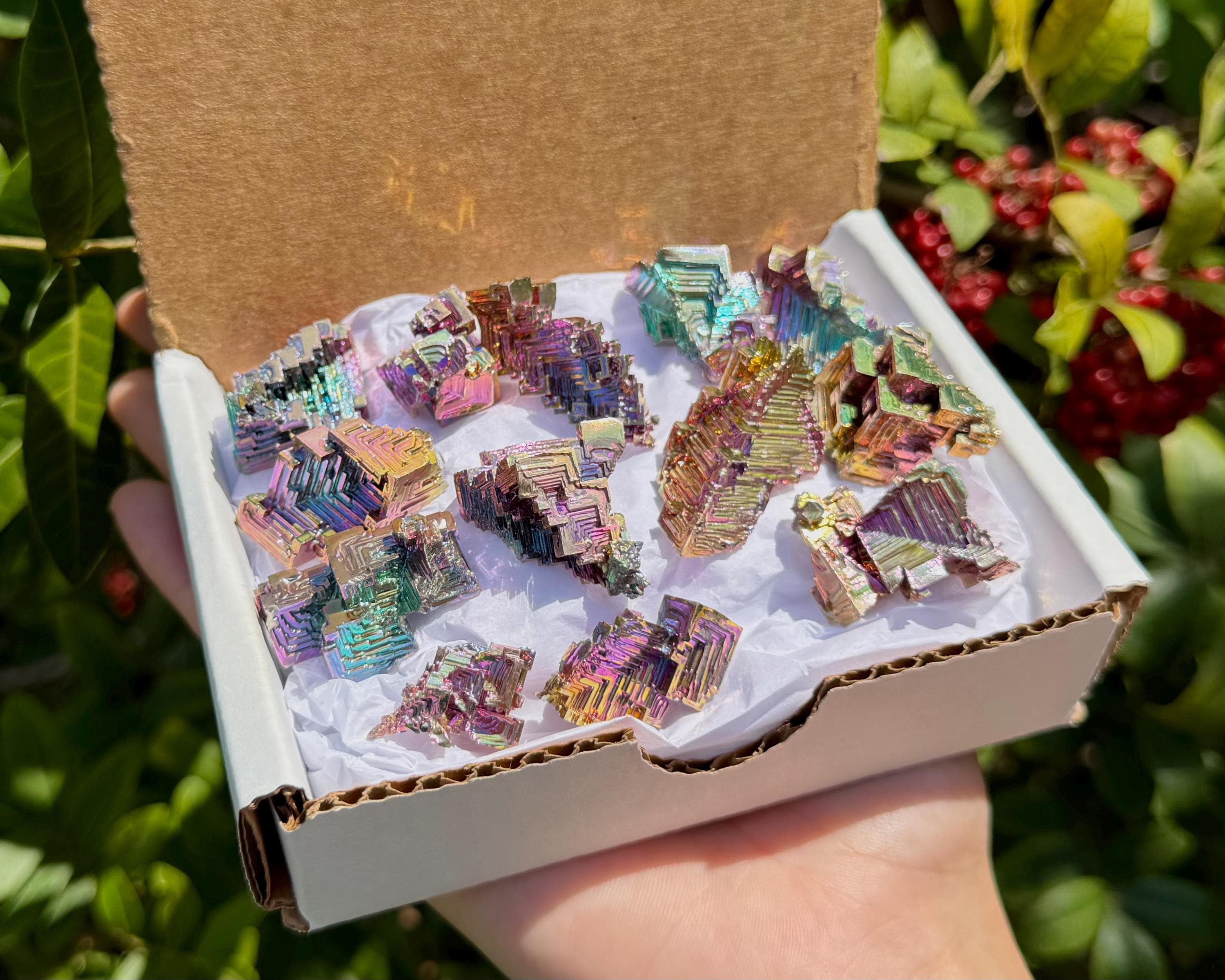 Beautiful small Bismuth Crystals in stunning Organic shapes. Each box with have 10 - 14 individual specimens ranging in size from 0.5 - 1.25" +/-. The total weight of the Bismuth will be approximately 6 ounces.