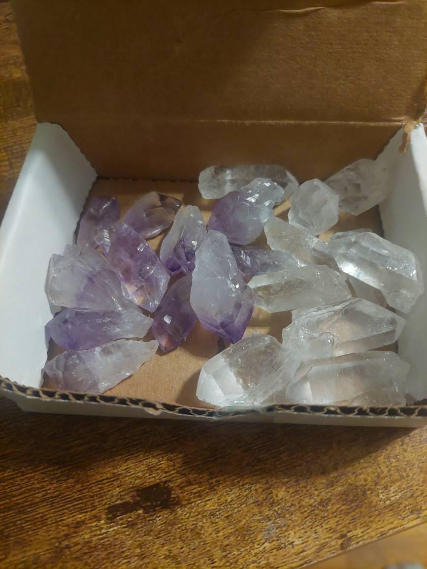 Stunning Amethyst and Clear Quartz Crystal Points - sold in 8 oz (1/2 lb) Box Lots. Box measures 4" x 3" x 1".