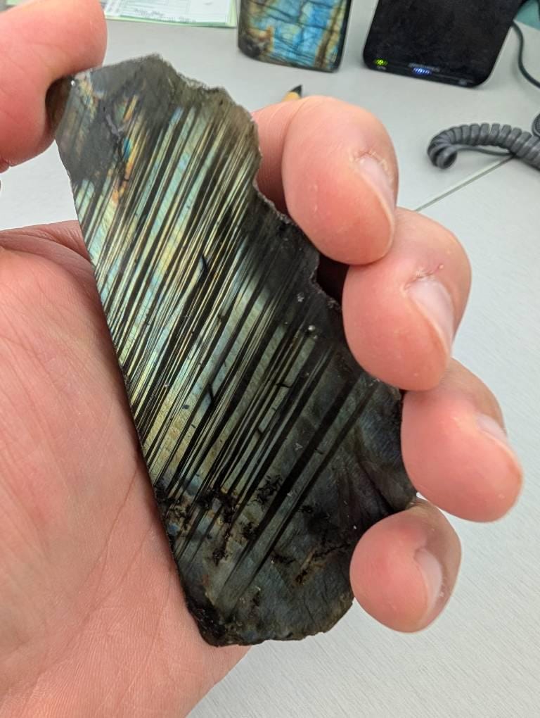 absolutely beautiful slab of labradorite! very flashy, even showing up on the raw side, & 2" exactly on both of the flat edges (i ordered 2-3"). arrived fast & packaged securely!