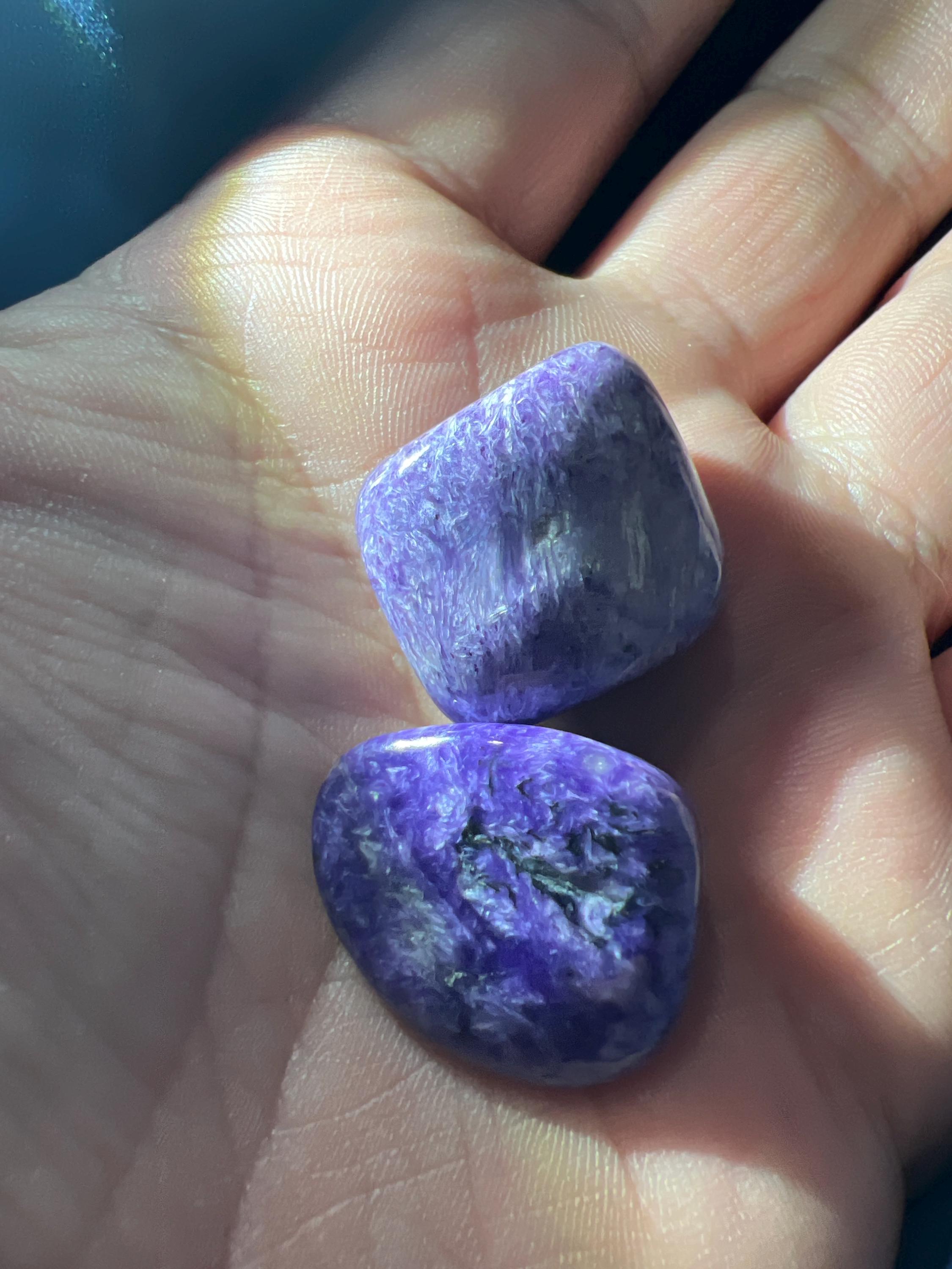Rare Charoite Tumble Stones, Medium, about 3/4" - 1" size from Russia. Wonderful to dispel negative energy, this naturally cleansing stone is perfect for cleansing the aura and for meditation. A must have for any collector.