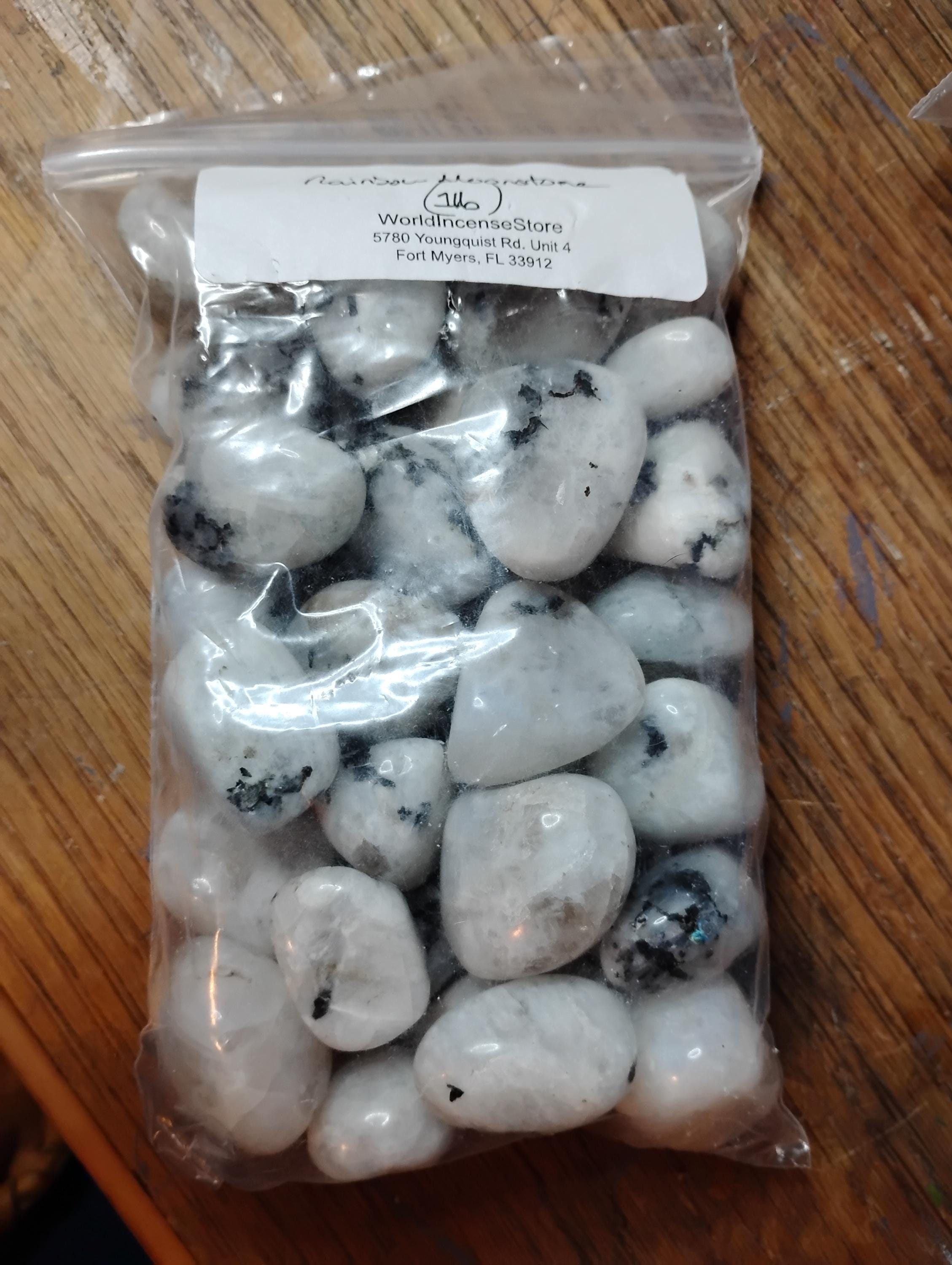 Beautiful Rainbow Moonstone Tumbled Stones, sized about 0.75" - 1". This stone is also known as 'White Labradorite' and is often used in meditation to calm the mind and help the user rediscover their true self. The stone promotes introspection and thus improves judgement making. Your stones will be selected at random from our stock on hand at time of order.