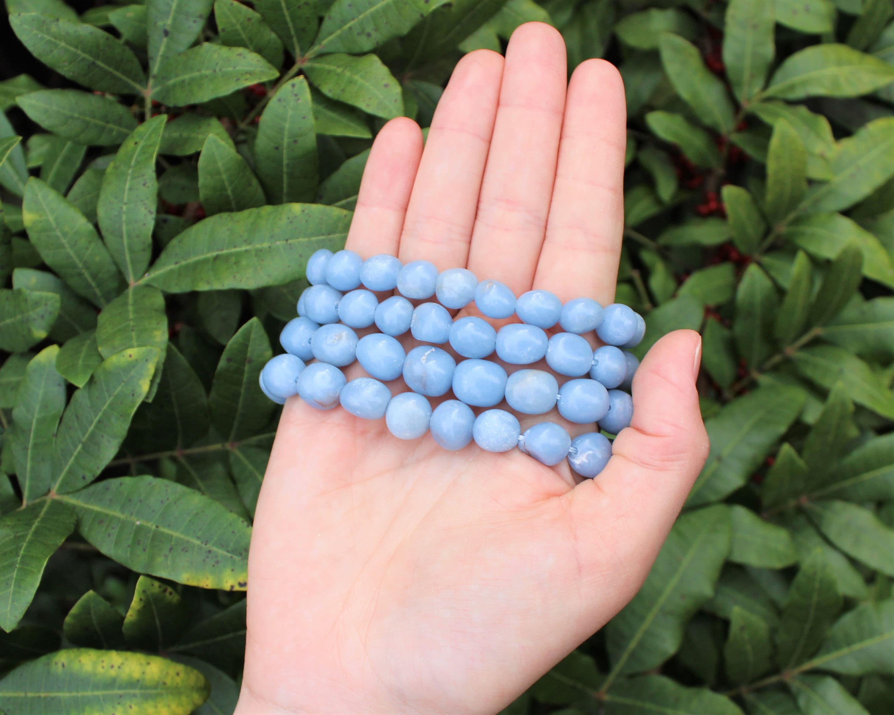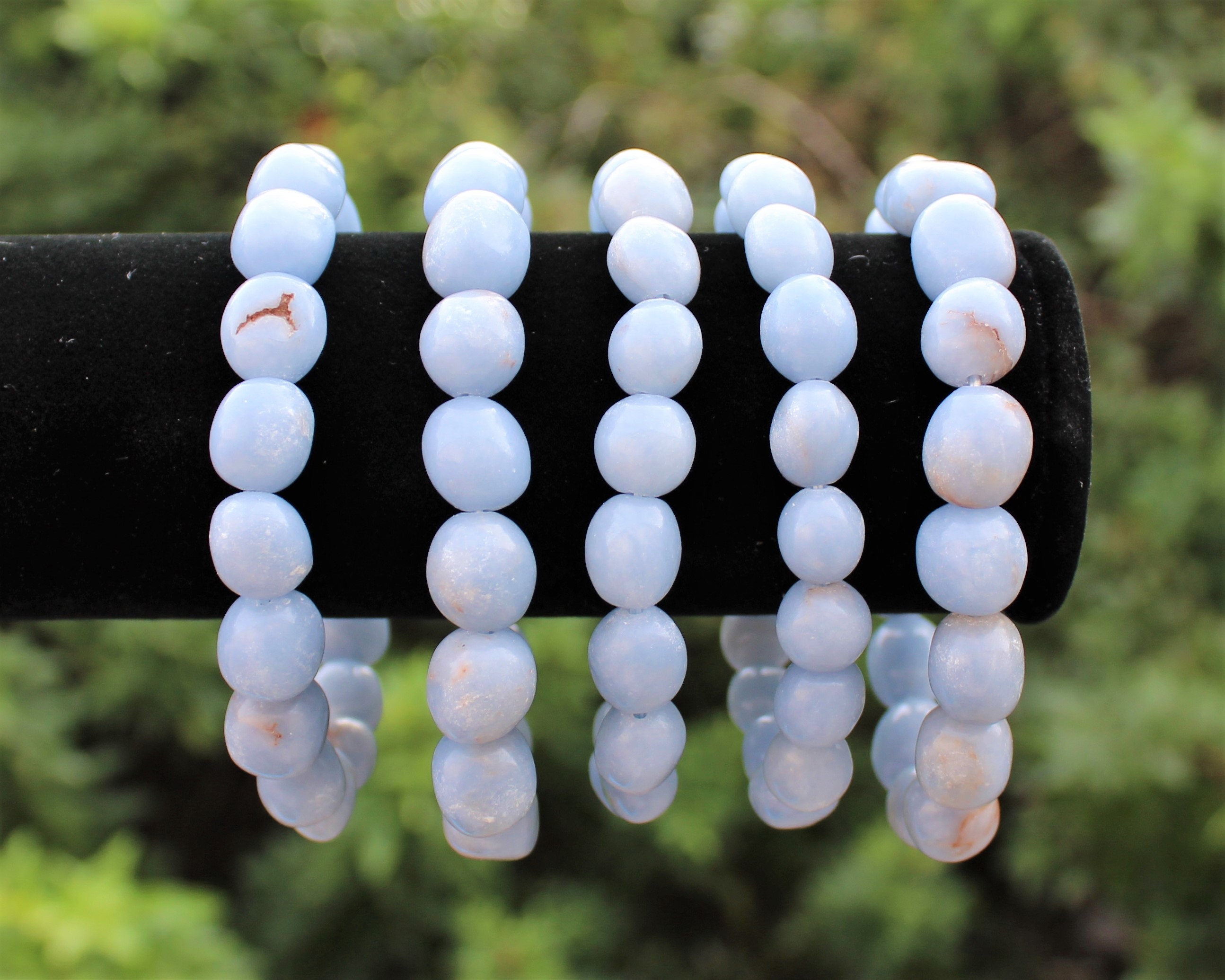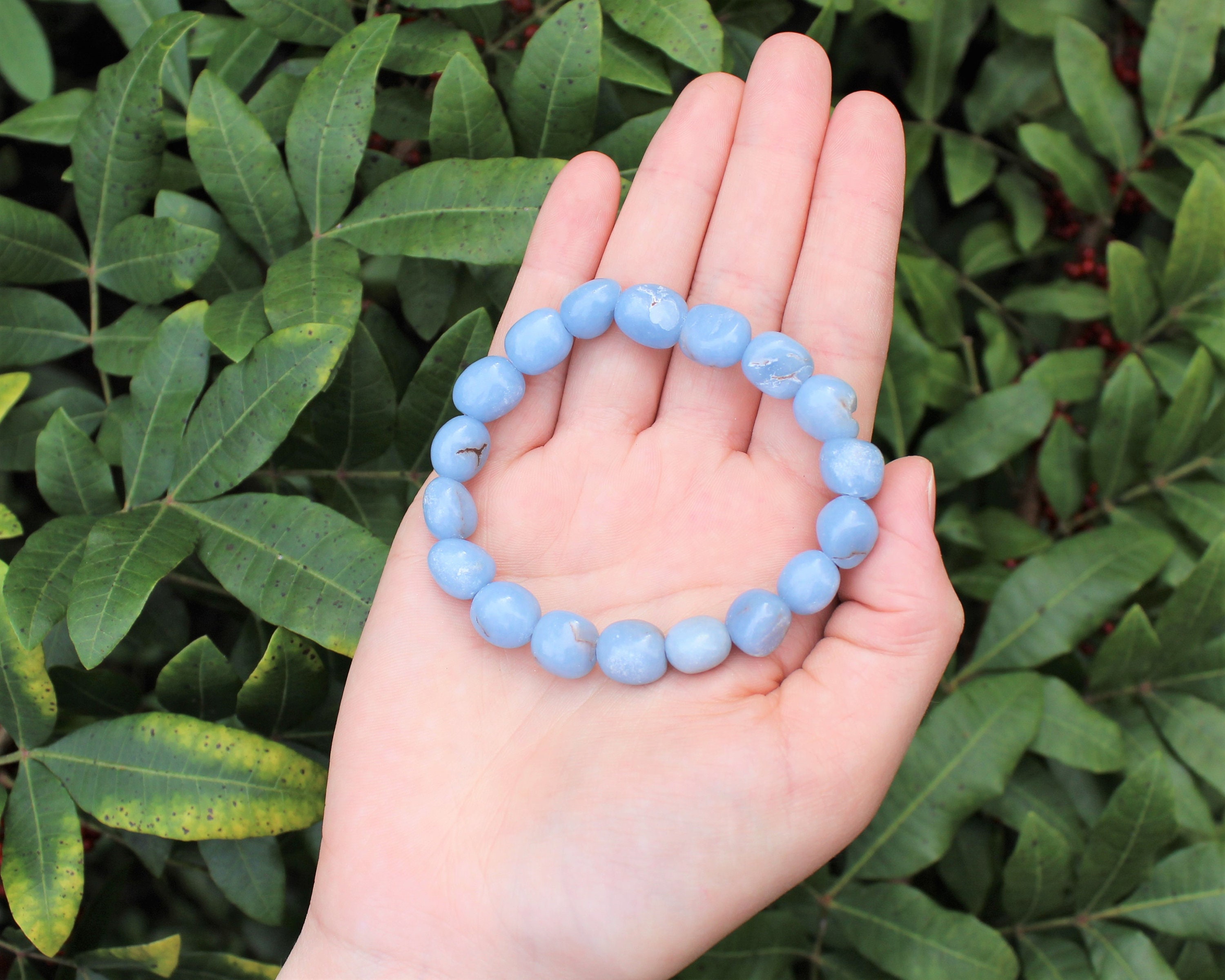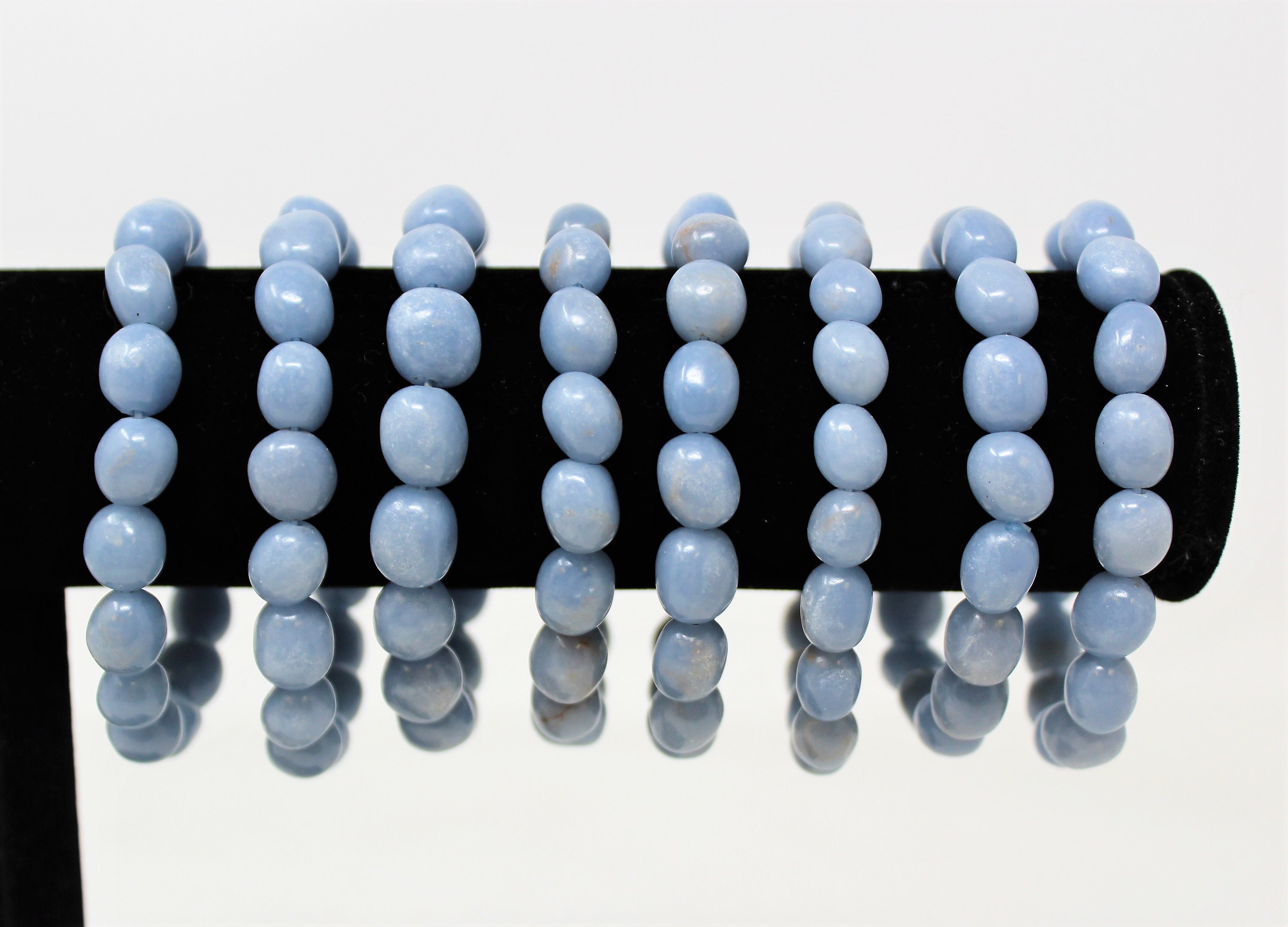 A beautiful bracelet crafted from blue Angelite tumbled stones. 6-8 mm thick nuggets on a stretchable bracelet, fits most wrists. About 7.5" in size. Great for meditation, crystal healing, Reiki or simply wearing!