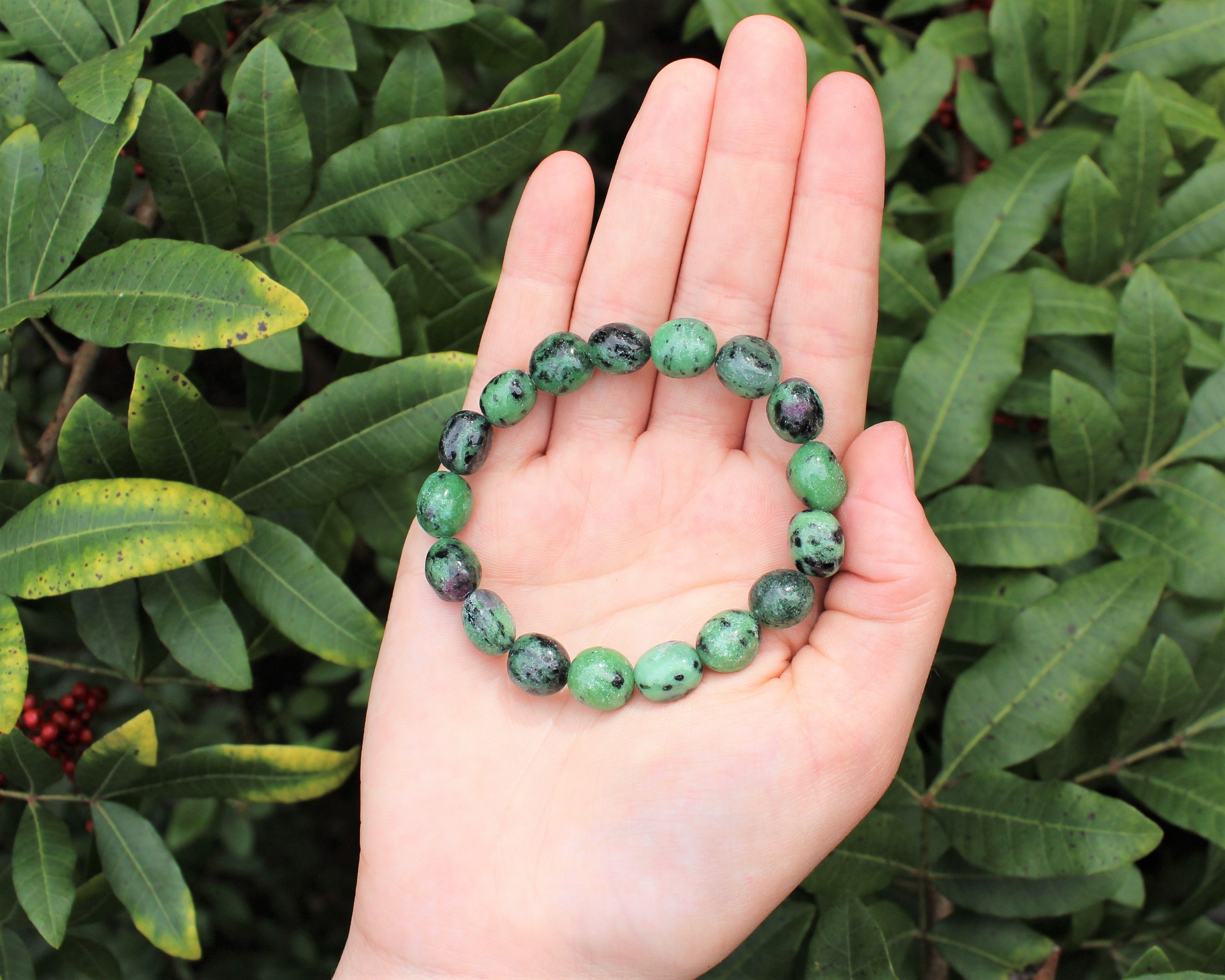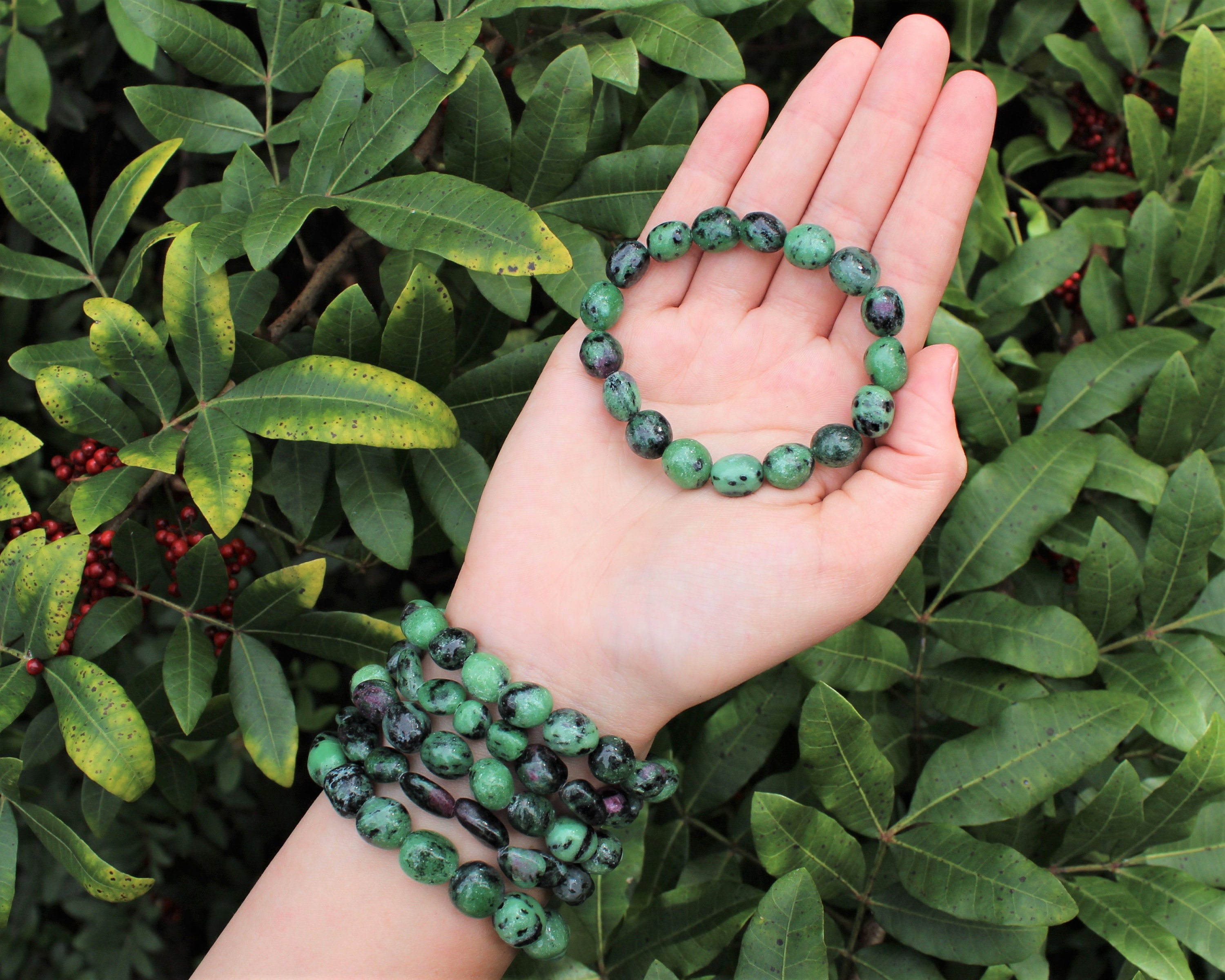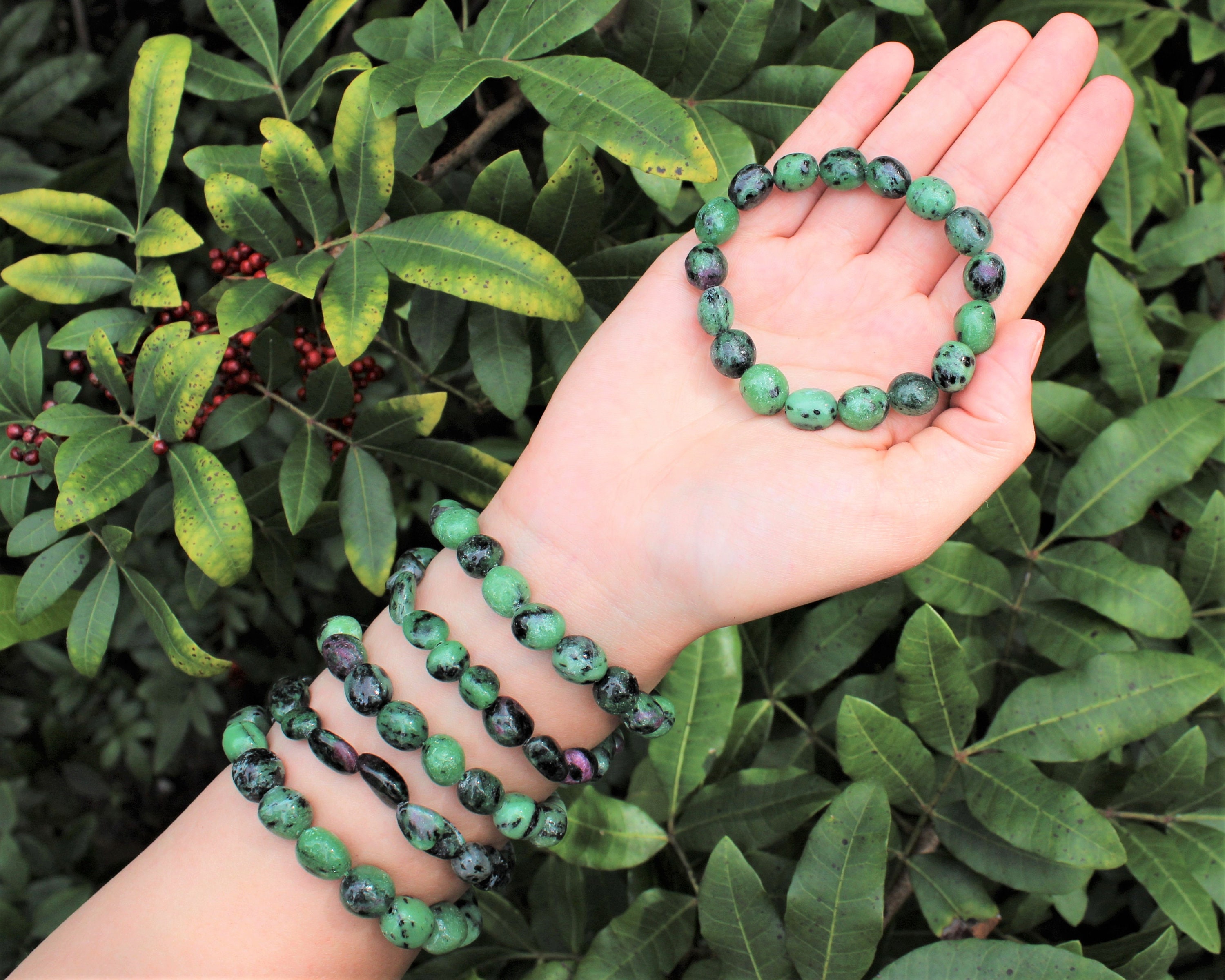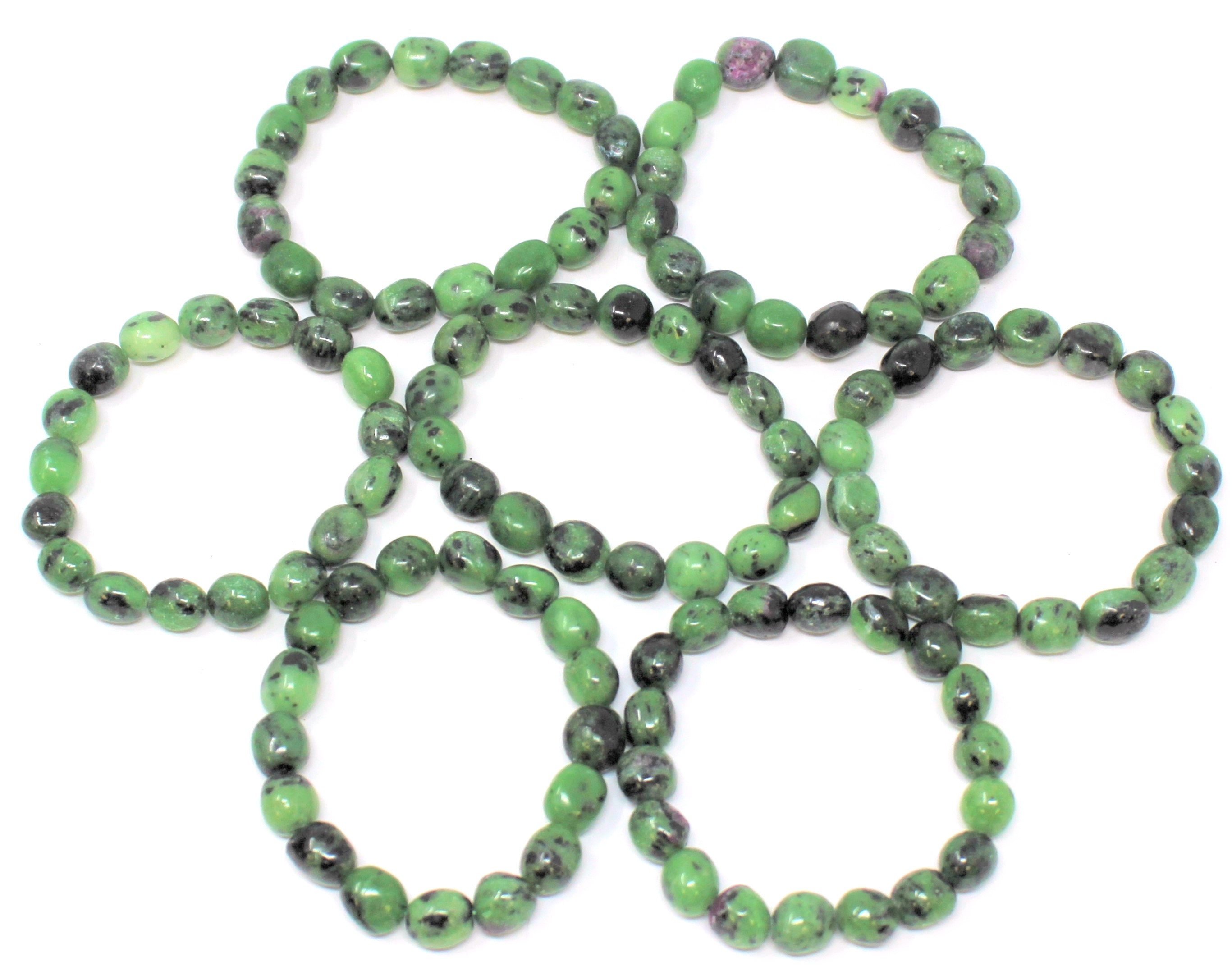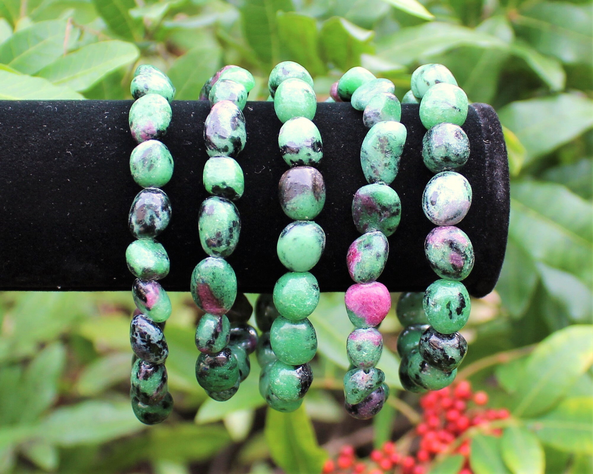 These beautiful green bracelets have flecks of reds, pinks and blacks and are simply gorgeous. Ruby Zoisite is also known as Ruby in Zoisite or Anyolite. Zoisite provides the green color (from the Earth) and the red or pink flecks are from the Ruby. Ruby Zoisite will generally include black patches of Tschermakite also.