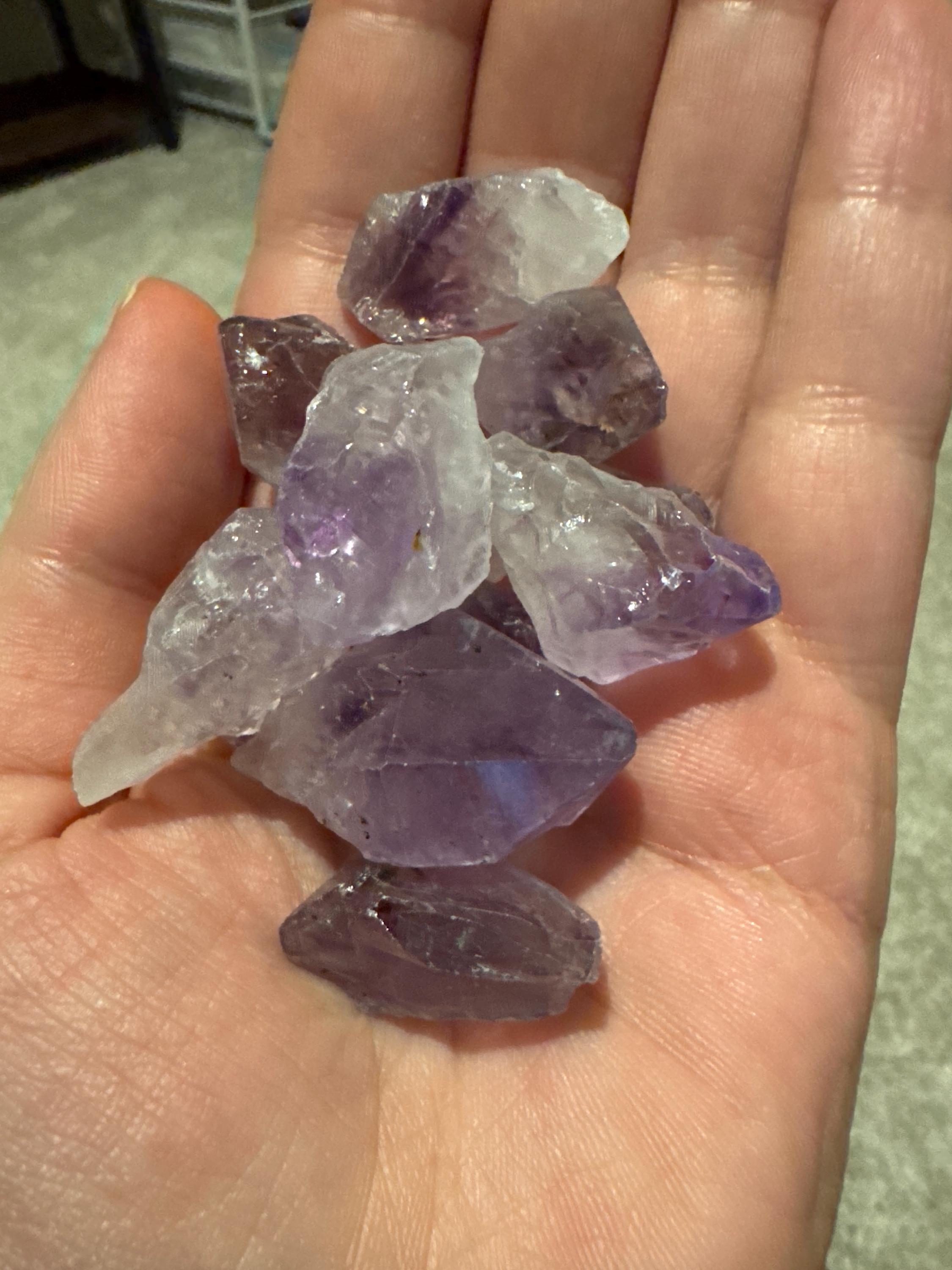 Stunning Amethyst Points from Brazil. Size will vary by piece, but most are in the range of about 0.75" - 1.5" +/-. Many Amethyst Points sold today are just small chunks and shards of rough Amethyst, however these points are genuine high quality crystal points per for Jewelry, crafting and more! Choose size of lot from the drop down menu.