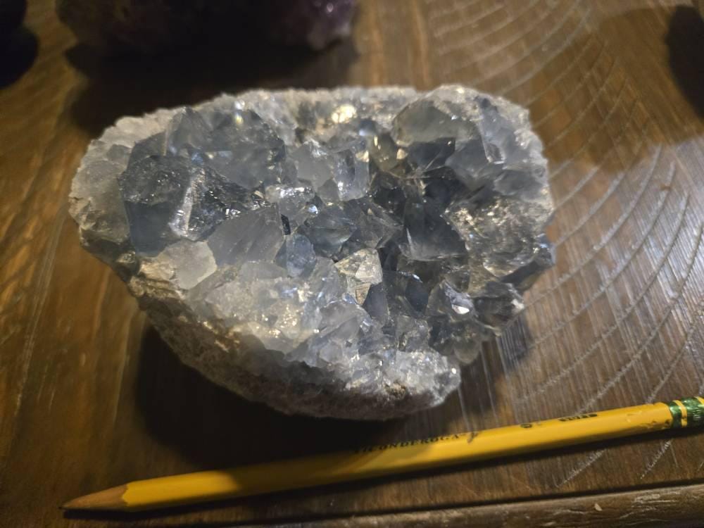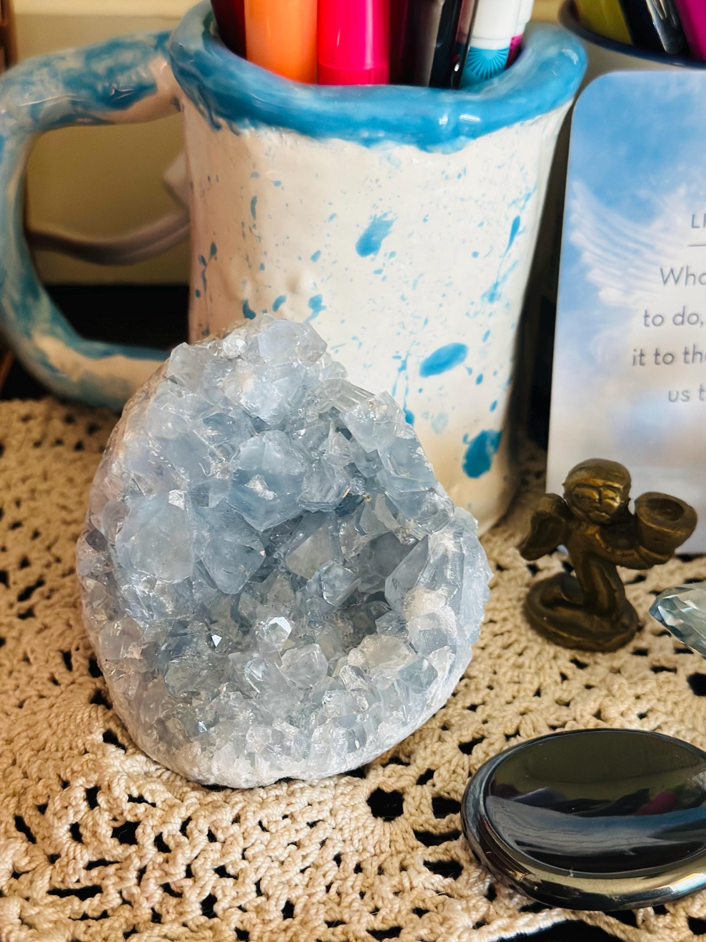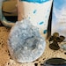 As this is a natural item please allow for a little variance from item to item. Celestite is pretty fragile and may "crumble" a little from time to time. (You may see tiny fragments in the wrapping paper when you receive your geode). Be careful how you handle it and make sure it does not get it wet or soak it in water. If it becomes dusty, spritz it with a spray bottle of plain water and let it air dry.