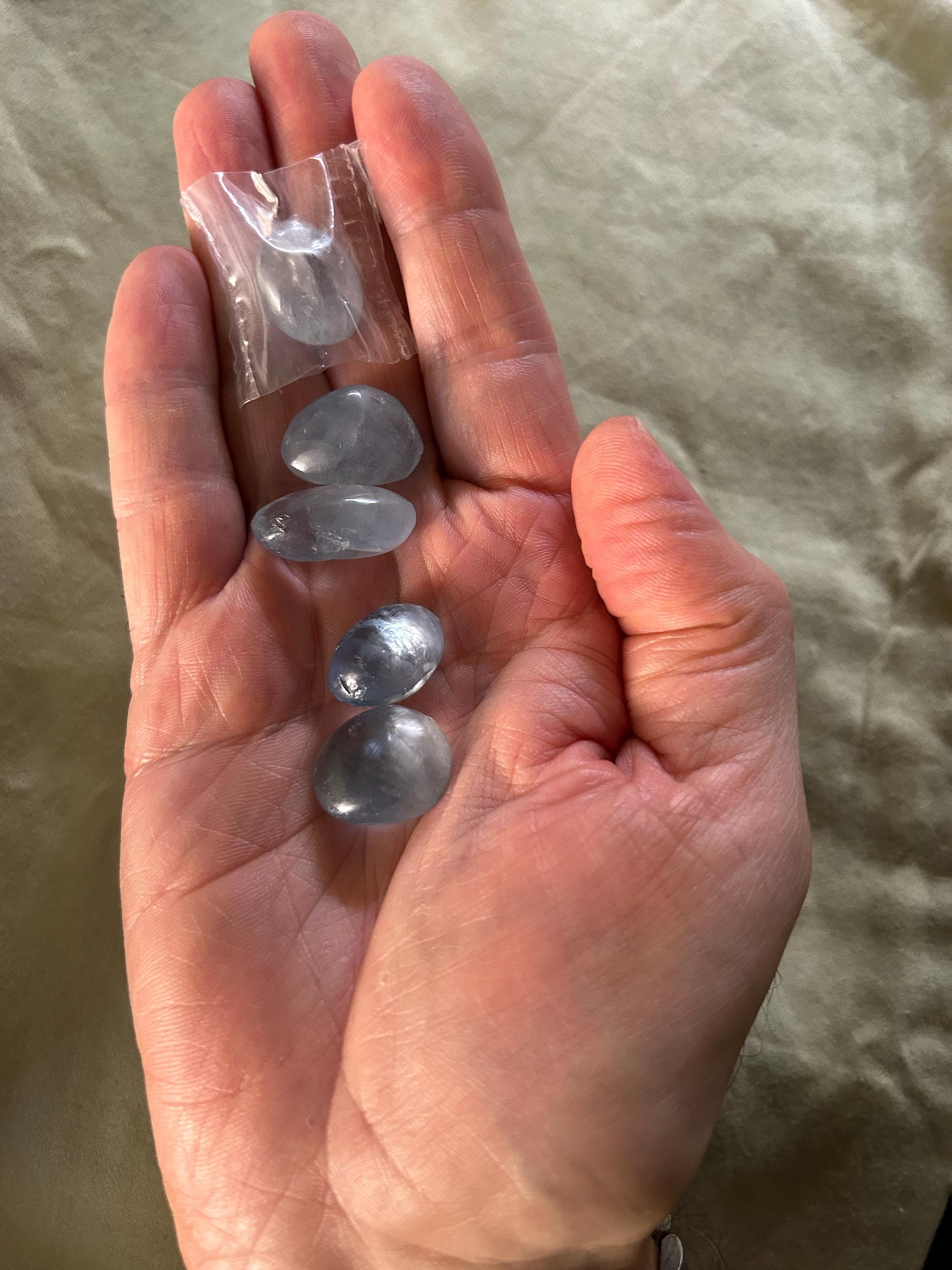 These celestite or celestine tumbles are exquisite! The color is very beautiful. They are small enough to take one along with me in my medicine bag for calming anxiety and as an aid in communication. I got these, however, to help with healing my thyroid and, of course, for lucid dreaming. My first night with them on the night stand did not produce a lucid dream, but gave me a very deep, rested sleep. They came in a long protective plastic sheath like some sort of candy. I left one in the plastic to put in the bag with the other medicine stones for added protection.