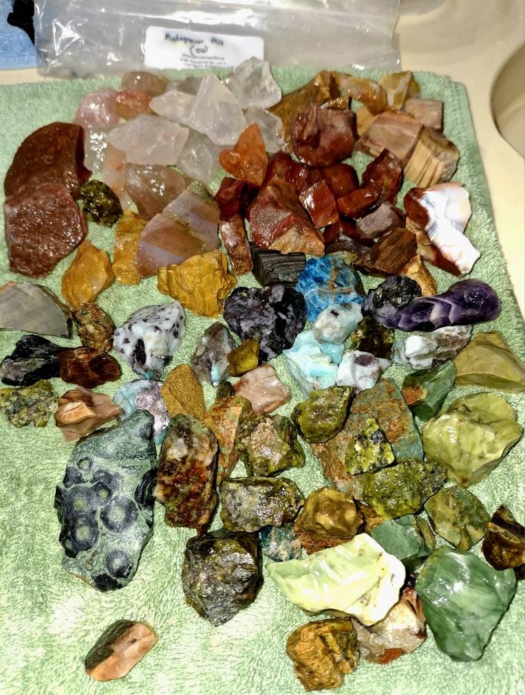Premium Grade Lot of Large Natural Rough Stones from Madagascar, size between about 1" to 2". High quality specimens. This assortment of stones can include Labradorite, Rose Quartz, Septarian, Green Opal, Desert Jasper, Apatite, Amethyst, Petrified Wood, Girasol Opal, Red Jasper, Yellow Jasper & Chrysocolla. Not every lot will include every stone. Lots are selected at random from large containers at time of shipment. As a guide each 3 lb lot will typically contain anywhere from 45 to 60 individual stones - sold by weight, not number of stones. Please be aware that these sets do differ from batch to batch and do not come with any kind of information card or identification service.