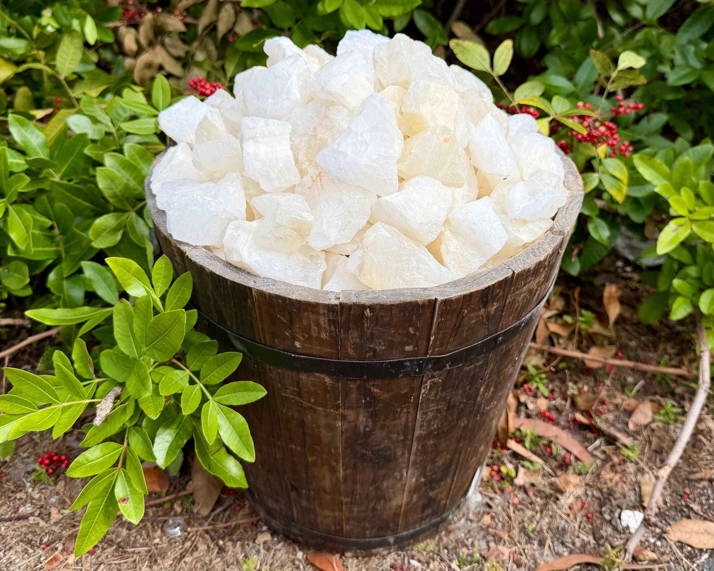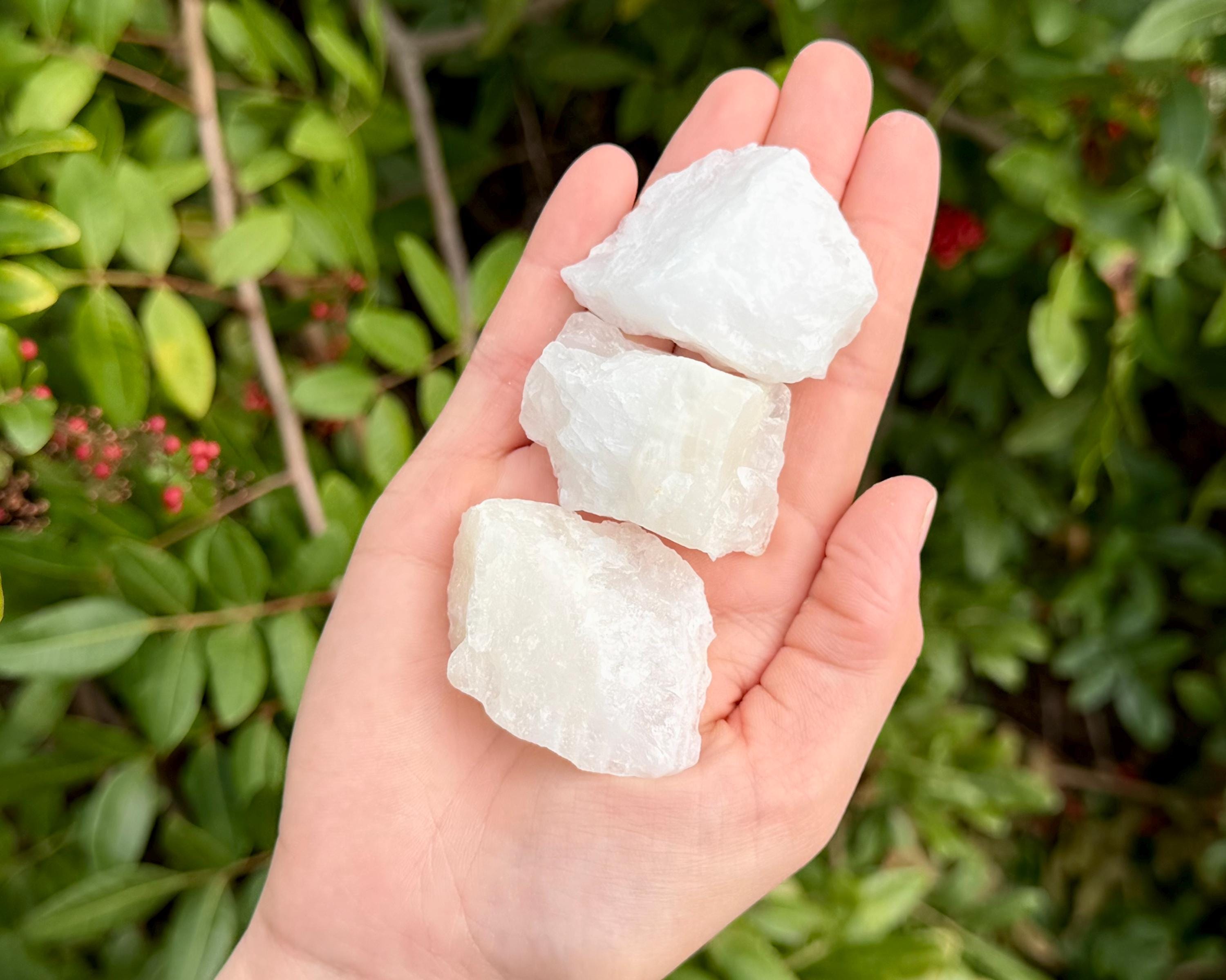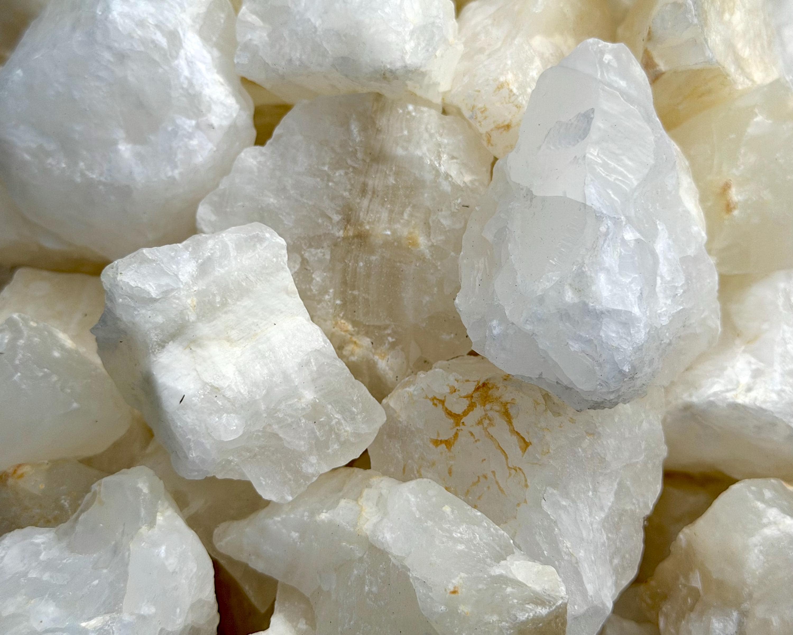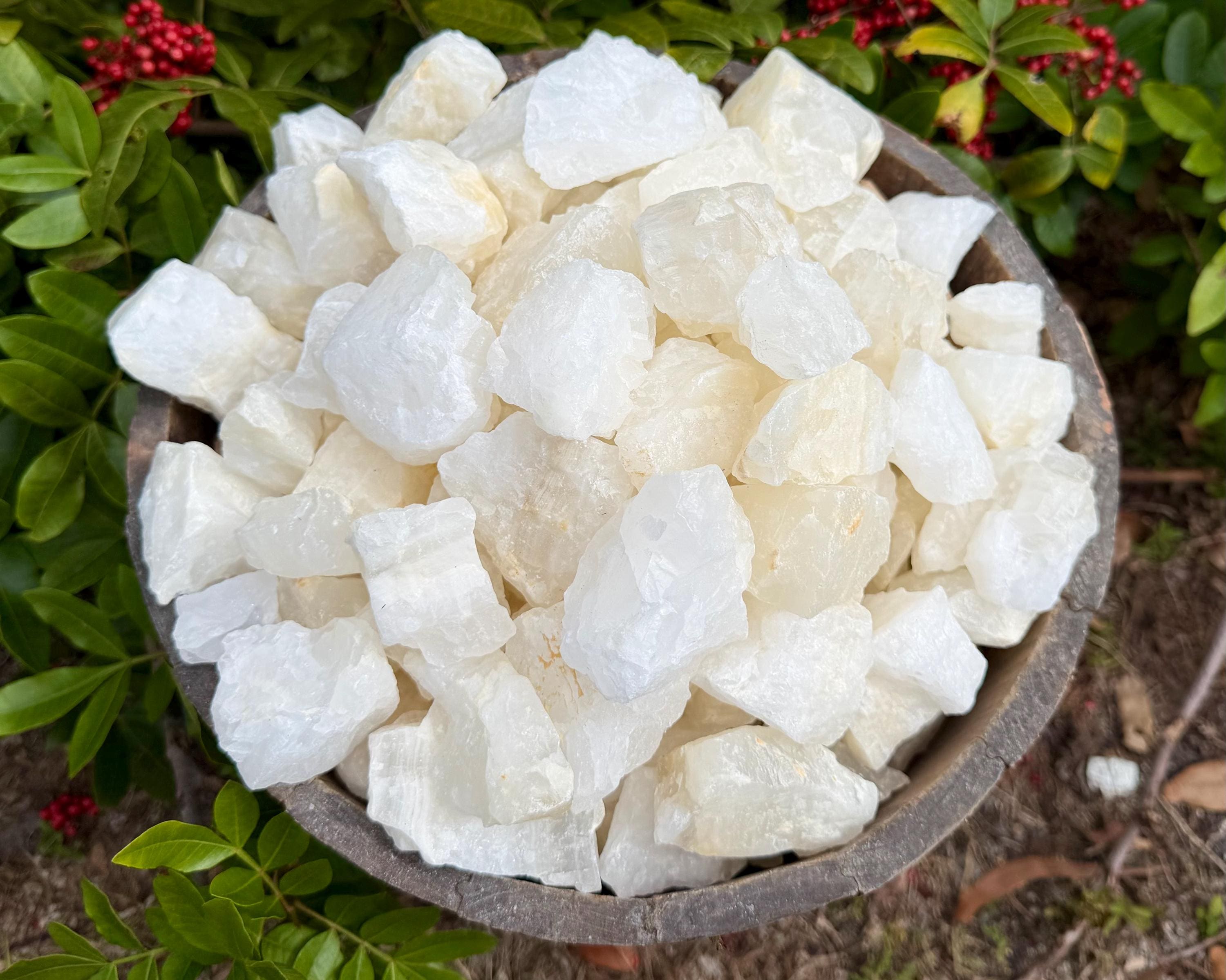 Wholesale Bulk lots of Rough Natural White Calcite. Size range is about 1" to 2.5" +/-. These stones are perfect for tumbling, polishing, cutting, cabbing, teaching, reiki, crystal healing, or keeping in their natural form as a decorative rock!