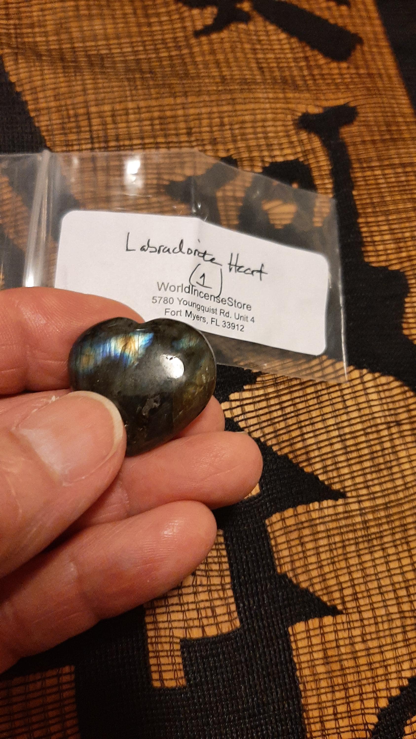 Made from beautiful Labradorite these Hearts measures about 1" +/-, a great size for carrying in the pocket. High quality specimens from Madagascar.
