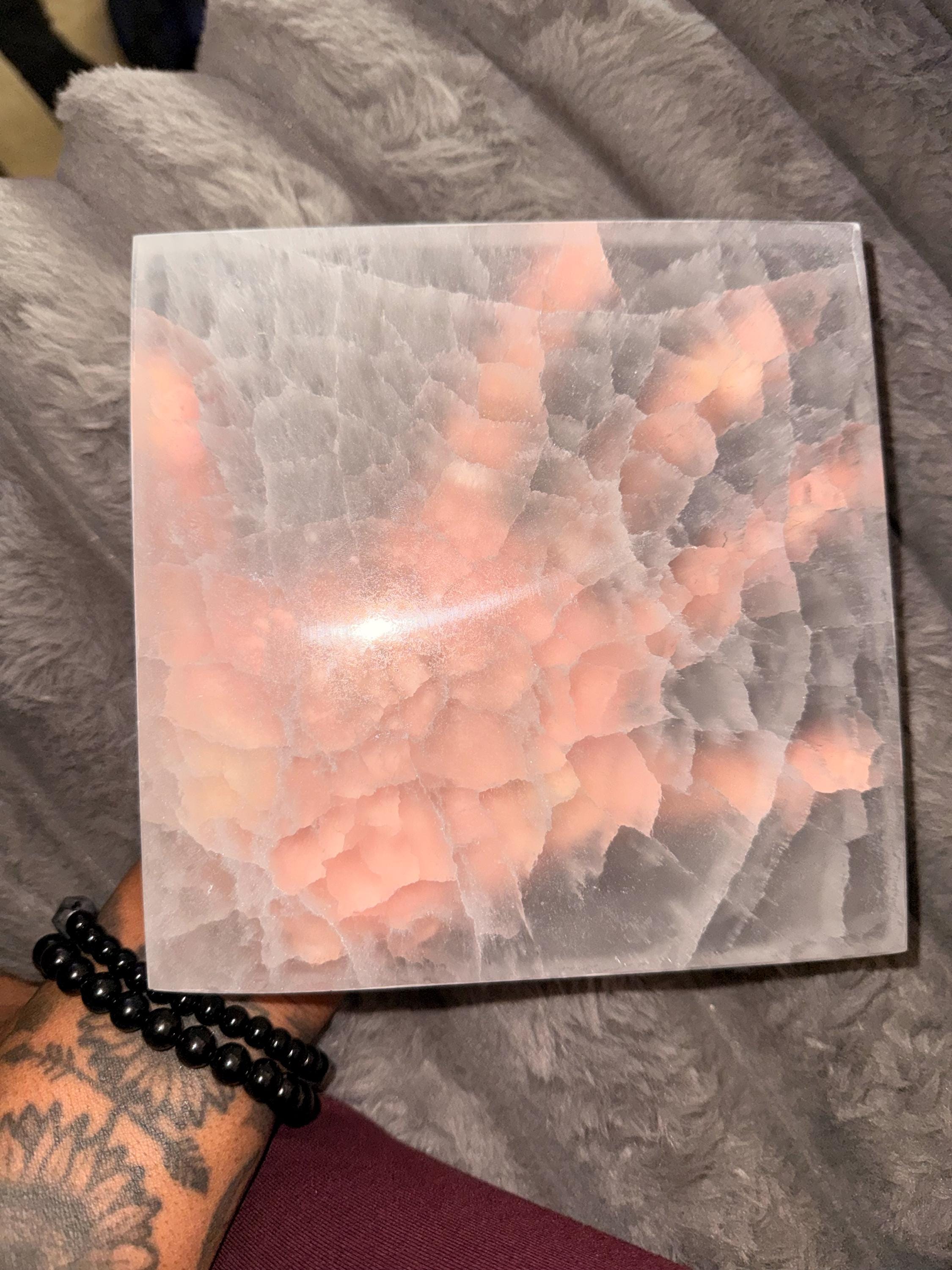 Beautiful 6” square selenite charging plate, definitely as seen in the pictures but way more amazing in person, almost seems bigger in size due to its quality and thickness once in hand. Very thick and has a good sturdy weight to it. Smooth polishing on top and bottom and frosted edge cuts but still smooth. It is see through with stunning internal veins, with no scuffs or scratches. High quality. Would recommend and would buy again.