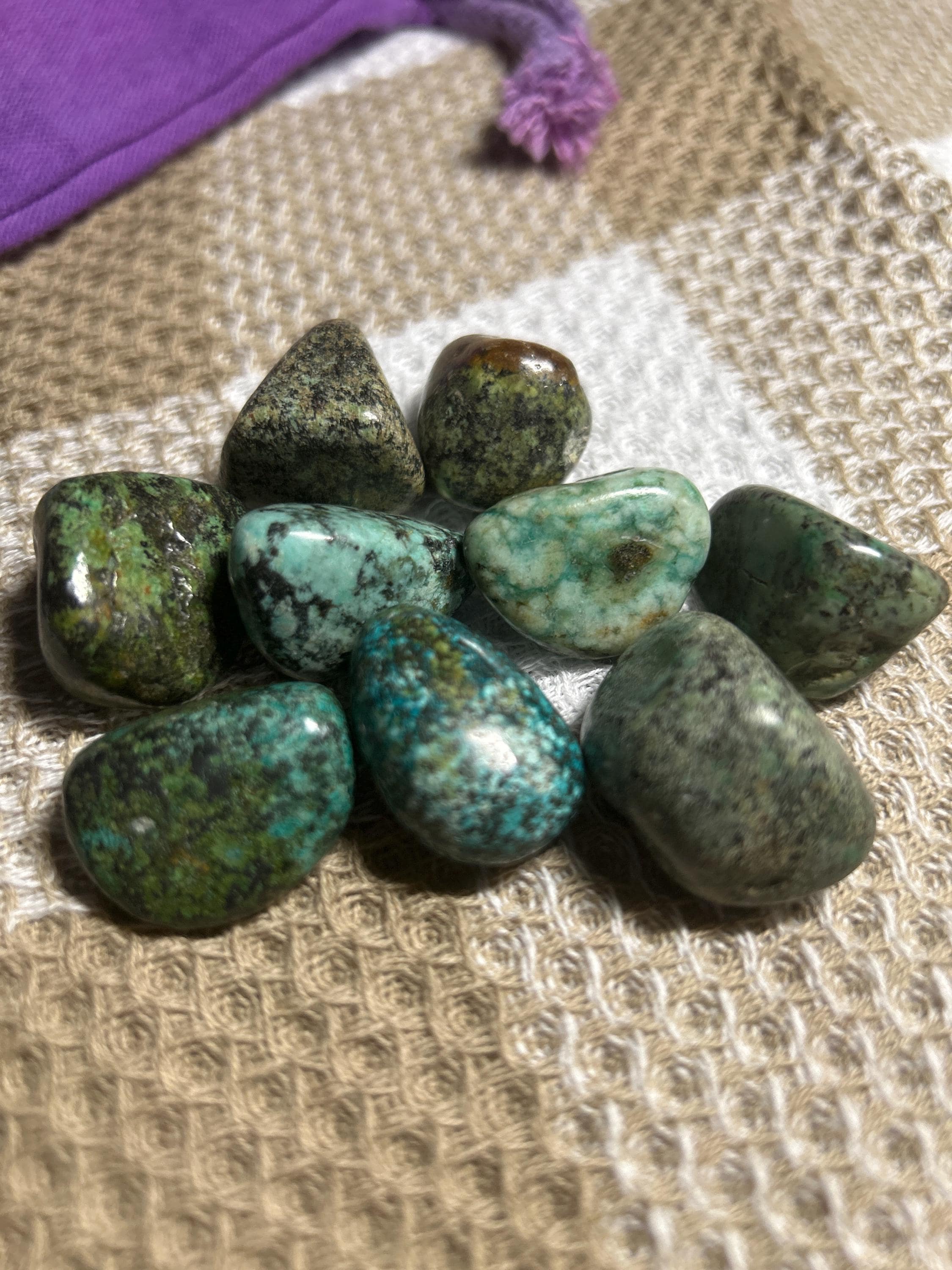 Premium Grade African Turquoise Tumble Stones, medium / large (0.75" - 1"). Found in Africa this stone is actually a form of Jasper. It is associated with bringing about positive change (it is also known as 'The Stone of Evolution') and works with the Third Eye Chakra.