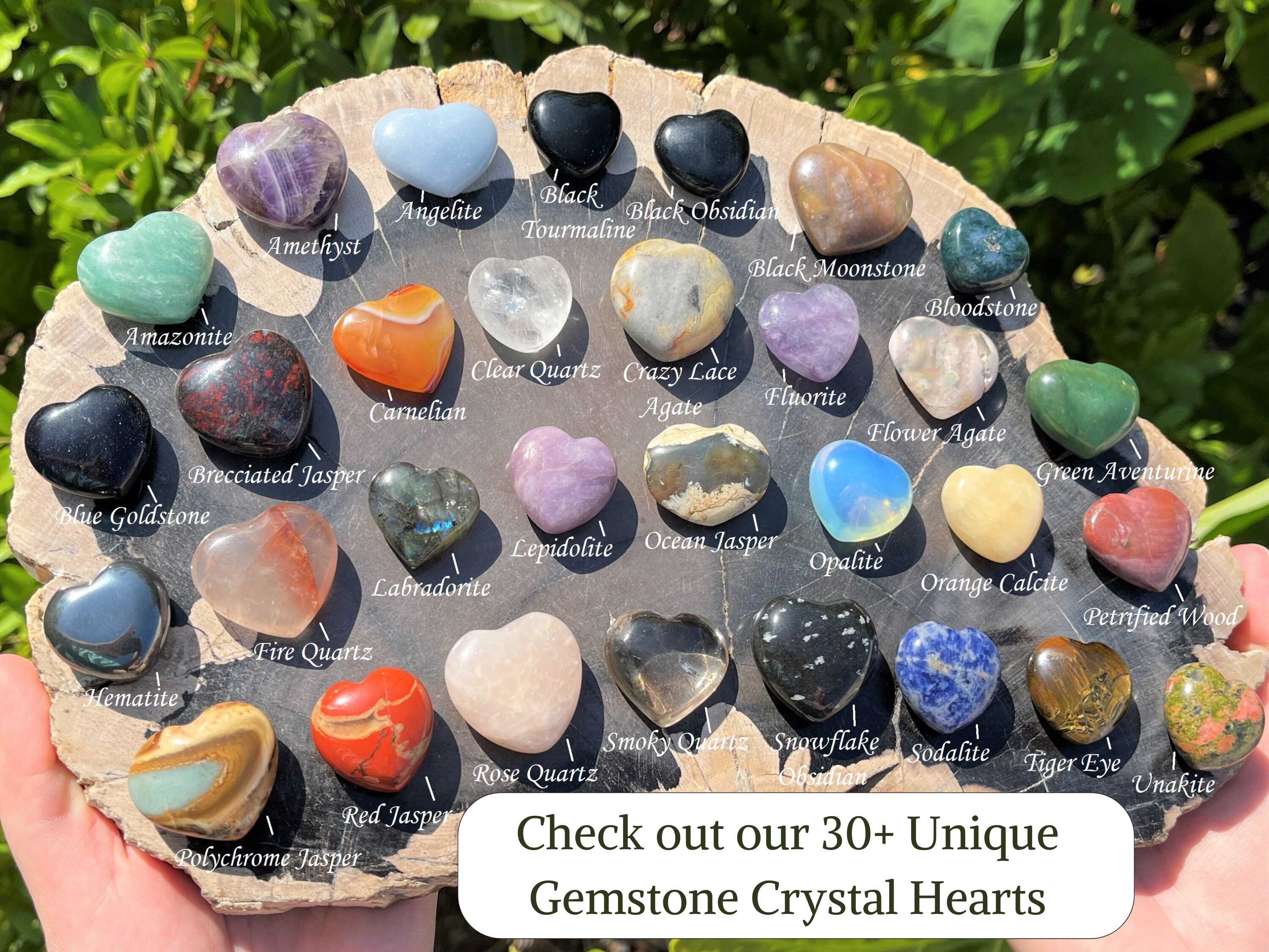 About Crystal Hearts: Crystal Hearts are carved from a very wide range of natural minerals, crystals, and gemstones. We also offer a few types of hearts that are man made (Opalite, Goldstone). They are not only perfect for relationships (old and new!) but also self love. Many keep them at home, work or on oneself to carry throughout the day. Just looking at them and feeling their energy can make you feel better! Crystal hearts help you to focus not only on your emotions but also on your thoughts. Great for both chakra work and meditation, these hearts bring calmness and serenity to any space.