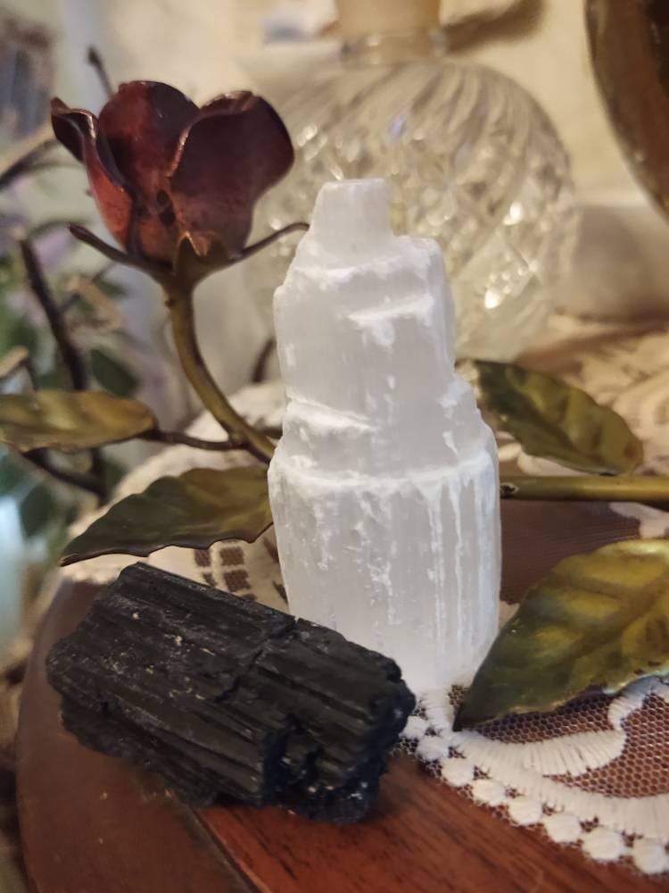 1 White Mini Crystal Selenite Tower / Skyscraper / Iceberg, about 2.3" to 2.5" tall +/- AND 1 piece of 'A' grade 'Extra' quality Rough Black Tourmaline.