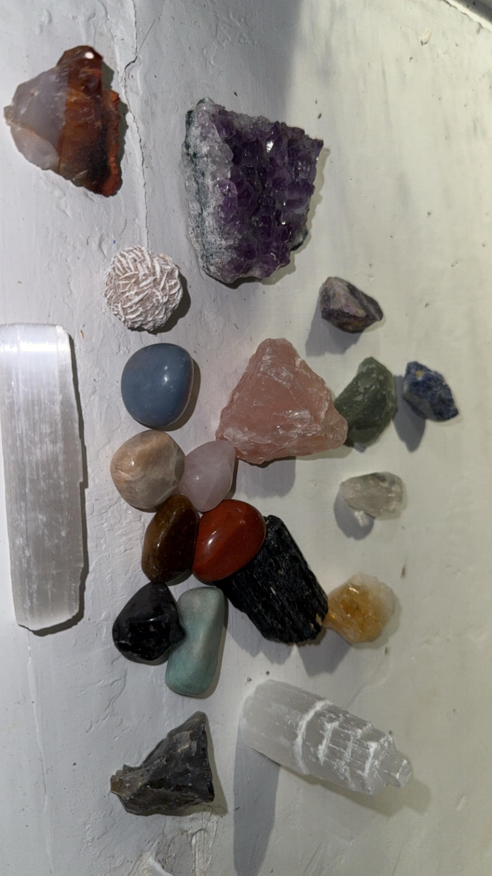 Third, a protection set which can be utilized in several combinations, a Mini Selenite Skyscraper, large piece of Rough Tourmaline, large piece of rough Rose Quartz and a Large Desert Rose. Lastly to round out this kit, a hand selected beautiful Amethyst Geode Specimen. 20 crystals added together for an unbeatable price and the perfect set for Beginners.