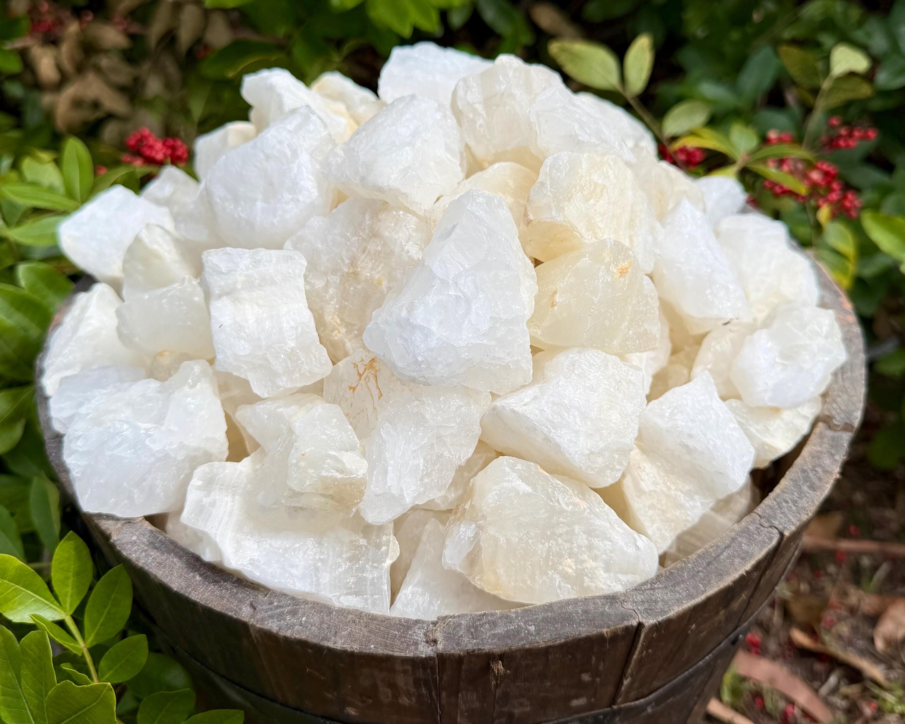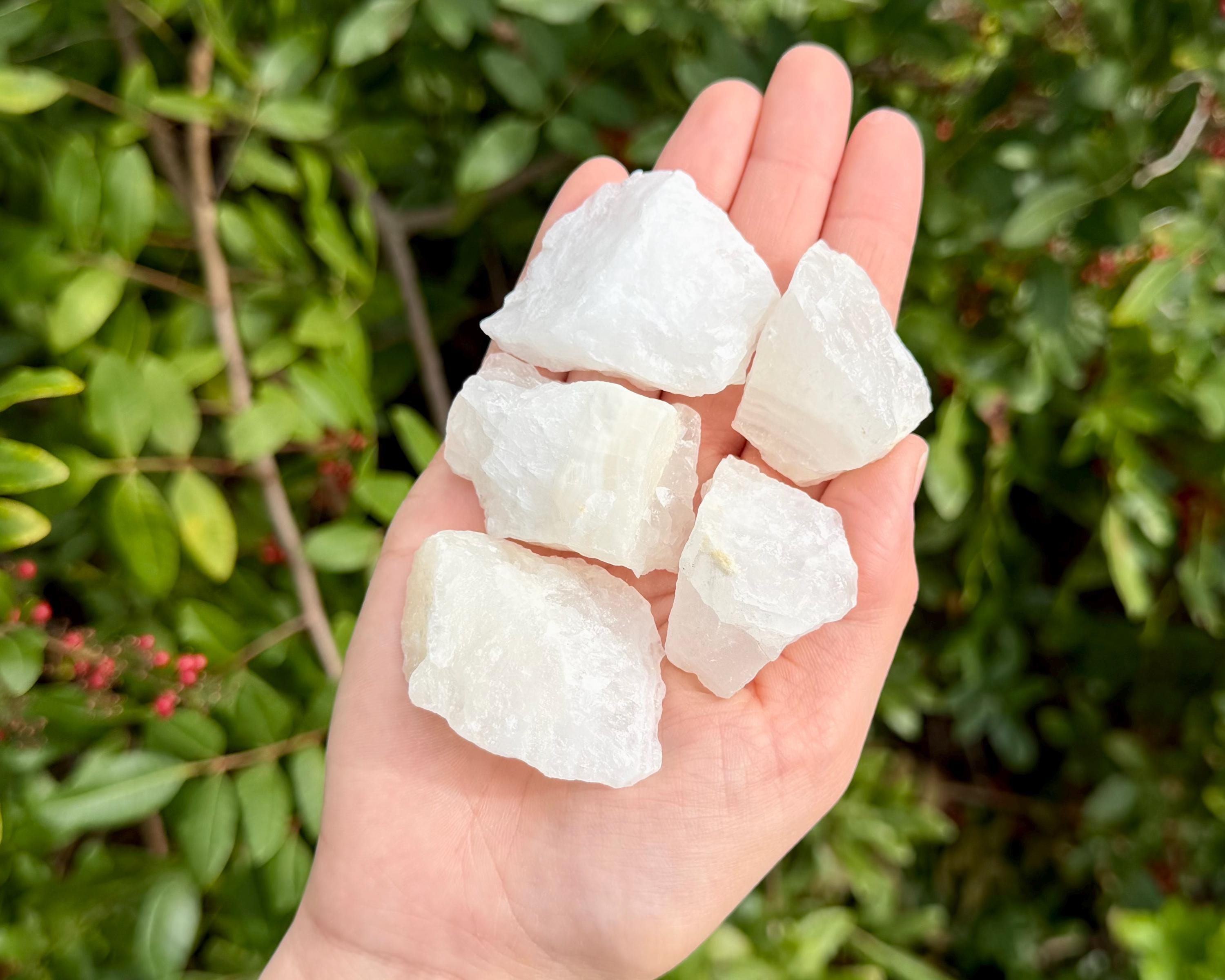 Beautiful Rough Natural White Calcite Crystals, Size range is about 1" to 2.5" +/-. These stones are perfect for tumbling, polishing, cutting, cabbing, teaching, reiki, crystal healing, or keeping in their natural form as a decorative rock!