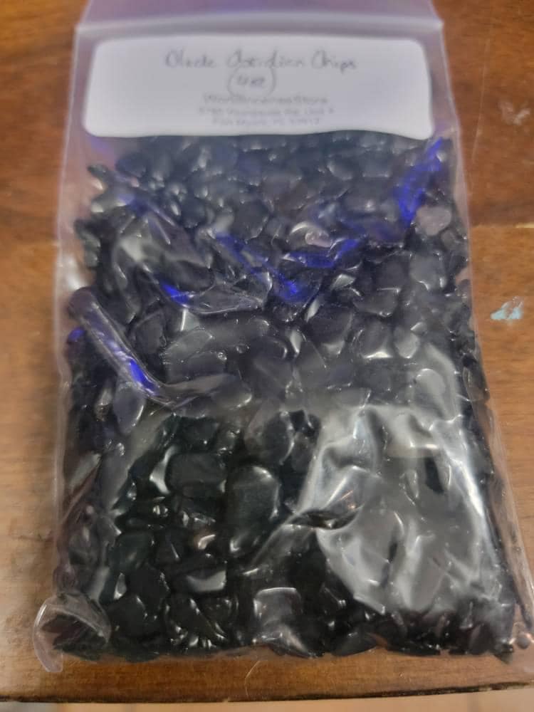 Loose Black Obsidian chips assorted sizes and shapes as pictured. Assorted sizes, mostly in the range of 5 - 10 mm (about 0.25" - 0.35"). They are great not just for decoration but for all types of craft and art projects, etc. Semi rough tumbled mini chip stones, undrilled.